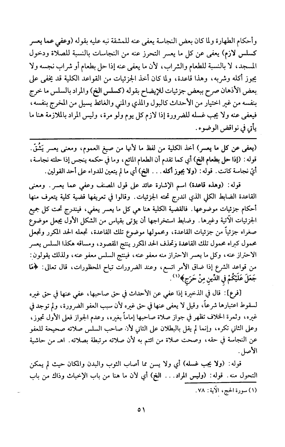 قوله : ( وهذه قاعدة ) : اسم الإشارة عائد على قول المصنف : ( وعفى عما يعسر ) . ومعنى القاعدة الضابط الكلى الذي اندرج تحته الجزئيات ، وقالوا فى تعريفها : قضية كلية يتعرف منها أحكام جزئيات موضوعها ، فالقضية الكلية هنا هي : ( كل ما يعسر يعفى عنه ) . فيندرج تحت ( كل ) جميع الجزئيات الآتية وغيرها . وضابط استخراجها أن يؤتى بقياس من الشكل الأول يجعل موضوع صغراه جزئياً من جزئيات القاعدة ، ومحمولها موضوع تلك القاعدة وتجعله الحد المكرر ، وتجعل محمول كبراه محمول تلك القاعدة ، وتحذف الحد المكرر ينتج المقصود ومساقه هكذا : السلس يعسر الاحتراز منه ، وكل ما يعسر الاحتراز منه معفو عنه ، فينتج : السلس معفو عنه . ولذلك يقولون : من قواعد الشرع ( إذا ضاق الأمر اتسع ) ، ( وعند الضرورات تباح المحظورات ) . قال تعالى : { ما جعل عليكم فى الدين من حرج } .