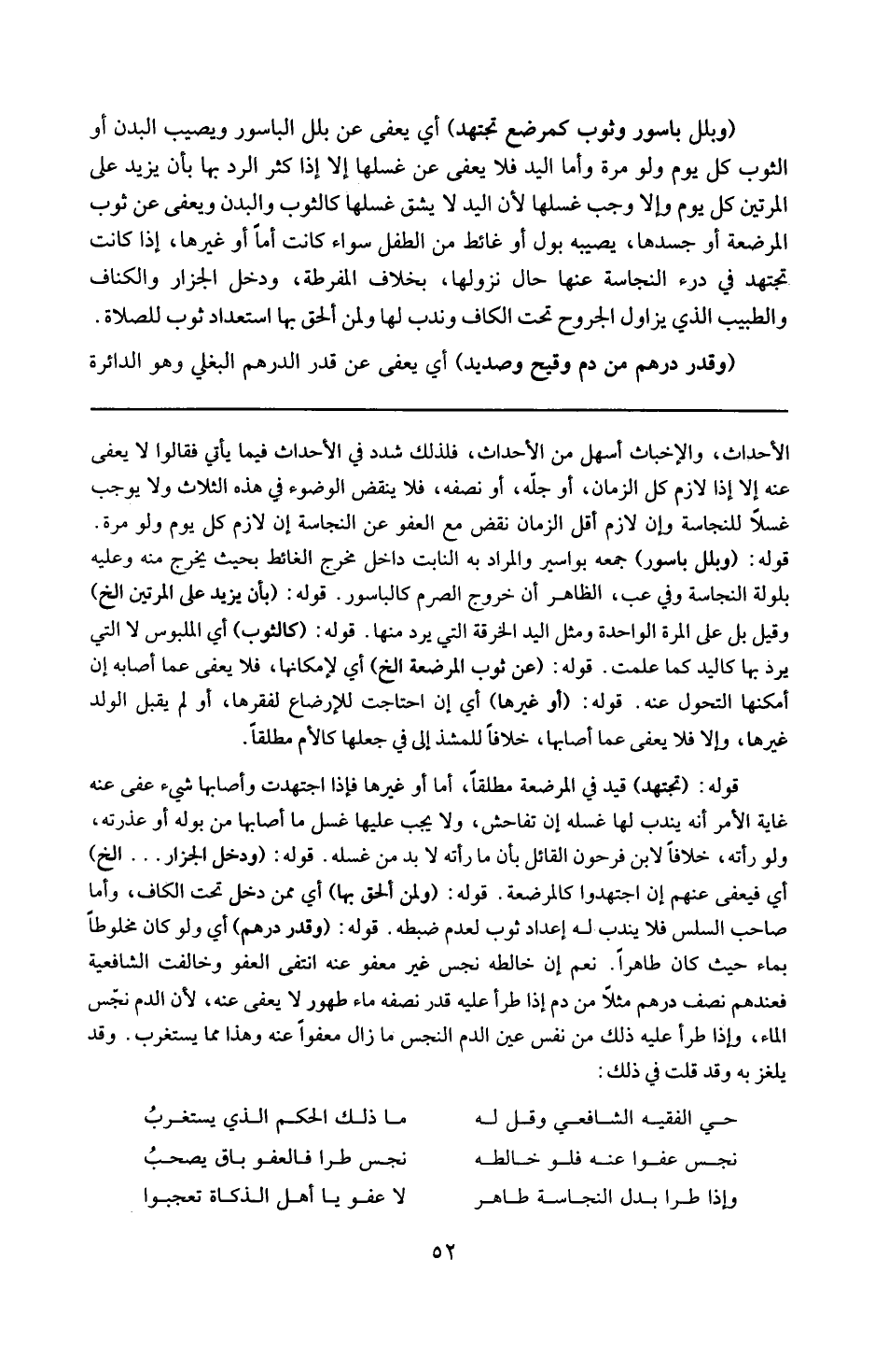 قوله : 16 ( تجتهد ) قيد فى المرضعة مطلقاً أما أو غيرها ، فإذا اجتهدت وأصابها شيء عفى عنه ، غاية الأمر أنه يندب لها غسله إن تفاحش ، ولا يجب عليها غسل ما أصابها من بوله أو عذرته ولو رأته ، خلافاً لابن فرحون القائل بأن ما رأته لابد من غسله .