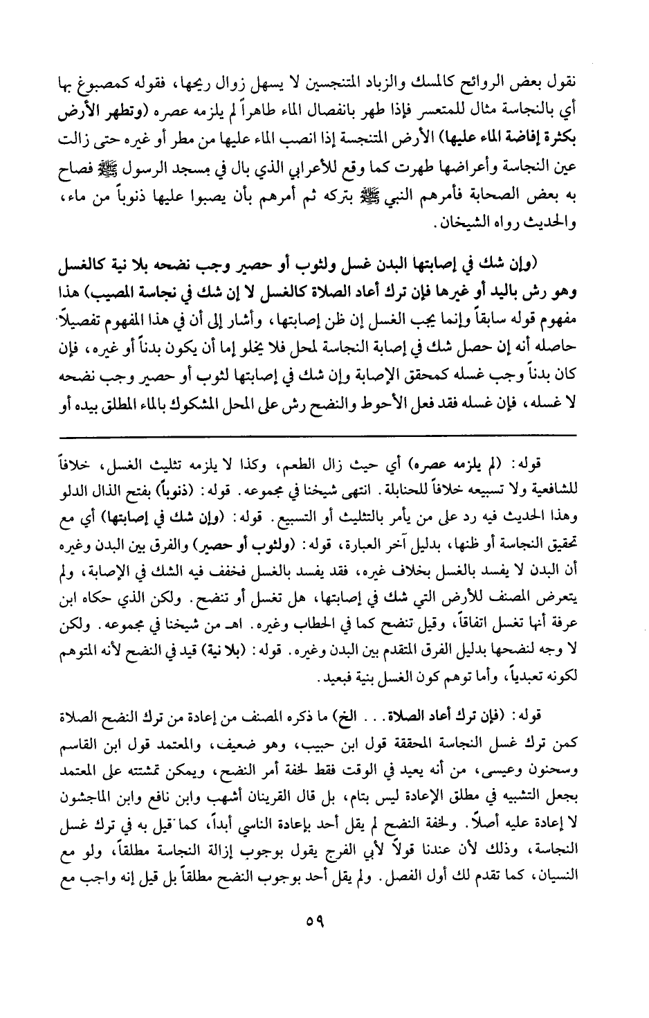 قوله : 16 ( ولثوب أو حصير ) : والفرق بين البدن وغيره ، أن البدن لايفسد بالغسل ، بخلاف غيره فقد يفسد بالغسل ، فخفف فيه عند الشك فى الإصابة . ولم يتعرض المصنف للأرض التى شك فى إصابتها ، هل تغسل أو تنضح ؟ ولكن الذى حكاه ابن عرفة : أنها تغسل اتفاقاً . وقيل تنضح كما فى الحطاب وغيره 16 ( اه من شيخنا فى مجموعه ) . ولكن لا وجه لنضحها بدليل الفرق المتقدم بين البدن وغيره .