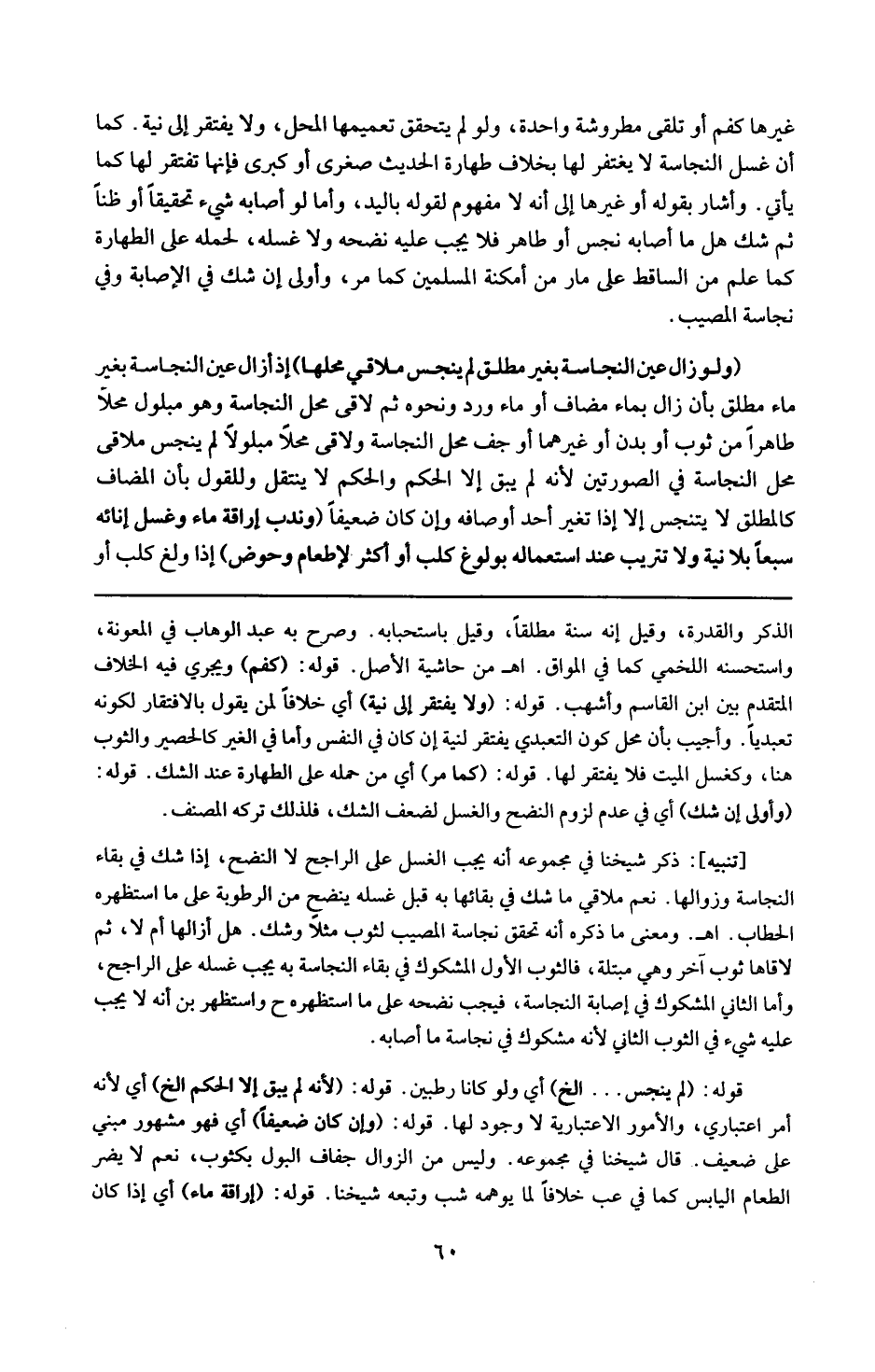 تنبيه : ذكر شيخنا فى مجموعه أنه يجب الغسل على الراجح لا النضح إذا شُك فى بقاء النجاسة وزوالها ، نعم ملاقى ماشك فى بقائها به قبل غسله ينضح من الرطوبة على ما استظهره الحطاب 16 ( ا هـ ) . ومعنى ما ذكره أنه تحقق نجاسة المصيب لثوب مثلا وشك هل أزالها أم لا ، ثم لاقاها ثوب آخر وهى مبتلة ، فالثوب الأول المشكوك في بقاء النجاسة به يجب غسله على الراجح ، وأما الثانى المشكوك في إصابة النجاسة فيجب نضحه على ما استظهره 16 ( ح ) . واستظهر 16 ( بن ) أنه لايجب عليه شيء فى الثوب الثانى لأنه مشكوك في نجاسة ما أصابه .