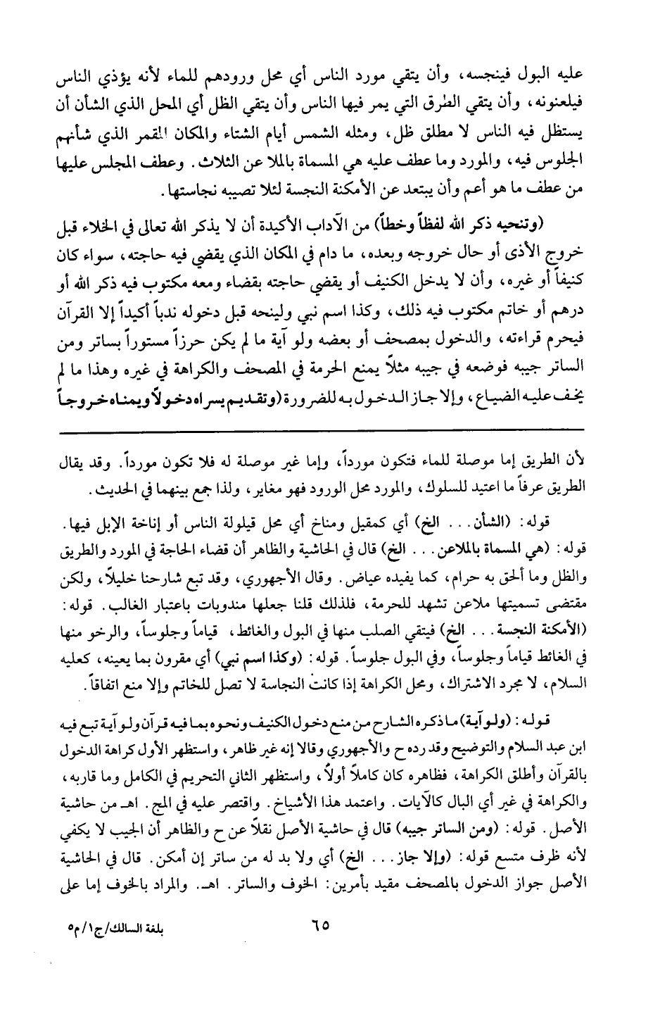 قوله : 16 ( هى المسماة بالملاعن ) إلخ : قال فى الحاشية : والظاهر أن قضاء الحاجة فى الموارد والطريق والظل وما ألحق به حرام كما يفيده عياض . وقاله الأجهورى وقد تبع شارحنا خليلا . ولكن مقتضى تسميتها ملاعن تشهد للحرمة . فلذلك قلنا : جعلها مندوبات ، باعتبار الغالب .