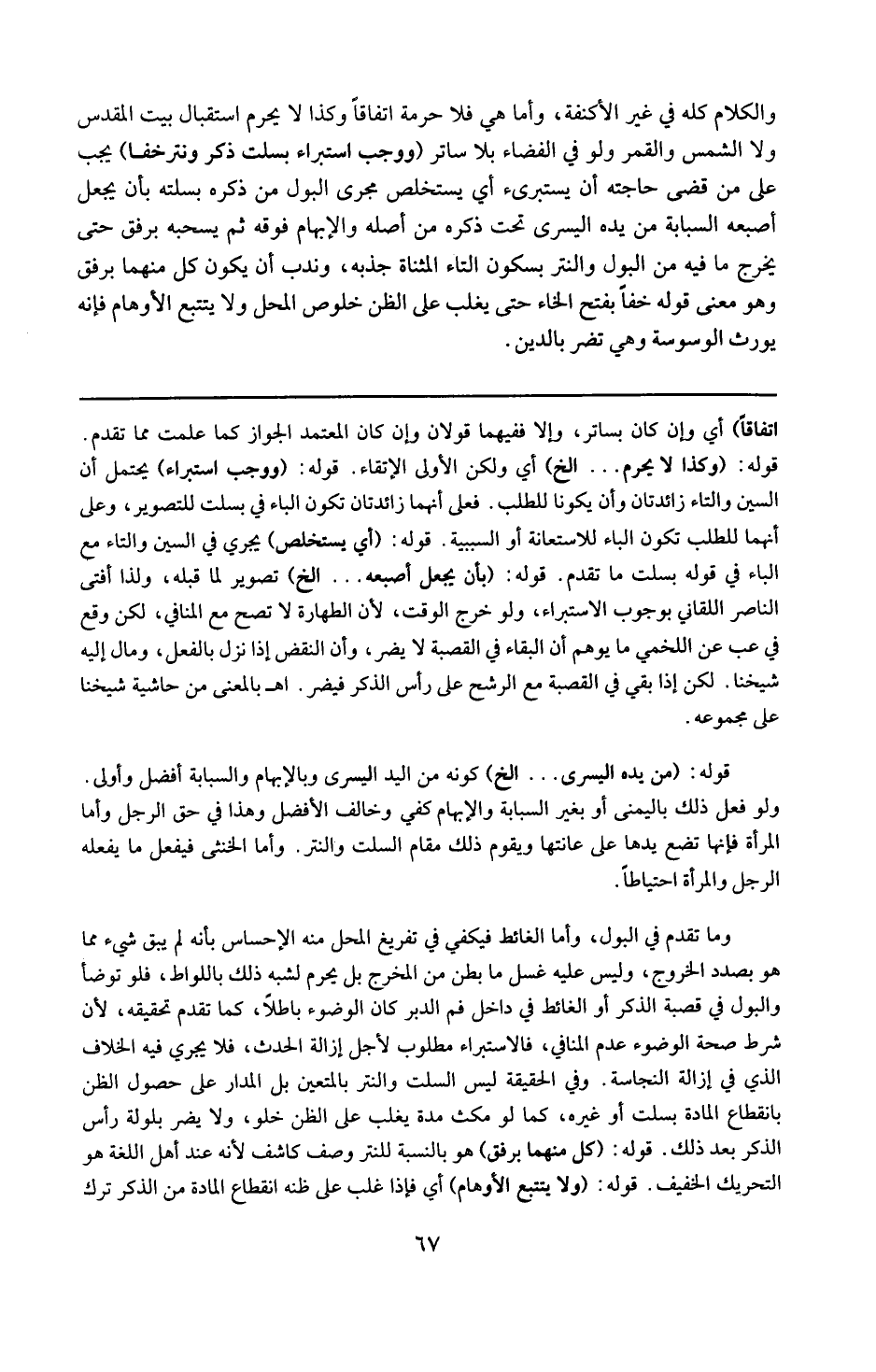 قوله : 6 ( من يده اليسرى ) إلخ : كونه من اليد اليسرى وبالإبهام والسبابة أفضل وأولى . ولو فعل ذلك باليمنى أو بغير السبابة كفى وخالف الأفضل . وهذا هى حق الرجل ، وأما المرأة فإنها تضع يدها على عانتها ويقوم ذلك مقام السلت والنتر ، وأما الخنى فيفعل ما يفعله الرجل والمرأة احتياطاً . وما تقدم فى البول ، وأما الغائط فيكفى فى تفريغ المحل منه الإحساس بأنه لم يبق شيء مما هو بصدد الخروج ، وليس عليه غسل ما بَطَن من المخرج ، بل يحرم لشبه ذلك باللواط . فلو توضأ والبول فى قصبة الذكر أو الغائط فى داخل فم الدبر كان الوضوء باطلا كما تقدم تحقيقه ؛ لأن شرط صحة الوضوء عدم المنافى ، فالاستبراء مطلوب لأجل إزالة الحدث فلا يجرى فيه الخلاف الذى فى إزالة النجاسة . وفى الحقيقة ليس السلت والنتر بالمتعين بل المدار على حصول الظن بانقطاع المادة بسلت أو غيره ، كمالو مكث مدة يغلب على الظن خلو المحلّ . ولا يضر بلولة رأس الذكر بعد ذلك .