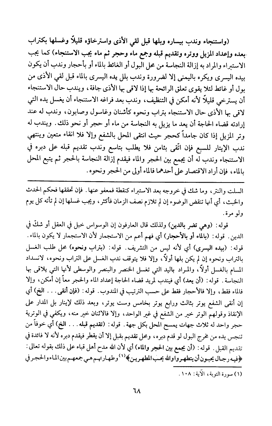 قوله : 16 ( بالماء أو بالأحجار ) : أي فهو أعم من الاستجمار لأن الاستجمار لايكون بالماء .