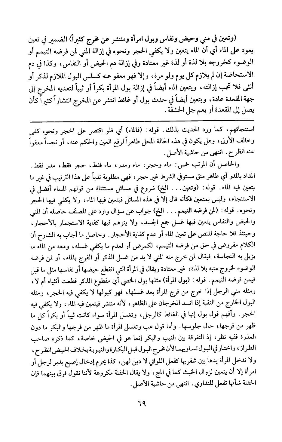 قوله : 16 ( فالماء أولى ) : أي فلو اقتصر على الحجر ونحوه كفى وخالف الأولى . وهل يكون فى هذه الحالة المحل طاهراً لرفع العين والحكم عنه أو نجساً معفواً عنه ؟ انظر 16 ( ح )6 ( انتهى من حاشية الأصل ) .