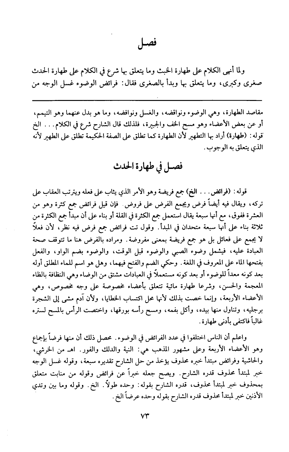 قوله : 16 ( فرائض ) إلخ : جمع فريضة : وهو الأمر الذى يثاب على فعله ويترتب العقاب على تركه ، ويقال فيه أيضا فرض ، ويجمع الفرض على فروض . فإن قبل فرائض جمع كثرة وهو من العشرة ففوق مع أنها سبعة ؟ يقال : استعمال جمع الكثرة فى القلة أو بناء على أن مبدأ جمع الكثرة من ثلاثة بناء على أنهما متحدان فى المبدأ وقول 16 ( تت ) : فرائض جمع فرض فيه نظر ، لأن فعلا لايجمع على فعائل بل هو جمع فريضة بمعنى مفروضة . ومراده بالفرض هنا ما تتوقف صحة العبادة عليه ، فيشمل وضوء الصبى ، والوضوء قبل الوقت . والوضوء بضم الواو : الفعل ، وبفتحها : الماء على المعروف فى اللغة ، وحكى الضم والفتح فيهما . وهل هو اسم للماء المطلق ؟ أوله بعد كونه معداً للوضوء ، أو بعد كونه مستعملا فى العبادات ؟ مشتق من الوضاءة بالمد وهى النظافة بالظاء المعجمة والحسن . وشرعاً : طهارة مائية تتعلق بأعضاء مخصوصة على وجه مخصوص وهى الأعضاء الأربعة . وإنما خصت بذلك لأنها محل اكتساب الخطايا ، ولأن آدم مشى إلى الشجرة برجليه وتناول منها بيده ، وأكل بفمه ، ومسح رأسه بورقها . واختص الرأس بالمسح لستره غالباً فاكتفى بأدنى طهارة . واعلم أن الناس اختلفوا فى عدد فرائض الوضوء ، ومحصل ذلك أن منها فرضاً بإجماع ، وهو الأعضاء الأربعة ، وعلى مشهور المذهب وهى النية والدلك والفور 16 ( اه . من الخرشى والحاشية ) .
