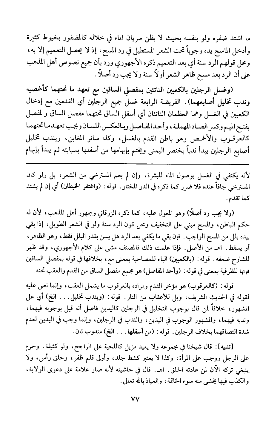 تنبيه : قال شيخنا فى مجموعه : ولا يعيد مزيل كاللحية على الراجح ولو كثيفة ، وحرم على الرجل ووجب على المرأة ، وكذا لايعتبر كشط جلد ، وأولى قلم ظفر وحلق رأس . ولا ينبغى تركه الآن لمن عادته الحلق ( ا هـ ) . قال فى حاشيته : لأنه صار علامة على دعوى الولاية ، والكذب فيها يخشى منه سوء الخاتمة والعياذ بالله تعالى .