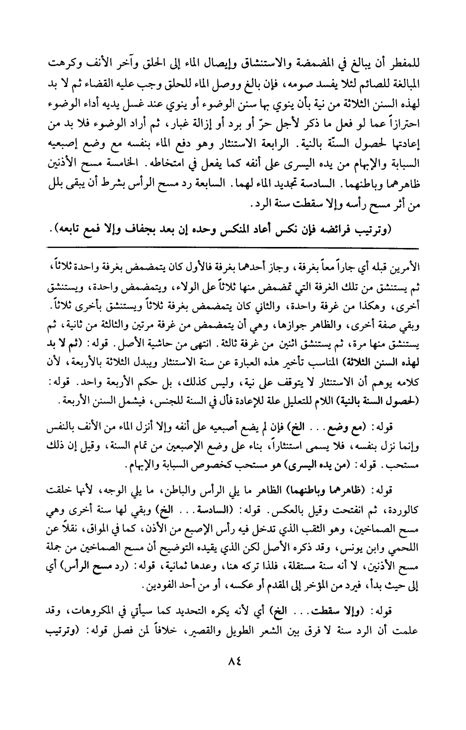 قوله : 16 ( ثم لابد لهذه السنن الثلاثة ) : المناسب تأخير هذه العبارة عن سنة الاستنثار . ويبدل الثلاثة بالأربعة ، لأن كلامه يوهم أن الاستنثار لايتوقف على نية ، وليس كذلك . بل حكم الأربعة واحد .