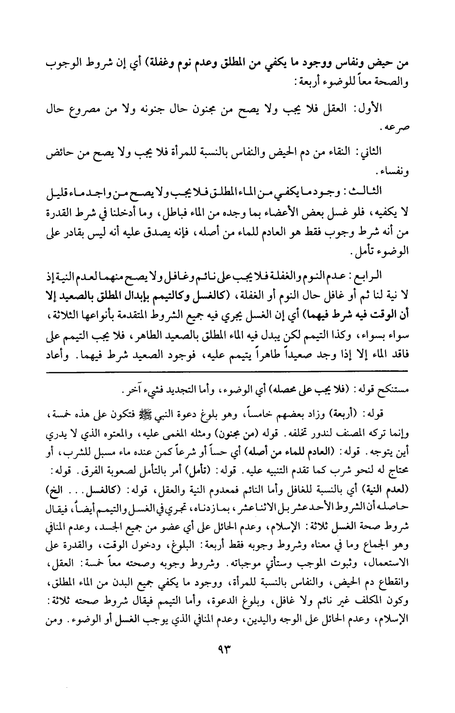 قوله : 16 ( كالغسل ) إلخ : حاصله أن الشروط الأحد عشر بل الإثنا عشر بما زدناه تجرى فى الغسل والتيمم أيضا ، فيقال : شروط صحة الغسل ثلاثة : الإسلام ، وعدم الحائل على أى عضو من جميع الجسد ، وعدم المنافى وهو الجماع وما فى معناه . وشروط وجوبه فقط أربعة : البلوغ ، ودخول الوقت ، والقدرة على الاستعمال ، وثبوت الموجب ، وستأتى موجباته . وشروط وجوبه وصحته معا خمسة : العقل ، وانقطاع دم الحيض والنفاس بالنسبة للمرأة ، ووجود ما يكفى جميع البدن من الماء المطلق ، وكون المكلف غير نائم ولاغافل ، وبلوغ الدعوة . وأما التيمم فيقال شروط صحته ثلاثة ؛ الإسلام : وعدم الحائل على الوجه واليدين ، وعدم المنافى الذى يوجب الغسل أو الوضوء . ومن