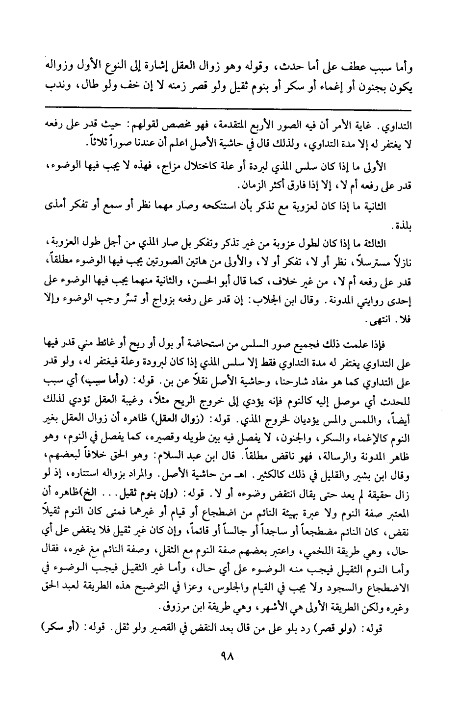 قوله : 16 ( وزوال العقل ) : ظاهره أن زوال العقل بغير النوم كالإغماء والسكر والجنون لايفصل فيه بين طويله وقصيره كما يفصل فى النوم ، وهو ظاهر المدونة والرسالة فهو ناقض مطلقا . قال ابن عبد السلام : وهو الحق خلافا لبعضهم . وقال ابن بشير : والقليل فى ذلك كالكثير ( ا هـ من حاشية الأصل ) . والمراد بزواله ؛ استتاره إذ لو زال حقيقة لم يعد حتى يقال انتقض وضوؤه أو لا .