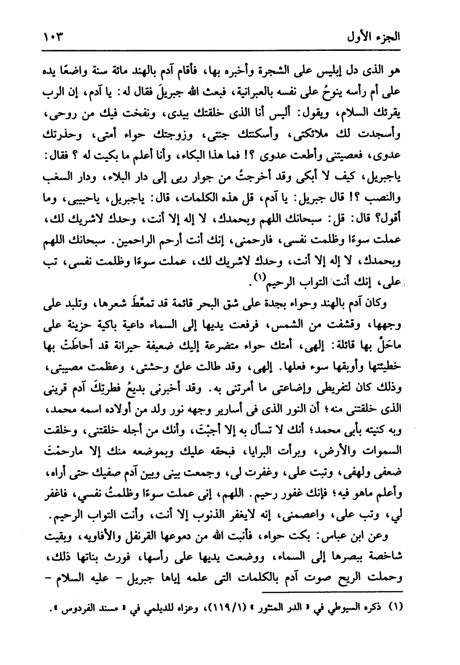 هُوَ الَّذِي دلّ إِبْلِيس على الشَّجَرَة وَأخْبرهُ بهَا فَأَقَامَ آدم فِي الْهِنْد مائَة سنة وَاضِعا يَده على أم رَأسه ينوح على نَفسه بالعبرانية فَبعث الله جِبْرِيل فَقَالَ لَهُ يَا آدم إِن الرب يُقْرِئك السَّلَام وَيَقُول أَلَيْسَ أَنا الَّذِي خلقتك بيَدي ونفخت فِيك من روحي وأسجدت لَك ملائكتي وأسكنتك جنتي وزوجتك حَوَّاء أمتِي وحذرتك عدوي فعصيتني وأطعت عدوي فَمَا هَذَا الْبكاء وَأَنا أعلم مَا بَكَيْت لَهُ فَقَالَ يَا جِبْرِيل كَيفَ لَا أبْكِي وَقد أخرجت من جوَار رَبِّي إِلَى دَار الْبلَاء وَدَار السغب وَالنّصب قَالَ جِبْرِيل يَا آدم قل هَذِه الْكَلِمَات قَالَ يَا جِبْرِيل يَا حَبِيبِي وَمَا أَقُول قَالَ قل سُبْحَانَكَ اللَّهُمَّ وَبِحَمْدِك لَا إِلَه إِلَّا أَنْت وَحدك لَا شريك لَك عملت سوءا وظلمت نَفسِي فارحمني إِنَّك أَنْت أرْحم الرَّاحِمِينَ سُبْحَانَكَ اللَّهُمَّ وَبِحَمْدِك لَا إِلَه إِلَّا أَنْت وَحدك لَا شريك لَك عملت سوءا وظلمت نَفسِي تب عَليّ إِنَّك أَنْت التواب الرَّحِيم وَكَانَ آدم بِالْهِنْدِ وحواء بجدة وعَلى شقّ الْبَحْر قَائِمَة قد تمعط شعرهَا وَتَلَبَّدَ على وَجههَا وقشفت من الشَّمْس فَرفعت يَديهَا إِلَى السَّمَاء دَاعِيَة باكية حزينة على مَا حل بهَا قائلة إلهي أمتك حَوَّاء متضرعة إِلَيْك ضَعِيفَة حيرانة قد أحاطت بهَا خطيئتها وأوبقها سوء فعلهَا إلهي وَقد طَالَتْ عَليّ وحشتي وعظمت مصيبتي وَذَلِكَ كَانَ لتفريطي وإضاعتي مَا أَمرتنِي بِهِ وَقد أَخْبرنِي بديع فطرتك آدم قريني الَّذِي خلقتني مِنْهُ أَن النُّور الَّذِي فِي أسارير وَجهه نور ولد من أَوْلَاده اسْمه مُحَمَّد وَبِه كنيته بِأبي مُحَمَّد أَنَّك لَا تسْأَل بِهِ إِلَّا أجبْت وَأَنَّك من أَجله خلقتني وخلقت السَّمَوَات وَالْأَرْض وبرأت البرايا فبحقه عَلَيْك وبموضعه مِنْك إِلَّا مَا رحمت ضعْفي ولهفي وتبت عَليّ وغفرت لي وجمعت بيني وَبَين آدم صفيك حَتَّى أرَاهُ وَاعْلَم مَا هُوَ فِيهِ فانك غَفُور رَحِيم اللَّهُمَّ إِنِّي عملت سوءا وظلمت نَفسِي فَاغْفِر لي وَتب عَليّ واعصمني إِنَّه لَا يغْفر الذُّنُوب إِلَّا أَنْت وَأَنت التواب الرَّحِيم وَعَن ابْن عَبَّاس بَكت حَوَّاء فأنبت الله من دموعها القرنفل والأفاويه وَبقيت شاخصة ببصرها إِلَى السَّمَاء وَوضعت يَديهَا على رَأسهَا فورث بناتها ذَلِك وحملت الرّيح صَوت آدم بالكلمات الَّتِي علمه إِيَّاهَا جِبْرِيل عَلَيْهِ السَّلَام
