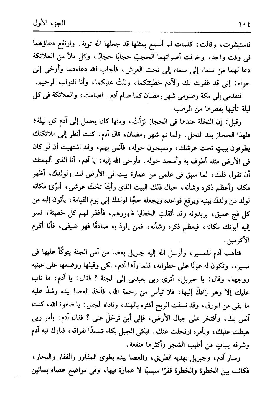 فاستبشرت وَقَالَت كَلِمَات لم أسمع بِمِثْلِهَا قد جعلهَا الله تَوْبَة وارتفع دعاؤهما فِي وَقت وَاحِد وخرقت أصواتهما الْحجب حِجَابا حِجَابا وكل مَلأ من الْمَلَائِكَة دَعَا لَهما من سَمَاء إِلَى سَمَاء إِلَى تَحت الْعَرْش فَأجَاب الله دعاءهما وَأوحى إِلَى حَوَّاء إِنِّي قد غفرت لَك ولآدم خطيئتكما وتبت عَلَيْكُمَا وَأَنا التواب الرَّحِيم فتقدمي إِلَى مَكَّة وصومي شهر رَمَضَان كَمَا صَامَ آدم فصامت وَالْمَلَائِكَة فِي كل لَيْلَة تأتيها بفطرها من الرطب وَقيل إِن النَّخْلَة عِنْدهَا فِي الْحجاز نزلت وَمِنْهَا كَانَ يحمل إِلَى آدم كل لَيْلَة فَلهَذَا الْحجاز بلد النّخل وَلما تمّ شهر رَمَضَان قَالَ آدم كنت أنظر إِلَى ملائكتك يطوفون بِبَيْت تَحت عرشك ويسبحون حوله فآنس بهم وَقد اشْتهيت أَن لَو كَانَ فِي الأَرْض مثله أَطُوف بِهِ وأسجد حوله فَأوحى الله إِلَيْهِ يَا آدم أَنا الَّذِي ألهمتك أَن تَقول ذَلِك لما سبق فِي علمي من عمَارَة بَيت فِي الأَرْض لَك ولولدك أظهر مَكَانَهُ وَأعظم ذكره وشأنه حِيَال ذَلِك الْبَيْت الَّذِي رَأَيْته تَحت عَرْشِي أبوئ مَكَانَهُ لولد من ولدك يبنيه وَيرْفَع قَوَاعِده ويجعله حجا لولدك إِلَى يَوْم الْقِيَامَة يأْتونَ إِلَيْهِ من كل فج عميق يريدونه وَقد أثقلت الْخَطَايَا ظُهُورهمْ فَأغْفِر لَهُم كل خَطِيئَة فسر إِلَيْهِ أبوئك مَكَانَهُ فيعظم ذكره وشأنه فَمن يلوذ بِهِ صَادِقا فَهُوَ ضَيْفِي فَأَنا أكْرم الأكرمين فتأهب آدم للمسير وَأرْسل الله إِلَيْهِ جِبْرِيل بعصا من آس الْجنَّة يتَوَكَّأ عَلَيْهَا فِي مسيره وَتَكون لَهُ عوناً على خطواته فَلَمَّا رَآهَا آدم بَكَى وَقبلهَا ووضعها على عَيْنَيْهِ وَوَجهه وَقَالَ يَا جِبْرِيل أَتَرَى رَبِّي يُعِيدنِي إِلَى الْجنَّة فَقَالَ يَا آدم مَا تَابَ عَلَيْك إِلَّا وَهُوَ رادك إِلَيْهَا فَلَا تيأس من رَحْمَة الله فَأخذ الْعَصَا بِيَدِهِ وَشد عَلَيْهِ مَا بَقِي من الْوَرق وَقد نسفت الرّيح أَكْثَره بِالْهِنْدِ وناداه الْجَبَل يَا صفوة الله كنت آنس بك وأفتخر على جبال الأَرْض فَإلَى أَيْن ترحل عني فَقَالَ آدم بِأَمْر رَبِّي هَبَطت عَلَيْك وبأمره ارتحلت عَنْك فَبكى الْجَبَل بكاء شَدِيدا لفراقه فَبَارك فِيهِ آدم وشرفه بنبات من أطيب الشّجر وأكثرها مَنْفَعَة وَسَار آدم وَجِبْرِيل يهديه الطَّرِيق والعصا بِيَدِهِ يطوي المفاوز والقفار والبحار فَكَانَت بَين الخطوة والخطوة قفراً سبسباً لَا عمَارَة فِيهَا وَفِي مَوَاضِع عَصَاهُ بساتين