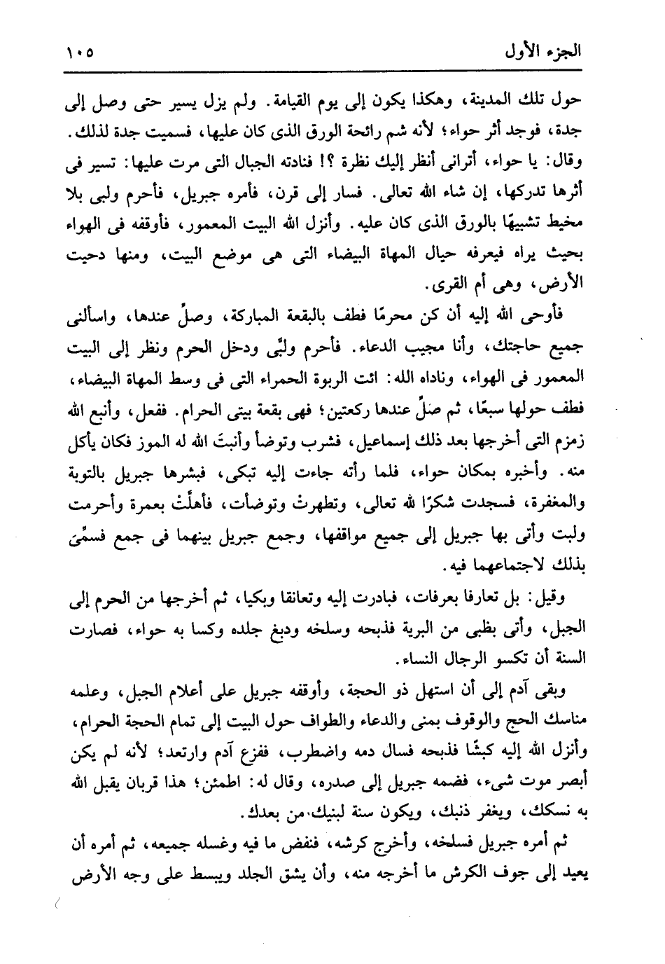 حول تِلْكَ الْمَدِينَة وَهَكَذَا يكون إِلَى يَوْم الْقِيَامَة وَلم يزل يسير حَتَّى وصل إِلَى جدة فَوجدَ أثر حَوَّاء لِأَنَّهُ شم رَائِحَة الْوَرق الَّذِي كَانَ عَلَيْهَا فسميت جدة لذَلِك وَقَالَ يَا حَوَّاء أَترَانِي أنظر إِلَيْك نظرة فنادته الْجبَال الَّتِي مرت عَلَيْهَا تيَسّر فِي أَثَرهَا تدركها إِن شَاءَ الله تَعَالَى فَسَار إِلَى قرن فَأمره جِبْرِيل فَأحْرم ولبى بِلَا مخيط تشيبها بالورق الَّذِي كَانَ عَلَيْهِ وَأنزل الله الْبَيْت الْمَعْمُور فاوقفه فِي الْهَوَاء بِحَيْثُ يرَاهُ فيعرفه حِيَال المهاة الْبَيْضَاء الَّتِي هِيَ مَوضِع الْبَيْت وَمِنْهَا دحيت الأَرْض وَهِي أم الْقرى فَأوحى الله إِلَيْهِ أَن كن محرما فَطُفْ بالبقعة الْمُبَارَكَة وصل عِنْدهَا واسألني جَمِيع حَاجَتك وَأَنا مُجيب الدُّعَاء فَأحْرم ولبى وَدخل الْحرم وَنظر إِلَى الْبَيْت الْمَعْمُور فِي الْهَوَاء وناداه الله ائْتِ الربوة الْحَمْرَاء الَّتِي فِي وسط المهاة الْبَيْضَاء فَطُفْ حولهَا سبعا ثمَّ صل عِنْدهَا رَكْعَتَيْنِ فَهِيَ بقْعَة بَيْتِي الْحَرَام فَفعل وأنبع الله زَمْزَم الَّتِي أخرجهَا بعد ذَلِك إِسْمَاعِيل فَشرب وَتَوَضَّأ وَأنْبت الله لَهُ الموز فَكَانَ يَأْكُل مِنْهُ وَأخْبرهُ بمَكَان حَوَّاء فَلَمَّا رَأَتْهُ جَاءَت إِلَيْهِ تبْكي فبشرها جِبْرِيل بِالتَّوْبَةِ وَالْمَغْفِرَة فسجدت شكرا لله تَعَالَى وتطهرت وتوضأت فأهلت بِعُمْرَة وأحرمت ولبت وأتى بهَا جِبْرِيل إِلَى جَمِيع مواقفها وَجمع جِبْرِيل بَينهمَا فِي جمع فَسمى بذلك لاجتماعهما فِيهِ وَقيل بل تعارفا بِعَرَفَات فبادرت إِلَيْهِ وتعانقا وبكيا ثمَّ أخرجهُمَا من الْحرم إِلَى الْجَبَل وأتى بِظَبْيٍ من الْبَريَّة فذبحه وسلخه ودبغ جلده وكسا بِهِ حَوَّاء فَصَارَت السّنة أَن تكسو الرِّجَال النِّسَاء وَبَقِي آدم إِلَى أَن اسْتهلّ ذُو الْحجَّة وَأَوْقفهُ جِبْرِيل على أَعْلَام الْجَبَل وَعلمه مَنَاسِك الْحَج وَالْوُقُوف بمنى وَالدُّعَاء وَالطّواف حول الْبَيْت إِلَى تَمام الْحجَّة الْحَرَام وَأنزل الله إِلَيْهِ كَبْشًا فذبحه فَسَالَ دَمه واضطرت فَفَزعَ آدم وارتعد لِأَنَّهُ لم يكن أبْصر موت شَيْء فضمه جِبْرِيل إِلَى صَدره وَقَالَ لَهُ اطمئن هَذَا قرْبَان يقبل الله بِهِ نسكك وَيغْفر ذَنْبك وَيكون سنة لبنيك من بعْدك ثمَّ أمره جِبْرِيل فسلخه وَأخرج كرشه فنفض مَا فِيهِ وغسله جَمِيعه ثمَّ أمره أَن يُعِيد إِلَى جَوف الكرش مَا أخرجه مِنْهُ وَأَن يشق الْجلد ويبسط على وَجه الأَرْض