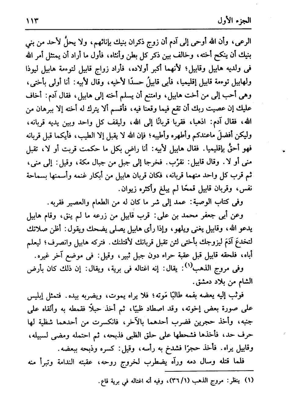 الرَّعْي وَأَن الله أوحى إِلَى آدم أَن زوج ذكران بَيْنك بإناثهم وَلَا يحل لأحد من بني بنيك أَن ينْكح أُخْته وَخَالف بَين ذكر كل بطن وأنثاه فَأول مَا أَرَادَ أَن يمتثل أَمر الله فِي ولديه هابيل وقابيل لِأَنَّهُمَا أكبر أَوْلَاده فَأَرَادَ زواج قابيل لتوءمة هابيل ليوذا ولهابيل توءمة قابيل إقليميا فَأبى قابيل حسداً لِأَخِيهِ وَقَالَ لِأَبِيهِ أَنا أولى بأختي هِيَ أحب إِلَيّ من أُخْت هابيل وَامْتنع أَن يسلم أُخْته إِلَى هابيل فَقَالَ آدم أَخَاف عَلَيْك إِن عصيت رَبك أَن تقع فِيمَا وقعنا فِيهِ فأقسم أَلا يتْرك لَهُ أُخْته إِلَّا ببرهان من الله فَقَالَ آدم اذْهَبَا فقربا قرباناً إِلَى الله وليقف كل وَاحِد وَبَين يَدَيْهِ قربانه وَليكن أفضل مَا عنْدكُمْ وأطهره وأطيبه فَإِن الله لَا يقبل إِلَّا الطّيب فأيكما قبل قربانه فَهُوَ أَحَق بإقليميا فَقَالَ هابيل لِأَبِيهِ أَنا رَاض بِكُل مَا حكمت قربت أَو لَا تقبل مني أَو لَا وَقَالَ قابيل نقرب فَخَرَجَا إِلَى جبل من جبال مَكَّة وَقيل إِلَى منى ثمَّ قرب كل وَاحِد مِنْهُمَا قرباه فَكَانَ قرْبَان هابيل من أبكار غنمه وأسمنها بسماحة نفس وقربان قابيل قمحاً لم يبلغ وَأَكْثَره زيوان وَفِي كتاب الْوَصِيَّة عمد إِلَى شَرّ مَا كَانَ لَهُ من الطَّعَام والعصير فقربه وَعَن أبي جَعْفَر مُحَمَّد بن عَليّ قرب قابيل من زرعه مَا لم ينق وَقَامَ هابيل يَدْعُو الله وقابيل يُغني ويلهو وَإِذا رأى هابيل يُصَلِّي يضْحك وَيَقُول أَظن صَلَاتك لتخدع آدم ليزوجك بأختي لَئِن تقبل قربانك لأَقْتُلَنك فَتَركه هابيل وَانْصَرف ليعلم أَبَاهُ فَلحقه قابيل قبل عقبَة حراء دون جبل ثبير وَقيل فِي مَوضِع آخر غَيره وَفِي مروج الذَّهَب يُقَال إِنَّه اغتاله فِي بَريَّة وَيُقَال إِن ذَلِك كَانَ بِأَرْض الشَّام من بِلَاد دمشق فَوَثَبَ إِلَيْهِ يعضه بفمه طَالبا مَوته فَلَا يرَاهُ يَمُوت ويضربه بِيَدِهِ فتمثل لَهُ إِبْلِيس على صُورَة بعض إخْوَته وَقد اصطاد ظَبْيًا ثمَّ أَخذ حبلاً فقمطه بِهِ وألقاه على جنبه وَأخذ حجرين فَضرب أَحدهمَا بِالْآخرِ فَانْكَسَرت من أَحدهمَا شظية لَهَا حرف حد فَأَخذهَا فشحطها على حلق الظبي فذبحه ثمَّ احتلمه وَمضى لسبيله وقابيل يرَاهُ فَأخذ حجرا فشدخ بِهِ رَأسه وَقيل كَسره وذبحه بِبَعْضِه فَمَاتَ فَلَمَّا قَتله وسال دَمه وَرَآهُ يضطرب لخُرُوج روحه عقبته الندامة وتبرأ مِنْهُ