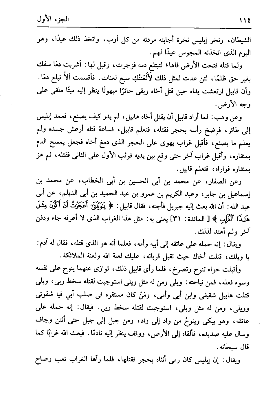 الشَّيْطَان ونخر إِبْلِيس نخرة أَجَابَتْهُ مردته من كل أَوب وَاتخذ ذَلِك عيداً وَهُوَ الْيَوْم الَّذِي اتخذته الْمَجُوس عيداً لَهُم وَلما قَتله فتحت الأَرْض فاها لتبتلع دَمه فزجرت وَقيل لَهَا أشربت دَمًا سفك بِغَيْر حق ظلما لَئِن عدت لمثل ذَلِك لألعننك سبع لعنات فأقسمت أَلا تبلع دَمًا وَأَن قابيل ارتعشت يَدَاهُ حِين قتل أَخَاهُ وَبَقِي حائراً مبهوتاً ينظر إِلَيْهِ مَيتا ملقى على وَجهه الأَرْض وَعَن وهب لما أَرَادَ قابيل أَن يقتل أَخَاهُ هابيل لم يدر كَيفَ يصنع فَعمد إِبْلِيس إِلَى طَائِر فرضخ رَأسه بِحجر فَقتله فتعلم قابيل فساعة قَتله أرعش جسده وَلم يعلم مَا يصنع فَأقبل غراب يهوي على الْحجر الَّذِي دمغ أَخَاهُ فَجعل يمسح الدَّم بمنقاره وَأَقْبل غراب آخر حَتَّى وَقع بَين يَدَيْهِ فَوَثَبَ الأول على الثَّانِي فَقتله ثمَّ هز بمنقاره فواراه فتعلم قابيل وَعَن الصفار عَن مُحَمَّد بن أبي الْحُسَيْن بن أبي الْخطاب عَن مُحَمَّد بن إِسْمَاعِيل بن جَابر وَعبد الْكَرِيم بن عَمْرو بن عبد الحميد بن أبي الديلم عَن أبي عبد الله أَن الله بعث إِلَيْهِ جِبْرِيل فأجنه فَقَالَ قابيل {يَا ويلتى أَعَجَزْتُ أَنْ أَكُونَ مِثْلَ هَذَا الْغُرَابِ} الْمَائِدَة 31 يَعْنِي بِهِ مثل هَذَا الْغُرَاب الَّذِي لَا أعرفهُ جَاءَ وَدفن آخر وَلم أهتد لذَلِك وَيُقَال إِنَّه حمله على عَاتِقه إِلَى أَبِيه وَأمه فعلما أَنه هُوَ الَّذِي قَتله فَقَالَ لَهُ آدم يَا وَيلك قتلت أَخَاك حَيْثُ تقبل قربانه عَلَيْك لعنة الله ولعنة الْمَلَائِكَة وَأَقْبَلت حَوَّاء تنوح وتصرخ فَلَمَّا رأى قابيل ذَلِك توارى عَنْهُمَا ينوح على نَفسه وَسُوء فعله فَمن نياحته ويلي وَمن لَهُ مثل ويلي اسْتَوْجَبت لقَتله سخط رَبِّي ويلي قتلت هابيل شقيقي وَابْن أبي وَأمي وَمن كَانَ مستقره فِي صلب أبي فيا شقوتي وويلي وَمن لَهُ مثل ويلي اسْتَوْجَبت لقَتله سخط رَبِّي فَيُقَال إِنَّه حمله على عَاتِقه وَهُوَ يبكي وينوح من وَاد إِلَى وَاد وَمن جبل إِلَى جبل حَتَّى أنتن وجاف وسال عَلَيْهِ صديده فَأَلْقَاهُ إِلَى الأَرْض ووقف ينظر إِلَيْهِ نَادِما فَبعث الله غراباً كَمَا قَالَ سُبْحَانَهُ وَيُقَال إِن إِبْلِيس كَانَ رمى أنثاه بِحجر فَقَتلهَا فَلَمَّا رَآهَا الْغُرَاب تَعب وَصَاح