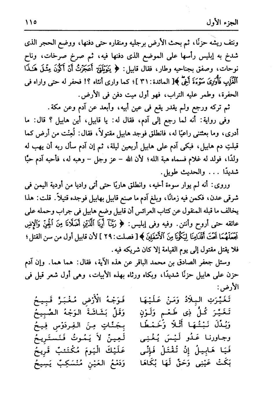 ونتف ريشه حزنا ثمَّ بحث الأَرْض برجليه ومنقاره حَتَّى دَفنهَا وَوضع الْحجر الَّذِي شدخ بِهِ إِبْلِيس رَأسهَا على الْموضع الَّذِي دَفنهَا فِيهِ ثمَّ صرخَ صرخات وناح نوحات وصفق بجناحيه وطار فَقَالَ قابيل {يَوَيْلَتَي أَعَجَزْتُ أَنْ أَكُونَ مِثْلَ هَذَا الْغُرَاب فأواري سَوْءَةَ أَخِي} الْمَائِدَة 31 كَمَا وارى أنثاه فحفر لَهُ حَتَّى واراه فِي الحفرة وطمر عَلَيْهِ التُّرَاب فَهُوَ أول ميت دفن فِي الأَرْض ثمَّ تَركه وَرجع وَلم يقدر يَقع فِي عين أَبِيه وَأبْعد عَن آدم وَعَن مَكَّة وَفِي رِوَايَة أَنه لما رَجَعَ إِلَى آدم فَقَالَ لَهُ يَا قابيل أَيْن هابيل قَالَ مَا أَدْرِي وَمَا بعثتني رَاعيا لَهُ فَانْطَلق فَوجدَ هابيل مقتولاً فَقَالَ لعنت من أَرض كَمَا قبلت دم هابيل فَبكى آدم على هابيل أَرْبَعِينَ لَيْلَة ثمَّ إِن آدم سَأَلَ ربه أَن يهب لَهُ ولدا فولد لَهُ غُلَام فَسَماهُ هبة الله لِأَن الله عز وَجل وهبه لَهُ فَأَحبهُ آدم حبا شَدِيدا والْحَدِيث طَوِيل وروى أَنه لم يوار سوءة أَخِيه وَانْطَلق هَارِبا حَتَّى أَتَى وَاديا من أَوديَة الْيمن فِي شَرْقي عدن فكمن فِيهِ زَمَانا وَبلغ آدم مَا صنع قابيل بهابيل فَوَجَدَهُ قَتِيلا قلت هَذَا يُخَالف مَا قبله الْمَنْقُول عَن كتاب العرائس أَن قابيل وضع هابيل فِي جراب وَحمله على عَاتِقه حَتَّى أروح وأنتن وَفِيه وفى إِبْلِيس {رَبَّنَا أَرِنَا الَّذَيْنِ أَضَلاَّنَا مِنَ الْجِنِّ وَالإِنسِ نَجْعَلْهُمَا تَحْتَ أَقْدَامِنَا لِيَكُونَا مِنَ الأَسْفَلِينَ} فصلت 29 لِأَن قابيل أول من سنّ الْقَتْل فَلَا يقتل مقتول إِلَى يَوْم الْقِيَامَة إِلَّا كَانَ شَرِيكه فِيهِ وَسُئِلَ جَعْفَر الصَّادِق بن مُحَمَّد الباقر عَن هَذِه الْآيَة فَقَالَ هما هما وَإِن آدم حزن على هابيل حزنا شَدِيدا وبكاه ورثاه بِهَذِهِ الأبيات وَهِي أول شعر قيل فِي الأَرْض