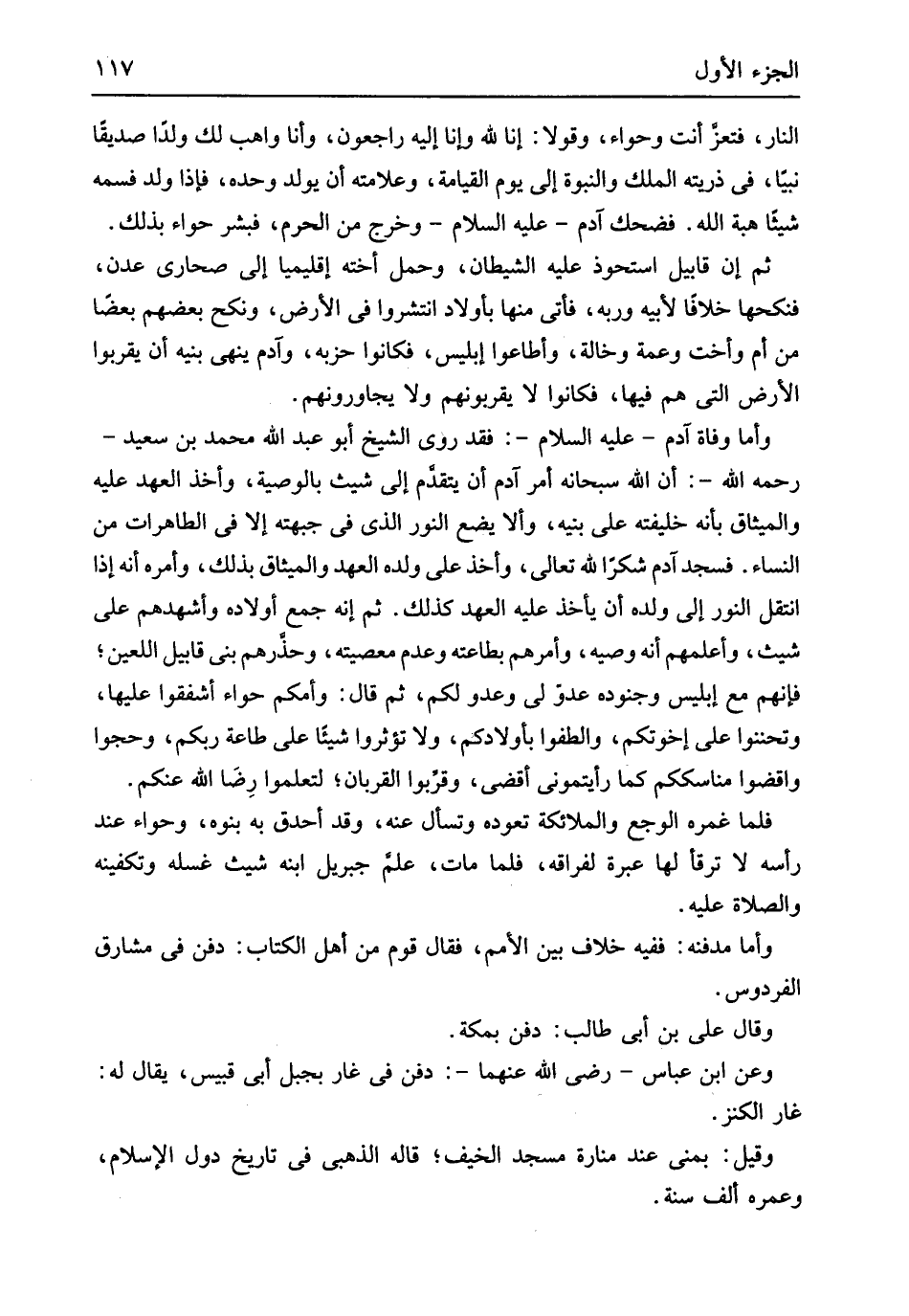 النَّار فتعز أَنْت وحواء وقولا إِنَّا لله وَأَنا إِلَيْهِ رَاجِعُون وَأَنا واهب لَك ولدا صديقا نَبيا فِي ذُريَّته الْملك والنبوة إِلَى يَوْم الْقِيَامَة وعلامته أَن يُولد وَحده فَإِذا ولد فسمه شيثا هبة الله فَضَحِك آدم عَلَيْهِ السَّلَام وَخرج من الْحرم فبشر حَوَّاء بذلك ثمَّ إِن قابيل استحوذ عَلَيْهِ الشَّيْطَان وَحمل أُخْته إقليميا إِلَى صحارى عدن فنكحها خلافًا لِأَبِيهِ وربه فَأتى مِنْهَا بأولاد انتشروا فِي الأَرْض ونكح بَعضهم بَعْضًا من أم وَأُخْت وعمة وَخَالَة وأطاعوا إِبْلِيس فَكَانُوا حزبه وآدَم ينْهَى بنيه أَن يقربُوا الأَرْض الَّتِي هم فِيهَا فَكَانُوا لَا يقربونهم وَلَا يجاورونهم وَأما وَفَاة آدم عَلَيْهِ السَّلَام فقد روى الشَّيْخ أَبُو عبد الله مُحَمَّد بن سعيد رَحمَه الله أَن الله سُبْحَانَهُ أَمر آدم أَن يتَقَدَّم إِلَى شِيث بِالْوَصِيَّةِ وَأخذ الْعَهْد عَلَيْهِ والميثاق بِأَنَّهُ خَلِيفَته على بنيه وَألا يضع النُّور الَّذِي فِي جَبهته إِلَّا فِي الطاهرات من النِّسَاء فَسجدَ آدم شكرا لله تَعَالَى وَأخذ على وَلَده الْعَهْد والميثاق بذلك وَأمره أَنه إِذا انْتقل النُّور إِلَى وَلَده أَن يَأْخُذ عَلَيْهِ الْعَهْد كَذَلِك ثمَّ إِنَّه جمع أَوْلَاده وأشهدهم على شِيث وأعلمهم أَنه وَصِيّه وَأمرهمْ بِطَاعَتِهِ وَعدم مَعْصِيَته وحذرهم بني قابيل اللعين فَإِنَّهُم مَعَ إِبْلِيس وَجُنُوده عَدو لي وعدو لكم ثمَّ قَالَ وأمكم حَوَّاء أشفقوا عَلَيْهَا وتحننوا على إخوتكم والطفوا بأولادكم وَلَا تؤثروا شَيْئا على طَاعَة ربكُم وحجوا واقضوا مَنَاسِككُم كَمَا رَأَيْتُمُونِي أَقْْضِي وقربوا القربان لِتَعْلَمُوا رضَا الله عَنْكُم فَلَمَّا غمره الوجع وَالْمَلَائِكَة تعوده وتسأل عَنهُ وَقد أحدق بِهِ بنوه وحواء عِنْد رَأسه لَا ترقأ لَهَا عِبْرَة لفراقه فَلَمَّا مَاتَ علم جِبْرِيل ابْنه شِيث غسله وتكفينه وَالصَّلَاة عَلَيْهِ وَأما مدفنه فَفِيهِ خلاف بَين الْأُمَم فَقَالَ قوم من أهل الْكتاب دفن فِي مَشَارِق الفردوس وَقل عَليّ بن أبي طَالب دفن بِمَكَّة وَعَن ابْن عَبَّاس رَضِي الله عَنْهُمَا دفن فِي غَار بجبل أبي قبيس يُقَال لَهُ غَار الْكَنْز وَقيل بمنى عِنْد مَنَارَة مَسْجِد الْخيف قَالَه الذَّهَبِيّ فِي تَارِيخ دوَل الْإِسْلَام وعمره ألف سنة