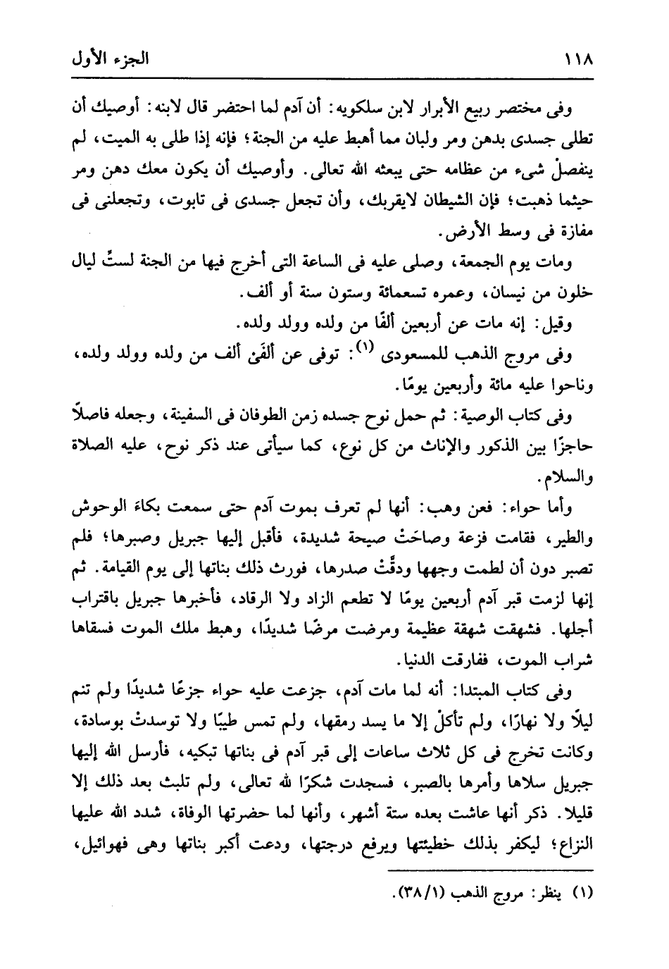 وَفِي مُخْتَصر ربيع الْأَبْرَار لِابْنِ سلكويه أَن آدم لما احْتضرَ قَالَ لِابْنِهِ أوصيك أَن تطلي جَسَدِي بدهن وَمر ولبان مِمَّا أهبط عَلَيْهِ من الْجنَّة فَإِنَّهُ إِذْ طلي بِهِ الْمَيِّت لم ينْفَصل شَيْء من عِظَامه حَتَّى ببعثه الله تَعَالَى وأوصيك أَن يكون مَعَك دهن وَمر حَيْثُمَا ذهبت فَإِن الشَّيْطَان لَا يقربك وَأَن تجْعَل جَسَدِي فِي تَابُوت وتجعلني فِي مفازة فِي وسط الأَرْض وَمَات يَوْم الْجُمُعَة وَصلى عَلَيْهِ فِي السَّاعَة الَّتِي أخرج فِيهَا من الْجنَّة لست لَيَال خلون من نيسان وعمره تِسْعمائَة وَسِتُّونَ سنة أَو ألف وَقيل إِنَّه مَاتَ عَن أَرْبَعِينَ ألفا من وَلَده وَولد وَلَده وَفِي مروج الذَّهَب للمسعودي توفّي عَن ألفي ألف من وَلَده وَولد وَلَده وناحوا عَلَيْهِ مائَة وَأَرْبَعين يَوْمًا وَفِي كتاب الْوَصِيَّة ثمَّ حمل نوح جسده زمن الطوفان فِي السَّفِينَة وَجعله فاصلاً حاجزاً بَين الذُّكُور وَالْإِنَاث من كل نوع كَمَا سَيَأْتِي عِنْد ذكر نوح عَلَيْهِ الصَّلَاة وَالسَّلَام وَأما حَوَّاء فَعَن وهب أَنَّهَا لم تعرف بِمَوْت آدم حَتَّى سَمِعت بكاء الوحوش وَالطير فَقَامَتْ فزعة وصاحت صَيْحَة شَدِيدَة فَأقبل إِلَيْهَا جِبْرِيل وصبرها فَلم تصبر دون أَن لطمت وَجههَا ودقت صدرها فورث ذَلِك بناتها إِلَى يَوْم الْقِيَامَة ثمَّ إِنَّهَا لَزِمت قبر آدم أَرْبَعِينَ يَوْمًا لَا تطعم الزَّاد وَلَا الرقاد فَأَخْبرهَا جِبْرِيل باقتراب أجلهَا فشهقت شهقة عَظِيمَة ومرضت مَرضا شَدِيدا وَهَبَطَ ملك الْمَوْت فَسَقَاهَا شراب الْمَوْت ففارقت الدُّنْيَا وَفِي كتاب المبتدا أَنه لما مَاتَ آدم جزعت عَلَيْهِ حَوَّاء جزعاً شَدِيدا وَلم تنم لَيْلًا وَلَا نَهَارا وَلم تَأْكُل إِلَّا مَا يسد رمقها وَلم تمس طيبا وَلَا توسدت بوسادة وَكَانَت تخرج فِي كل ثَلَاث سَاعَات إِلَى قبر آدم فِي بناتها تبكيه فَأرْسل الله إِلَيْهَا جِبْرِيل سلاها وأمرها بِالصبرِ فسجدت شكرا لله تَعَالَى وَلم تلبث بعد ذَلِك إِلَّا قَلِيلا ذكر أَنَّهَا عاشت بعده سِتَّة أشهر وَأَنَّهَا لما حضرتها الْوَفَاة شدد الله عَلَيْهَا النزاع ليكفر بذلك خطيئتها وَيرْفَع درجتها ودعت أكبر بناتها وَهِي فهوائيل