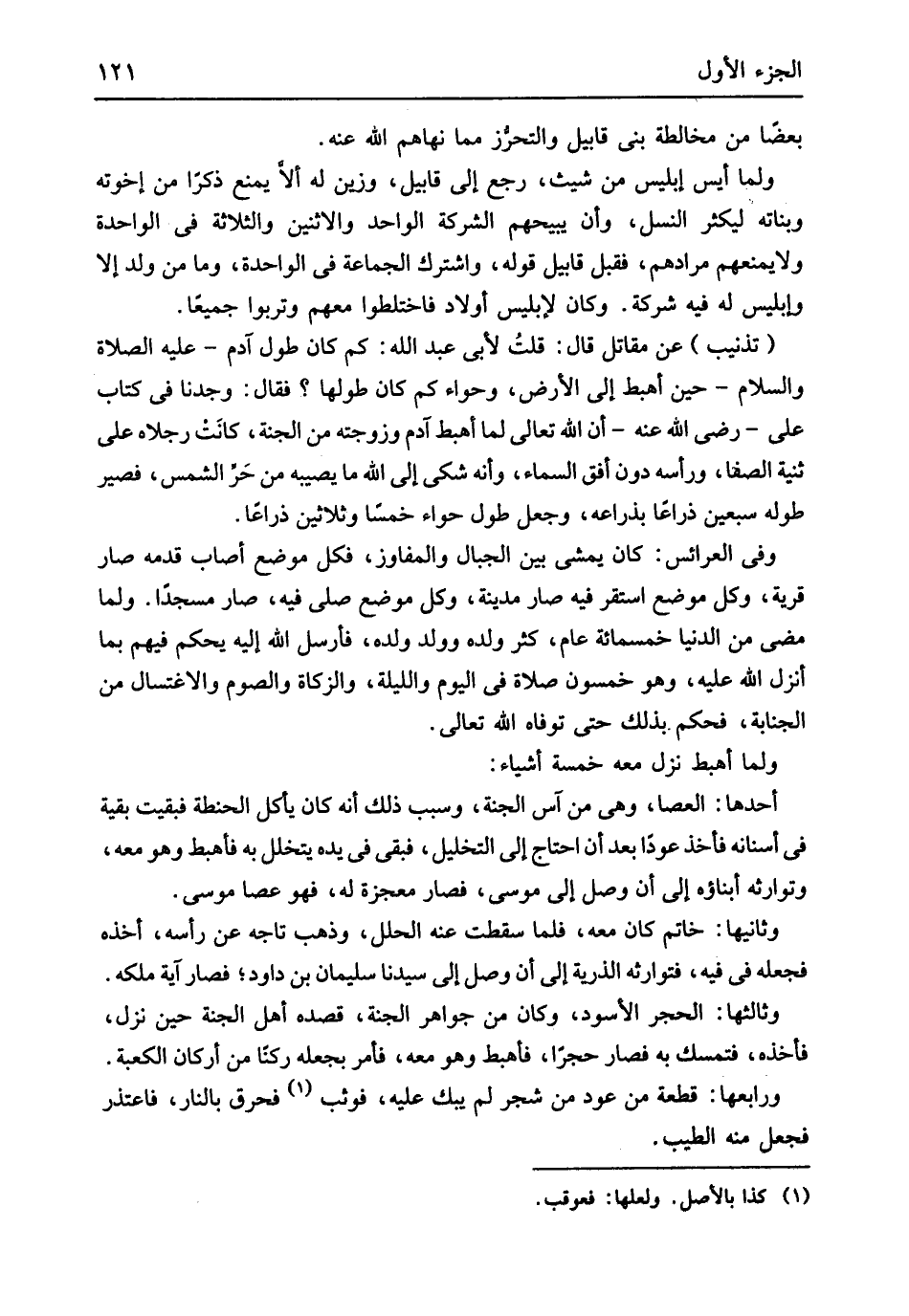 بَعْضًا من مُخَالطَة بني قابيل والتحرز مِمَّا نَهَاهُم الله عَنهُ وَلما أيس إِبْلِيس من شِيث رَجَعَ إِلَى قابيل وزين لَهُ أَلا يمْنَع ذكرا من إخْوَته وَبنَاته ليكْثر النَّسْل وَأَن يبيحهم الشّركَة الْوَاحِد والاثنين وَالثَّلَاثَة فِي الْوَاحِدَة وَلَا يمنعهُم مُرَادهم فَقبل قابيل قَوْله واشترك الْجَمَاعَة فِي الْوَاحِدَة وَمَا من ولد إِلَّا وإبليس لَهُ فِيهِ شركَة وَكَانَ لإبليس أَوْلَاد فاختلطوا مَعَهم وتربوا جَمِيعًا تذنيب عَن مقَاتل قَالَ قلت لأبي عبد الله كم كَانَ طول آدم عَلَيْهِ الصَّلَاة وَالسَّلَام حِين أهبط إِلَى الأَرْض وحواء كم كَانَ طولهَا فَقَالَ وجدنَا فِي كتاب عَليّ رَضِي الله عَنهُ أَن الله تَعَالَى لما أهبط آدم وَزَوجته من الْجنَّة كَانَت رِجْلَاهُ على ثنية الصَّفَا وَرَأسه دون أفق السَّمَاء وَأَنه شكى إِلَى الله مَا يُصِيبهُ من حر الشَّمْس فصير طوله سبعين ذِرَاعا بذراعه وَجعل طول حَوَّاء خمْسا وَثَلَاثِينَ ذِرَاعا وَفِي العرائس كَانَ يمشي بَين الْجبَال والمفاوز فَكل مَوضِع أصَاب قدمه صَار قَرْيَة وكل مَوضِع اسْتَقر فِيهِ صَار مَدِينَة وكل مَوضِع صلى فِيهِ صَار مَسْجِدا وَلما مضى من الدُّنْيَا خَمْسمِائَة عَام كثر وَلَده وَولد وَلَده فَأرْسل الله إِلَيْهِ يحكم فيهم بِمَا انْزِلْ الله عَلَيْهِ وَهُوَ خَمْسُونَ صَلَاة فِي الْيَوْم وَاللَّيْلَة وَالزَّكَاة وَالصَّوْم والاغتسال من الْجَنَابَة فَحكم بذلك حَتَّى توفاه الله تَعَالَى وَلما أهبط نزل مَعَه خَمْسَة أَشْيَاء أَحدهَا الْعَصَا وَهِي من آس الْجنَّة وَسبب ذَلِك أَنه كَانَ يَأْكُل الْحِنْطَة فَبَقيت بَقِيَّة فِي أَسْنَانه فَأخذ عوداً بعد أَن احْتَاجَ إِلَى التَّخْلِيل فَبَقيَ فِي يَده يَتَخَلَّل بِهِ فأهبط وَهُوَ مَعَه وتوارثه أبناؤه إِلَى أَن وصل إِلَى مُوسَى فَصَارَ معْجزَة لَهُ فَهُوَ عَصا مُوسَى وَثَانِيها خَاتم كَانَ مَعَه فَلَمَّا سَقَطت عَنهُ الْحلَل وَذهب تاجه عَن رَأسه أَخذه فَجعله فِي فِيهِ فتوارثه الذُّرِّيَّة إِلَى أَن وصل إِلَى سيدنَا سُلَيْمَان بن دَاوُد فَصَارَ آيَة ملكه وثالثهما الْحجر الْأسود وَكَانَ من جَوَاهِر الْجنَّة قَصده أهل الْجنَّة حِين نزل فَأَخذه فتمسك بِهِ فَصَارَ حجرا فأهبط وَهُوَ مَعَه فَأمر بجعله ركنا من أَرْكَان الْكَعْبَة وَرَابِعهَا قِطْعَة من عود من شجر لم يبك عَلَيْهِ فَوَثَبَ فَحرق بالنَّار فَاعْتَذر فَجعل مِنْهُ الطّيب