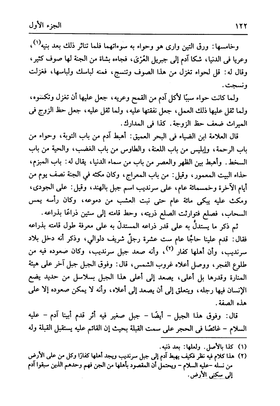 وخامسها ورق التِّين وارى هُوَ وحواء بِهِ سوءاتهما فَلَمَّا تناثر ذَلِك بعد بنيه وعريا فِي الدُّنْيَا شكا آدم إِلَى جِبْرِيل العري فَجَاءَهُ بِشَاة من الْجنَّة لَهَا صوف كثير وَقَالَ لَهُ قل لحواء تغزل من هَذَا الصُّوف وتنسج فَمِنْهُ لباسك ولباسها فغزلت ونسجت وَلما كَانَت حَوَّاء سَببا لأكل آدم من الْقَمْح وعريه جعل عَلَيْهَا أَن تغزل وتكسوه وَلما ثقل عَلَيْهَا ذَلِك الْعَمَل جعل نَفَقَتهَا عَلَيْهِ وَلما ثقل عَلَيْهِ جعل حَظّ الزَّوْج فِي الْمِيرَاث ضعف حَظّ الزَّوْجَة كَذَا فِي المدارك قَالَ الْعَلامَة ابْن الضياء فِي الْبَحْر العميق أهبط آدم من بَاب التَّوْبَة وحواء من بَاب الرَّحْمَة وإبليس من بَاب اللَّعْنَة والطاوس من بَاب الْغَضَب والحية من بَاب السخط وأهبط بَين الظّهْر وَالْعصر من بَاب من سَمَاء الدُّنْيَا يُقَال لَهُ بَاب المبزم حذاء الْبَيْت الْمَعْمُور وَقيل من بَاب الْمِعْرَاج وَكَانَ مكثه فِي الْجنَّة نصف يَوْم من أَيَّام الْآخِرَة وَخَمْسمِائة عَام على سرنديب اسْم جبل بِالْهِنْدِ وَقيل على الجودي وَمكث عَلَيْهِ يبكي مائَة عَام حَتَّى نبت العشب من دُمُوعه وَكَانَ رَأسه يمس السَّحَاب فصلع فتوارثت الصلع ذُريَّته وَحط قامته إِلَى سِتِّينَ ذِرَاعا بذراعه ثمَّ ذكر مَا يسْتَدلّ بِهِ على قدر ذراعه الْمُسْتَدلّ بِهِ على معرفَة طول قامته بذراعه فَقَالَ قدم عَلَيْهَا حَاجا عَام سِتّ عشرَة رجل شرِيف دلوالي وَذكر أَنه دخل بِلَاد سرنديب وَأَن أَهلهَا كفار وَأَنه صعد جبل سرنديب وَكَانَ صُعُوده فِيهِ من المنارة وقدرها بل أَعلَى يصعد إِلَى أَعلَى هَذَا الْجَبَل بسلاسل من حَدِيد يضع الْإِنْسَان فِيهَا رجله وَيتَعَلَّق إِلَى أَن يصعد إِلَى أَعْلَاهُ وَأَنه لَا يُمكن صُعُوده إِلَّا على هَذِه الصّفة قَالَ وَفَوق هَذَا الْجَبَل أَيْضا جبل صَغِير فِيهِ أثر قدم أَبينَا آدم عَلَيْهِ السَّلَام غائصاً فِي الْحجر على سمت الْقبْلَة بِحَيْثُ إِن الْقَائِم عَلَيْهِ يسْتَقْبل الْقبْلَة وَله
