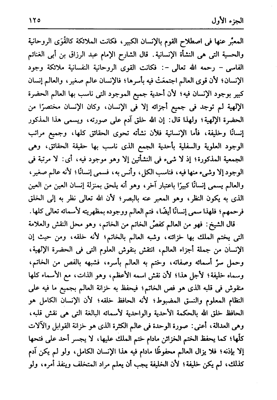 الْمعبر عَنْهَا فِي اصْطِلَاح الْقَوْم بالإنسان الْكَبِير فَكَانَت الْمَلَائِكَة كالقوى الروحانية والحسية الَّتِي هِيَ النشأة الإنسانية قَالَ الشَّارِح الإِمَام عبد الرَّزَّاق بن أبي الْغَنَائِم الفاسي رَحمَه الله تَعَالَى فَكَانَت القوى الروحانية النفسانية مَلَائِكَة وجود الْإِنْسَان لِأَن قوى الْعَالم اجْتمعت فِيهِ بأسرها فالإنسان عَالم صَغِير والعالم إِنْسَان كَبِير بِوُجُود الْإِنْسَان فِيهِ لِأَن أحدية جَمِيع الْمَوْجُود الَّتِي ناسب بهَا الْعَالم الحضرة الإلهية لم تُوجد فِي جَمِيع أَجْزَائِهِ إِلَّا فِي الْإِنْسَان وَكَانَ الْإِنْسَان مُخْتَصرا من الحضرة الإلهية وَلِهَذَا قَالَ إِن الله خلق آدم على صورته وَيُسمى هَذَا الْمَذْكُور إنْسَانا وَخَلِيفَة فَأَما الإنسانية فَلِأَن نشأته تحوي الْحَقَائِق كلهَا وَجَمِيع مَرَاتِب الْوُجُود العلوية والسفلية بأحدية الْجمع الَّذِي ناسب بهَا حَقِيقَة الْحَقَائِق وَهِي الجمعية الْمَذْكُورَة إِذْ لَا شَيْء فِي النشأتين إِلَّا وَهُوَ مَوْجُود فِيهِ أَي لَا مرتبَة فِي الْوُجُود إِلَّا وَشَيْء مِنْهَا فِيهِ فَنَاسَبَ الْكل وَأنس بِهِ فَسمى إنْسَانا لِأَنَّهُ عَالم صَغِير والعالم يُسمى إنْسَانا كَبِيرا بِاعْتِبَار آخر وَهُوَ أَنه يلْحق بِمَنْزِلَة مَا إِنْسَان الْعين من الْعين الَّذِي بِهِ يكون النّظر وَهُوَ الْمعبر عَنهُ بالبصر لِأَن الله تَعَالَى نظر بِهِ إِلَى الْخلق فَرَحِمهمْ فَلهَذَا سمى إنْسَانا أَيْضا فتم الْعَالم ووجوده بمظهريته لأسمائه تَعَالَى كلهَا قَالَ الشَّيْخ فَهُوَ من الْعَالم كقص الْخَاتم من الْخَاتم وَهُوَ مَحل النقش والعلامة الَّتِي يخْتم الْملك بهَا خزائنه وَشبه الْعَالم بالخاتم لِأَنَّهُ خلقه وَمن حَيْثُ إِن الْإِنْسَان من جملَة أَجزَاء الْعَالم انتقش بنقوش الْعُلُوم الَّتِي فِي الحضرة الإلهية وَحمل سر أَسْمَائِهِ وَصِفَاته وَختم بِهِ الْعَالم بأسره فشبهه بالفص من الْخَاتم وَسَماهُ خَليفَة لأجل هَذَا لِأَن نقش اسْمه الْأَعْظَم وَهُوَ الذَّات مَعَ الْأَسْمَاء كلهَا منقوش فِي قلبه الَّذِي هُوَ فص الْخَاتم فيحفظ بِهِ خزانَة الْعَالم بِجَمِيعِ مَا فِيهِ على النظام الْمَعْلُوم والنسق المضبوط لِأَنَّهُ الْحَافِظ خلقه لِأَن الْإِنْسَان الْكَامِل هُوَ الْحَافِظ خلق الله بالحكمة الأحدية والواحدية لأسمائه الْبَالِغَة الَّتِي هِيَ نقش قلبه وَهِي الْعَدَالَة أَعنِي صُورَة الْوحدَة فِي عَالم الْكَثْرَة الَّذِي هُوَ خزانَة القوابل والآلات كلهَا كَمَا يحفظ الْخَتْم الخزائن مَا دَامَ ختم الْملك عَلَيْهَا لَا يَجْسُر أحد على فتحهَا إِلَّا بِإِذْنِهِ فَلَا يزَال الْعَالم مَحْفُوظًا مَا دَامَ فِيهِ هَذَا الْإِنْسَان الْكَامِل وَلَو لم يكن آدم كَذَلِك لم يكن خَليفَة لِأَن الْخَلِيفَة يجب أَن يعلم مُرَاد المتخلف وَينفذ أمره وَلَو