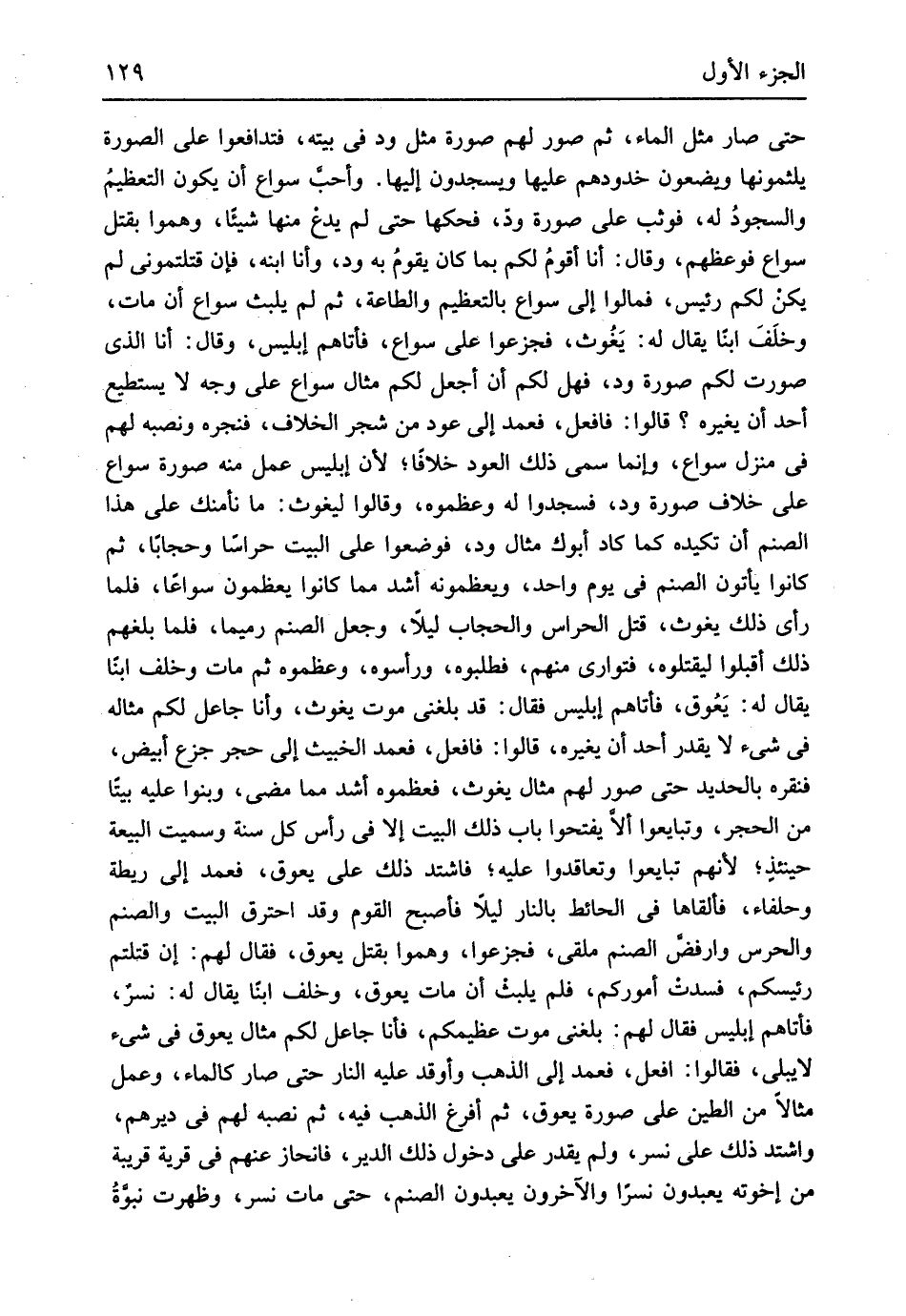 حَتَّى صَار مثل المَاء ثمَّ صور لَهُم صُورَة مثل ود فِي بَيته فتدافعوا على الصُّورَة يلثمونها ويضعون خدودهم عَلَيْهَا ويسجدون إِلَيْهَا وَأحب سواع أَن يكون التَّعْظِيم وَالسُّجُود لَهُ فَوَثَبَ على صُورَة ود فحكها حَتَّى لم يدع مِنْهَا شَيْئا وهموا بقتل سواع فوعظهم وَقَالَ أَنا أقوم لكم بِمَا كَانَ يقوم بِهِ ود وَأَنا ابْنه فَإِن قتلتموني لم يكن لكم رَئِيس فمالوا إِلَى سواع بالتعظيم وَالطَّاعَة ثمَّ لم يلبث سواع أَن مَاتَ وَخلف ابْنا يُقَال لَهُ يَغُوث فجزعوا على سواع فَأَتَاهُم إِبْلِيس وَقَالَ أَنا الَّذِي صورت لكم صُورَة ود فَهَل لكم أَن أجعَل لكم مِثَال سواع على وَجه لَا يَسْتَطِيع أحد ان يُغَيِّرهُ قَالُوا فافعل فَعمد إِلَى عود من شجر الْخلاف فنجره ونصبه لَهُم فِي منزل سواع وَإِنَّمَا سمى ذَلِك الْعود خلافًا لِأَن إِبْلِيس عمل مِنْهُ صُورَة سواع على خلاف صُورَة ود فسجدوا لَهُ وعظموه وَقَالُوا ليغوث مَا نأمنك على هَذَا الصَّنَم أَن تكيده كَمَا كَاد أَبوك مِثَال ود فوضعوا على الْبَيْت حراساً وحجاباً ثمَّ كَانُوا يأْتونَ الصَّنَم فِي يَوْم وَاحِد ويعظمونه أَشد مِمَّا كَانُوا يعظمون سواعاً فَلَمَّا رآى ذَلِك يَغُوث قتل الحراس والحجاب لَيْلًا وَجعل الصَّنَم رميماً فَلَمَّا بَلغهُمْ ذَلِك اقْبَلُوا ليقتلوه فتوارها مِنْهُم فطلبوه ورأسوه وعظموه ثمَّ مَاتَ وَخلف ابْنا يُقَال لَهُ يعوق فَأَتَاهُم إِبْلِيس فَقَالَ قد بَلغنِي موت يَغُوث وَأَنا جَاعل لكم مِثَاله فِي شَيْء لَا يقدر أحد أَن يُغَيِّرهُ قَالُوا فافعل فَعمد الْخَبيث إِلَى حجر جزع أَبيض فنقره بالحديد حَتَّى صور لَهُم مِثَال يَغُوث فعظموه أَشد مِمَّا مضى وبنوا عَلَيْهِ بَيْتا من الْحجر وتبايعوا أَلا يفتحوا بَاب ذَلِك الْبَيْت إِلَّا فِي رَأس كل سنة وَسميت الْبيعَة حِينَئِذٍ لأَنهم تبايعوا وتعاقدوا عَلَيْهِ فَاشْتَدَّ ذَلِك على يعوق فَعمد إِلَى ريطة وحلفاء فألقاها فِي الْحَائِط بالنَّار لَيْلًا فَأصْبح الْقَوْم وَقد احْتَرَقَ الْبَيْت والصنم والحرس وَارْفض الصَّنَم ملقى فجزعوا وهموا بقتل يعوق فَقَالَ لَهُم إِن قتلتم رئيسكم فَسدتْ أُمُوركُم فَلم يلبث أَن مَاتَ يعوق وَخلف ابْنا يُقَال لَهُ نسر فَأَتَاهُم إِبْلِيس فَقَالَ لَهُم بَلغنِي موت عظيمكم فَأَنا جَاعل لكم مِثَال يعوق فِي شَيْء لَا يبْلى فَقَالُوا افْعَل فَعمد إِلَى الذَّهَب وأوقد عَلَيْهِ النَّار حَتَّى صَار كَالْمَاءِ وَعمل مِثَالا من الطين على صُورَة يعوق ثمَّ أفرغ الذَّهَب فِيهِ ثمَّ نَصبه لَهُم فِي ديرهم وَاشْتَدَّ ذَلِك على نسر وَلم يقدر على دُخُول ذَلِك الدَّيْر فانحاز عَنْهُم فِي قَرْيَة قريبَة من إخْوَته يعْبدُونَ نسراً وَالْآخرُونَ يعْبدُونَ الصَّنَم حَتَّى مَاتَ نسر وَظَهَرت نبوة