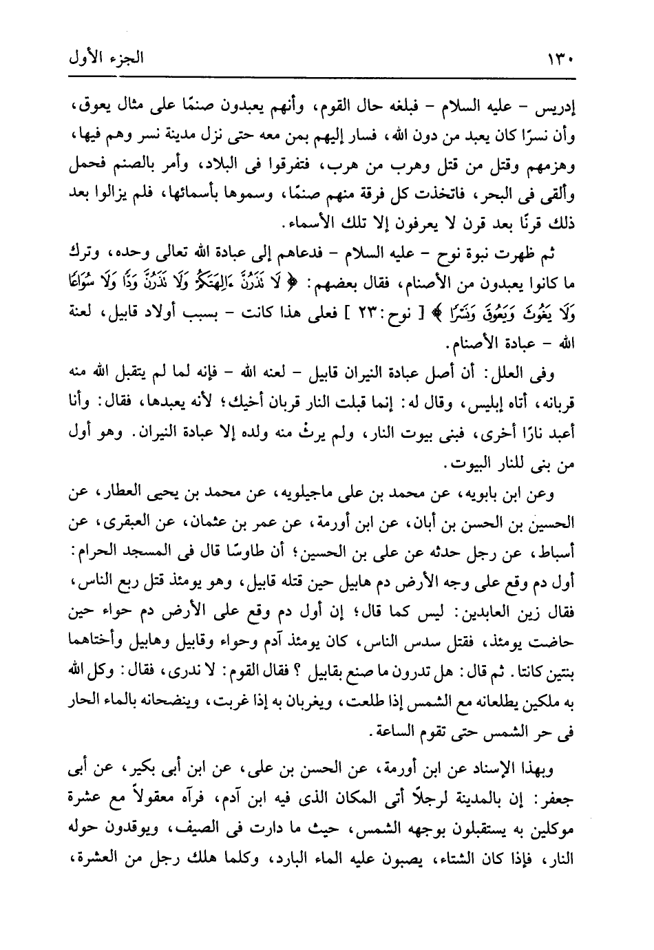 إِدْرِيس عَلَيْهِ السَّلَام فَبَلغهُ حَال الْقَوْم وَأَنَّهُمْ يعْبدُونَ صنماً على مِثَال يعوق وَأَن نسراً كَانَ يعبد من دون الله فَسَار إِلَيْهِم بِمن مَعَه حَتَّى نزل مَدِينَة نسر وهم فِيهَا وَهَزَمَهُمْ وَقتل من قتل وهرب من هرب فَتَفَرَّقُوا فِي الْبِلَاد وَأمر بالصنم فَحمل وَألقى فِي الْبَحْر فاتخذت كل فرقة مِنْهُم صنماً وسموها بأسمائها فَلم يزَالُوا بعد ذَلِك قرنا بعد قرن لَا يعْرفُونَ إِلَّا تِلْكَ الْأَسْمَاء ثمَّ ظَهرت بنوة نوح عَلَيْهِ السَّلَام فَدَعَاهُمْ إِلَى عبَادَة الله تَعَالَى وَحده وَترك مَا كَانُوا يعْبدُونَ من الْأَصْنَام فَقَالَ بَعضهم {لَا تذرن آلِهَتكُم وَلاَ تَذَرُنَّ وَدّاً وَلاَ سُوَاعاً وَلاَ يَغُوثَ ويعوق ونسرا} نوح 23 فعلى هَذَا كَانَت بسب أَوْلَاد قابيل لعنة الله عبَادَة الْأَصْنَام وَفِي الْعِلَل أَن أصل عبَادَة النيرَان قابيل لَعنه الله فَإِنَّهُ لما لم يتَقَبَّل الله مِنْهُ قربانه أَتَاهُ إِبْلِيس وَقَالَ لَهُ إِنَّمَا قبلت النَّار قرْبَان أَخِيك لِأَنَّهُ يَعْبُدهَا فَقَالَ وَأَنا أعبد نَارا أُخْرَى فَبنى بيُوت النَّار وَلم يَرث مِنْهُ وَلَده إِلَّا عبَادَة النيرَان وَهُوَ أول من بنى للنار بيُوت وَعَن ابْن بابويه عَن مُحَمَّد بن عَليّ ماجيلويه عَن مُحَمَّد بن يحيى الْعَطَّار عَن الْحُسَيْن بن الْحسن بن أبان عَن ابْن أرومة عَن عمر بن عُثْمَان عَن العبقري عَن أَسْبَاط عَن رجل حَدثهُ عَن عَليّ بن الْحُسَيْن أَن طاوساً قَالَ فِي الْمَسْجِد الْحَرَام أول دم وَقع على وَجه الأَرْض دم هابيل حِين قَتله قابيل وَهُوَ يَوْمئِذٍ قتل ربع النَّاس فَقَالَ زين العابدين لَيْسَ كَمَا قَالَ إِن أول دم وَقع على الأَرْض دم حَوَّاء حِين حَاضَت يَوْمئِذٍ فَقتل سدس النَّاس كَانَ يَوْمئِذٍ آدم وحواء وقابيل وهابيل وأختاهما بنتين كَانَتَا ثمَّ قَالَ هَل تَدْرُونَ مَا صنع بقابيل فَقَالَ الْقَوْم لَا نَدْرِي فَقَالَ وكل الله بِهِ ملكَيْنِ يطلعانه مَعَ الشَّمْس إِذا طلعت ويغربان بِهِ إِذا غربت وينضحانه بِالْمَاءِ الْحَار فِي حر الشَّمْس حَتَّى تقوم السَّاعَة وَبِهَذَا الْإِسْنَاد عَن ابْن أرومة عَن الْحسن بن عَليّ عَن ابْن أبي بكير عَن أبي جَعْفَر إِن بِالْمَدِينَةِ لرجلاً أَتَى الْمَكَان الَّذِي فِيهِ ابْن آدم فَرَآهُ معقولاً مَعَ عشرَة موكلين بِهِ يستقبلون بِوَجْهِهِ الشَّمْس حَيْثُ مَا دارت فِي الصَّيف ويوقدون حوله النَّار فَإِذا كَانَ الشتَاء يصبون عَلَيْهِ المَاء الْبَارِد وَكلما هلك رجل من الْعشْرَة