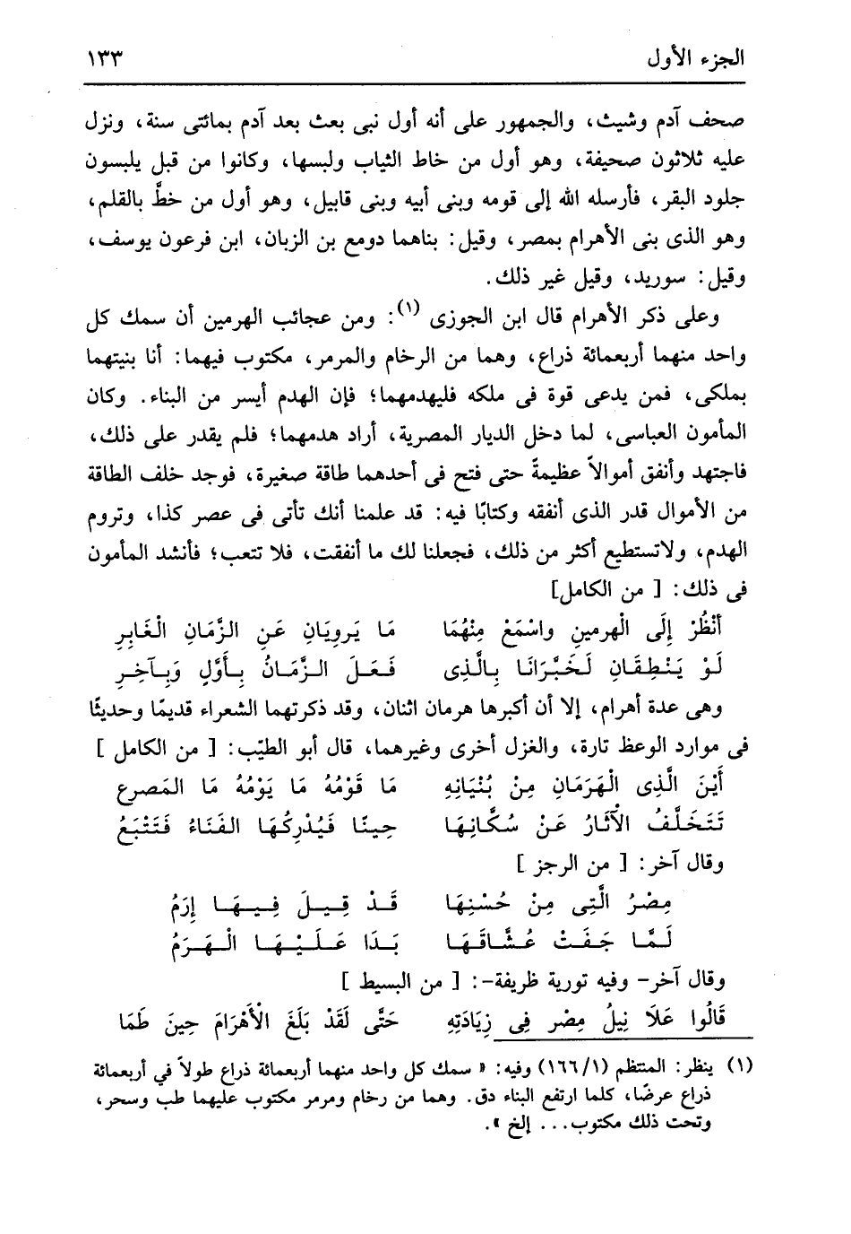 صحف آدم وشيث وَالْجُمْهُور على أَنه أول نَبِي بعث بعد آدم بِمِائَتي سنة وَنزل عَلَيْهِ ثَلَاثُونَ صحيفَة وَهُوَ أول من خاط الثِّيَاب ولبسها وَكَانُوا من قبل يلبسُونَ جُلُود الْبَقر فَأرْسلهُ الله إِلَى قومه وَبني أَبِيه وَبني قابيل وَهُوَ أول من خطّ بالقلم وَهُوَ الَّذِي بنى الأهرام بِمصْر وَقيل بناهما دومع بن الزبان ابْن فِرْعَوْن يُوسُف وَقيل سوريد وَقيل غير ذَلِك وعَلى ذكر الأهرام قَالَ ابْن الْجَوْزِيّ وَمن عجائب الهرمين أَن سمك كل وَاحِد مِنْهُمَا أَرْبَعمِائَة ذِرَاع وهما من الرخام والمرمر مَكْتُوب فيهمَا أَنا بنيتهما بملكي فَمن يَدعِي قُوَّة فِي ملكه فليهدمهما فَإِن الْهدم أيسر من الْبناء وَكَانَ الْمَأْمُون العباسي لما دخل الديار المصرية أَرَادَ هدمهما فَلم يقدر على ذَلِك فاجتهد وَأنْفق أَمْوَالًا عَظِيمَة حَتَّى فتح فِي أَحدهمَا طَاقَة صَغِيرَة فَوجدَ خلف الطَّاقَة من الْأَمْوَال قدر الَّذِي أنفقهُ وكتاباً فِيهِ قد علمنَا أَنَّك تَأتي فِي عصر كَذَا وتروم الْهدم وَلَا تَسْتَطِيع أَكثر من ذَلِك فَجعلنَا لَك مَا أنفقت فَلَا تتعب فَأَنْشد الْمَأْمُون فِي ذَلِك // (من الْكَامِل) //