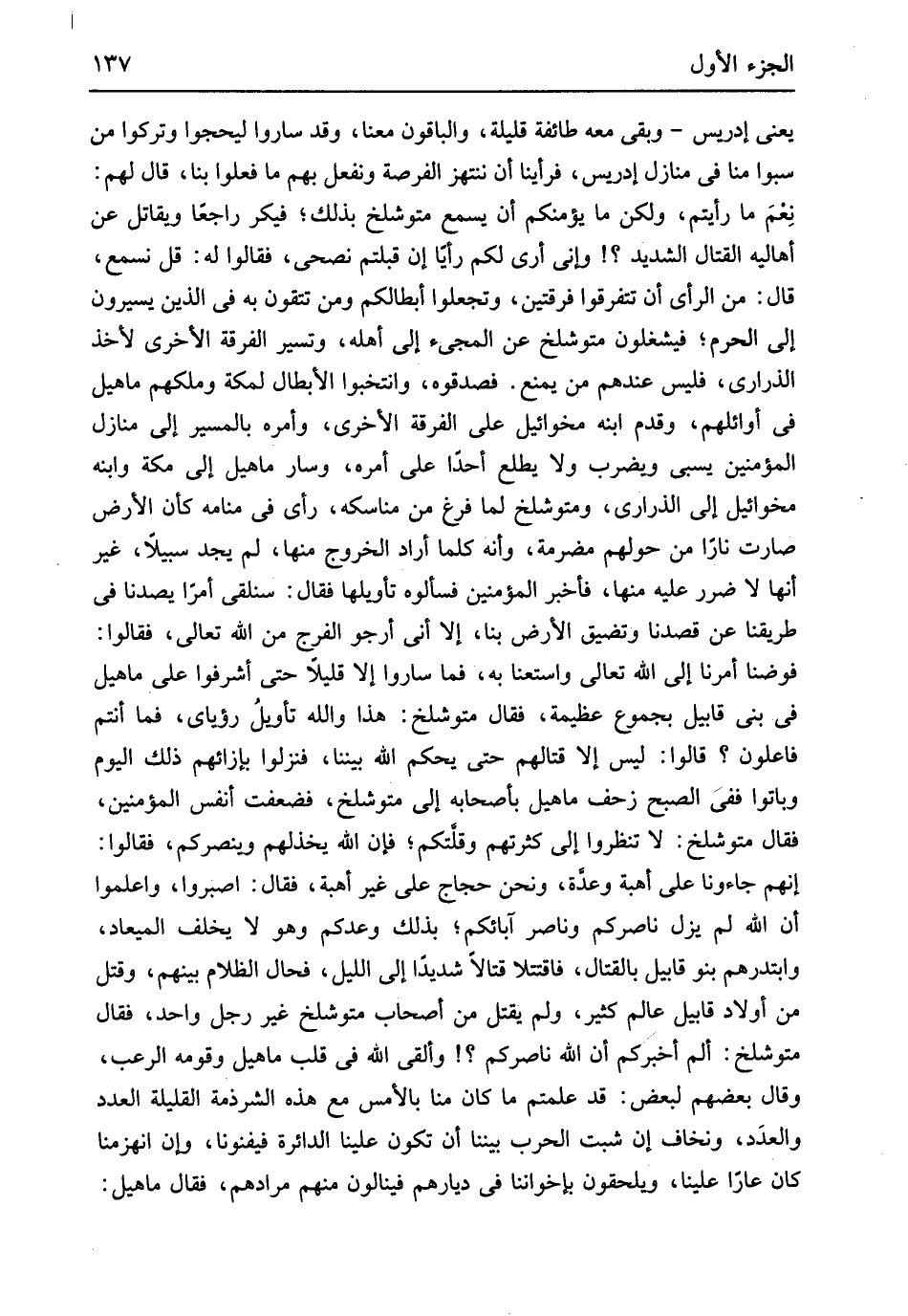 يَعْنِي إِدْرِيس وَبَقِي مَعَه طَائِفَة قَليلَة وَالْبَاقُونَ مَعنا وَقد سَارُوا ليحجوا وَتركُوا من سبوا منا فِي منَازِل إِدْرِيس فَرَأَيْنَا أَن ننتهز الفرصة ونفعل بهم مَا فعلوا بِنَا قَالَ لَهُم نعم مَا رَأَيْتُمْ وَلَكِن مَا يؤمنكم إِن يسمع متلوشخ بذلك فيكر رَاجعا وَيُقَاتل عَن أهاليه الْقِتَال الشَّديد وَإِنِّي أرى لكم رَأيا إِن قبلتم نصحي فَقَالُوا لَهُ قل نسْمع قَالَ من الرَّأْي أَن تتفرقوا فرْقَتَيْن وتجعلوا أبطالكم وَمن تَتَّقُون بِهِ فِي الَّذين يَسِيرُونَ إِلَى الْحرم فيشغلون متوشلخ عَن الْمَجِيء إِلَى أَهله وتسير الْفرْقَة الْأُخْرَى لأخذ الذَّرَارِي فَلَيْسَ عِنْدهم من يمْنَع فصدقوه وانتخبوا الْأَبْطَال لمَكَّة وملكهم ماهيل فِي أوائلهم وَقدم ابْنه مخوائيل على الْفرْقَة الْأُخْرَى وَأمره بِالْمَسِيرِ إِلَى منَازِل الْمُؤمنِينَ بسبي وَيضْرب وَلَا يطلع أحدا على أمره وَسَار ماهيل إِلَى مَكَّة وَابْنه مخوائيل إِلَى الذَّرَارِي ومتوشلخ لما فرغ من مَنَاسِكه رأى فِي مَنَامه كَأَن الأَرْض صَارَت نَارا من حَولهمْ مضرمة وانه كلما أَرَادَ الْخُرُوج مِنْهَا لم يجد سَبِيلا غير أَنَّهَا لَا ضَرَر عَلَيْهِ مِنْهَا فَأخْبرهُ الْمُؤمنِينَ فَسَأَلُوهُ تَأْوِيلهَا فَقَالَ سنلقي أمرا يصدنا فِي طريقنا عَن قصدنا وتضيق الأَرْض بِنَا إِلَّا أَنِّي أَرْجُو الْفرج من الله تَعَالَى فَقَالُوا فوضنا أمرنَا إِلَى الله تَعَالَى واستعنا بِهِ فَمَا سَارُوا إِلَّا قَلِيلا حَتَّى أشرفوا على ماهيل فِي بني قابيل بِمَجْمُوع عَظِيمَة فَقَالَ متوشلخ هَذَا وَالله تَأْوِيل رُؤْيَايَ فَمَا أَنْتُم فاعلون قَالُوا لَيْسَ إِلَّا قِتَالهمْ حَتَّى يحكم الله بَيْننَا فنزلوا بإزائهم ذَلِك الْيَوْم وَبَاتُوا فَفِي الصُّبْح زحف ماهيل بِأَصْحَابِهِ إِلَى متوشلخ فضعفت أنفس الْمُؤمنِينَ فَقَالَ متوشلخ لَا تنظروا إِلَى كثرتهم وقلتكم فَإِن الله يخذلهم وينصركم فَقَالُوا إِنَّهُم جَاءُونَا على أهبة وعدة وَنحن حجاج على غير أهبة فَقَالَ اصْبِرُوا وَاعْلَمُوا أَن الله لم يزل ناصركم وناصر آبائكم بذلك وَعدكُم وَهُوَ لَا يخلف الميعاد وابتدرهم بَنو قابيل بِالْقِتَالِ فاقتتلا قتالاً شَدِيدا إِلَى اللَّيْل فحال الظلام بَينهم وَقتل من أَوْلَاد قابيل عَالم كثير وَلم يتقل من أَصْحَاب متوشلخ غير رجل وَاحِد فَقَالَ متوشلخ ألم أخْبركُم أَن الله ناصركم وَألقى الله فِي قلب ماهيل وَقَومه الرعب وَقَالَ بَعضهم لبَعض قد علمْتُم مَا كَانَ منا بالْأَمْس مَعَ هَذِه الشرذمة القليلة الْعدَد وَالْعدَد ونخاف إِن شب الْحَرْب بَيْننَا أَن تكون علينا الدائرة فيفنونا وَإِن انهزمنا كَانَ عاراً علينا ويلحقون بإخواننا فِي دِيَارهمْ فينالون مِنْهُم مُرَادهم فَقَالَ ماهيل