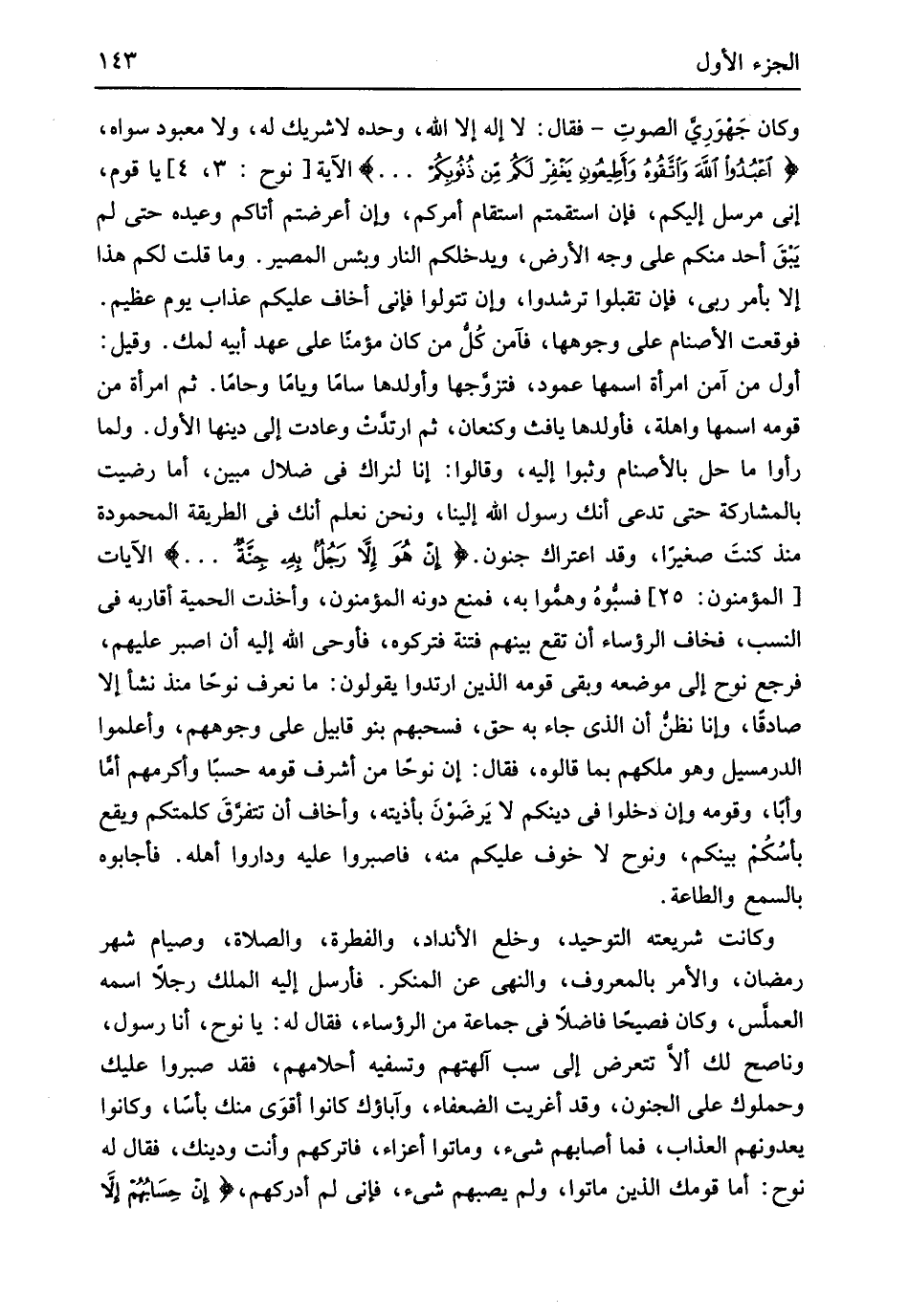 وَكَانَ جَهورِي الصَّوْت فَقَالَ لَا إِلَه إِلَّا الله وَحده لَا شريك لَهُ وَلَا معبود سواهُ {اعْبُدُواْ اللَّهَ وَاتَّقُوهُ وَأَطِيعُونِ يَغْفِرْ لَكُم مِن ذُنُوبِكُمْ} الْآيَة نوح 3 4 يَا قوم إِنِّي مُرْسل إِلَيْكُم فَإِن اسْتَقَمْتُمْ استقام أَمركُم وَإِن أعرضتم أَتَاكُم وعيده حَتَّى لم يبْق أحد مِنْكُم على وَجه الأَرْض ويدخلنكم النَّار وَبئسَ الْمصير وَمَا قلت لكم هَذَا إِلَّا بِأَمْر رَبِّي فَإِن تقبلُوا ترشدوا وَإِن تَتَوَلَّوْا فَإِنِّي أَخَاف عَلَيْكُم عَذَاب يَوْم عَظِيم فَوَقَعت الْأَصْنَام على وجوهها فَآمن كل من كَانَ مُؤمنا على عهد أَبِيه لمك وَقيل أول من آمن امْرَأَة اسْمهَا عَمُود فَتَزَوجهَا وأولدها ساماً وياماً وحاماً ثمَّ امْرَأَة من قومه اسْمهَا وَاهِلَة فأولدها يافث وكنعان ثمَّ ارْتَدَّت وعادت إِلَى دينهَا الأول وَلما رَأَوْا مَا حل بالأصنام وَثبُوا إِلَيْهِ وَقَالُوا إِنَّا لنراك فِي ضلال مُبين أما رضيت بالمشاركة حَتَّى تَدعِي أَنَّك رَسُول الله إِلَيْنَا وَنحن نعلم أَنَّك فِي الطَّرِيقَة الْمَحْمُود مُنْذُ كنت صَغِيرا وَقد اعتراك جُنُون {إِنْ هُوَ إِلاَّ رَجُلٌ بِهِ جِنَّةٌ} الْآيَات الْمُؤْمِنُونَ 25 فسبوه وهموا بِهِ فَمنع دونه الْمُؤْمِنُونَ وَأخذت الحمية أَقَاربه فِي النّسَب فخاف الرؤساء أَن تقع بَينهم فتْنَة فَتَرَكُوهُ فَأوحى الله إِلَيْهِ أَن اصبر عَلَيْهِم فَرجع نوح إِلَى مَوْضِعه وَبَقِي قومه الَّذين ارْتَدُّوا يَقُولُونَ مَا نَعْرِف نوحًا مُنْذُ نَشأ إِلَّا صَادِقا وَإِنَّا نظن أَن الَّذِي جَاءَ بِهِ حق فسحبهم بَنو قابيل على وُجُوههم وأعلموا الدرمسيل وَهُوَ ملكهم بِمَا قَالُوهُ فَقَالَ إِن نوحًا من أشرف قومه حسباً وَأكْرمهمْ أما وَأَبا وَقَومه وَإِن دخلُوا فِي دينكُمْ لَا يرضون بأذيته وأخاف أَن تتفرق كلمتكم وَيَقَع بأسكم بَيْنكُم ونوح لَا خوف عَلَيْكُم مِنْهُ فَاصْبِرُوا عَلَيْهِ وداروا أَهله فَأَجَابُوهُ بِالسَّمْعِ وَالطَّاعَة وَكَانَت شَرِيعَته التَّوْحِيد وخلع الأنداد والفطرة وَالصَّلَاة وَصِيَام شهر رَمَضَان وَالْأَمر بِالْمَعْرُوفِ وَالنَّهْي عَن الْمُنكر فَأرْسل إِلَيْهِ الْملك رجلا اسْمه العملس وَكَانَ فصيحاً فَاضلا فِي جمَاعَة من الرؤساء فَقَالَ لَهُ يَا نوح أَنا رَسُول وناصح لَك أَلا تتعرض إِلَى سبّ آلِهَتهم وتسفيه أحلامهم فقد صَبَرُوا عَلَيْك وحملوك على الْجُنُون وَقد أغريب الضُّعَفَاء وآباؤك كَانُوا أقوى مِنْك بَأْسا وَكَانُوا يعدونهم الْعَذَاب فَمَا أَصَابَهُم شَيْء وماتوا أعزاء فاتركهم وَأَنت وَدينك فَقَالَ لَهُ نوح أما قَوْمك الَّذين مَاتُوا وَلم يصبهم شَيْء فَإِنِّي لم أدركهم (إِنْ حِسَابُهُمْ إِلاَّ