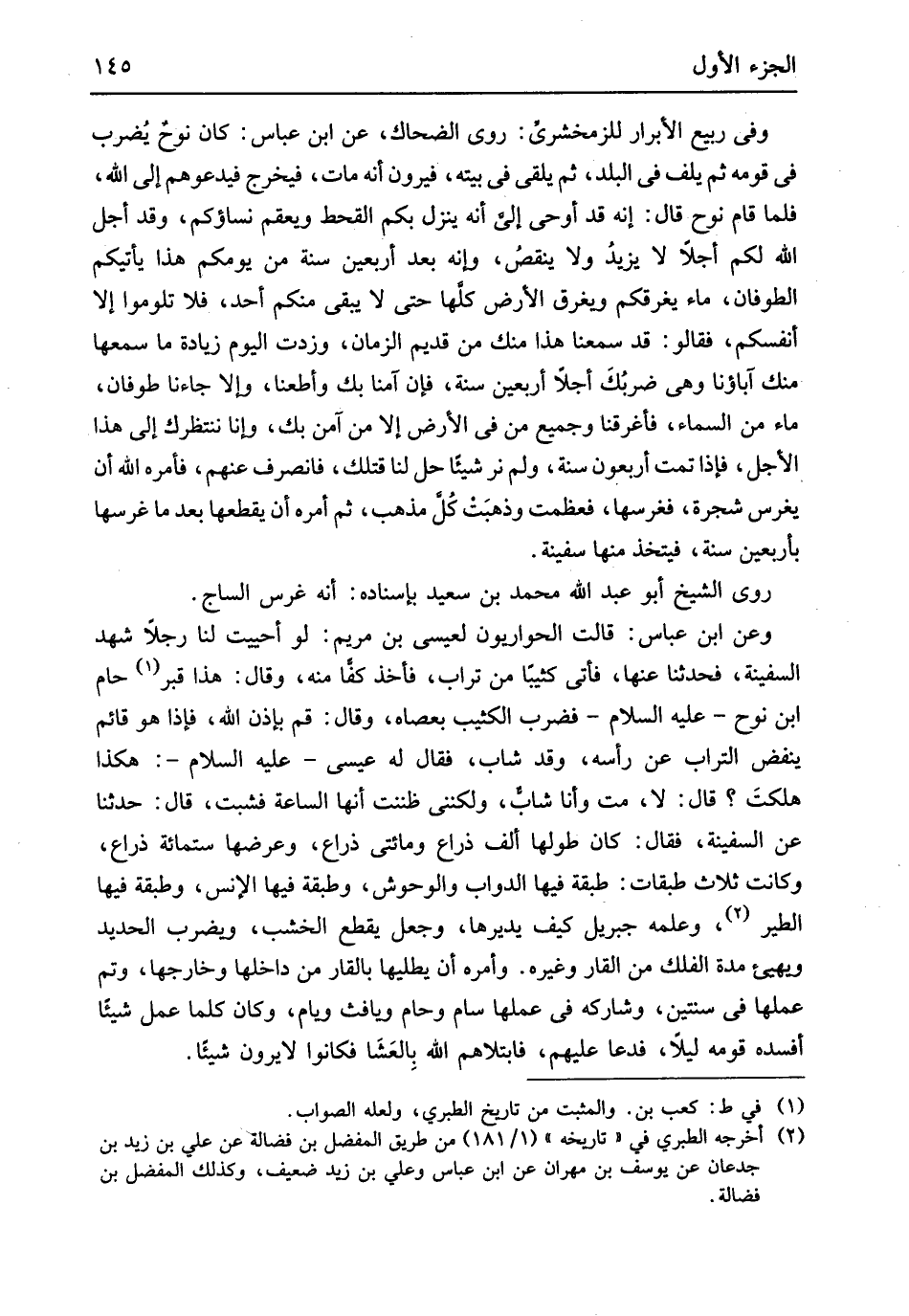 وَفِي ربيع الْأَبْرَار للزمخشري روى الضَّحَّاك عَن ابْن عَبَّاس كَانَ نوح يضْرب فِي قومه ثمَّ يلف فِي الْبَلَد ثمَّ يلقِي فِي بَيته فيرون أَنه مَاتَ فَيخرج فيدعوهم إِلَى الله فَلَمَّا قَامَ نوح قَالَ إِنَّه قد أوحى إِلَيّ أَنه ينزل بكم الْقَحْط ويعقم نِسَاؤُكُمْ وَقد أجل الله لكم أَََجَلًا لَا يزِيد وَلَا ينقص وَإنَّهُ بعد أَرْبَعِينَ سنة من يومكم هَذَا يأتيكم الطوفان مَاء يغرقكم ويغرق الأَرْض كلهَا حَتَّى لَا يبْقى مِنْكُم أحدا فَلَا تلوموا إِلَّا أَنفسكُم فَقَالُوا قد سمعنَا هَذَا مِنْك من قديم الزَّمَان وزدت الْيَوْم زِيَادَة مَا سَمعهَا مِنْك آبَاؤُنَا وَهِي ضربك أَََجَلًا أَرْبَعِينَ سنة فَإِن آمنا بك وأطعنا وَإِلَّا جَاءَنَا طوفان مَاء من السَّمَاء فأغرقنا وَجَمِيع من فِي الأَرْض إِلَّا من آمن بك وَإِنَّا ننتظرك إِلَى هَذَا الْأَجَل فَإِذا تمت أَرْبَعُونَ سنة وَلم نر شَيْئا حل لنا قَتلك فَانْصَرف عَنْهُم فَأمره الله أَن يغْرس شَجَرَة فغرسها فعظمت وَذَهَبت كل مَذْهَب ثمَّ أمره أَن يقطعهَا بعد مَا غرسها بِأَرْبَعِينَ سنة فيتخذ مِنْهَا سفينة روى الشَّيْخ أَبُو عبد الله مُحَمَّد بن سعيد بِإِسْنَادِهِ أَنه غرس الساج وَعَن ابْن عَبَّاس قَالَت الحواريون لعيسى بن مَرْيَم لَو أَحييت لنا رجلا شهد السَّفِينَة فحدثنا عَنْهَا فَأتى كثيباً من تُرَاب فَأخذ كفا مِنْهُ وَقَالَ هَذَا قبر حام ابْن نوح عَلَيْهِ السَّلَام فَضرب الْكَثِيب بعصاه وَقَالَ قُم بِإِذن الله فَإِذا هُوَ قَائِم ينفض التُّرَاب عَنهُ رَأسه وَقد شَاب فَقَالَ لَهُ عِيسَى عَلَيْهِ السَّلَام هَكَذَا هَلَكت قَالَ لَا مت وَأَنا شَاب ولكنني ظَنَنْت أَنَّهَا السَّاعَة فشبت قَالَ حَدثنَا عَن السَّفِينَة فَقَالَ كَانَ طولهَا ألف ذِرَاع ومائتي ذِرَاع وعرضها سِتّمائَة ذِرَاع وَكَانَت ثَلَاث طَبَقَات طبقَة فِيهَا الدَّوَابّ والوحوش وطبقة فِيهَا الْإِنْس وطبقة فِيهَا الطير وَعلمه جِبْرِيل كَيفَ يديرها وَجعل يقطع الْخشب وَيضْرب الْحَدِيد ويهيئ مُدَّة الْفلك من القار وَغَيره وَأمره أَن يطليها بالقار من داخلها وخارجها وَتمّ عَملهَا فِي سنتَيْن وشاركه فِي عَملهَا سَام وَحَام وَيَافث ويام وَكَانَ كلما عمل شَيْئا أفْسدهُ قومه لَيْلًا فَدَعَا عَلَيْهِم فَابْتَلَاهُمْ الله بالعشا فَكَانُوا لَا يرَوْنَ شَيْئا