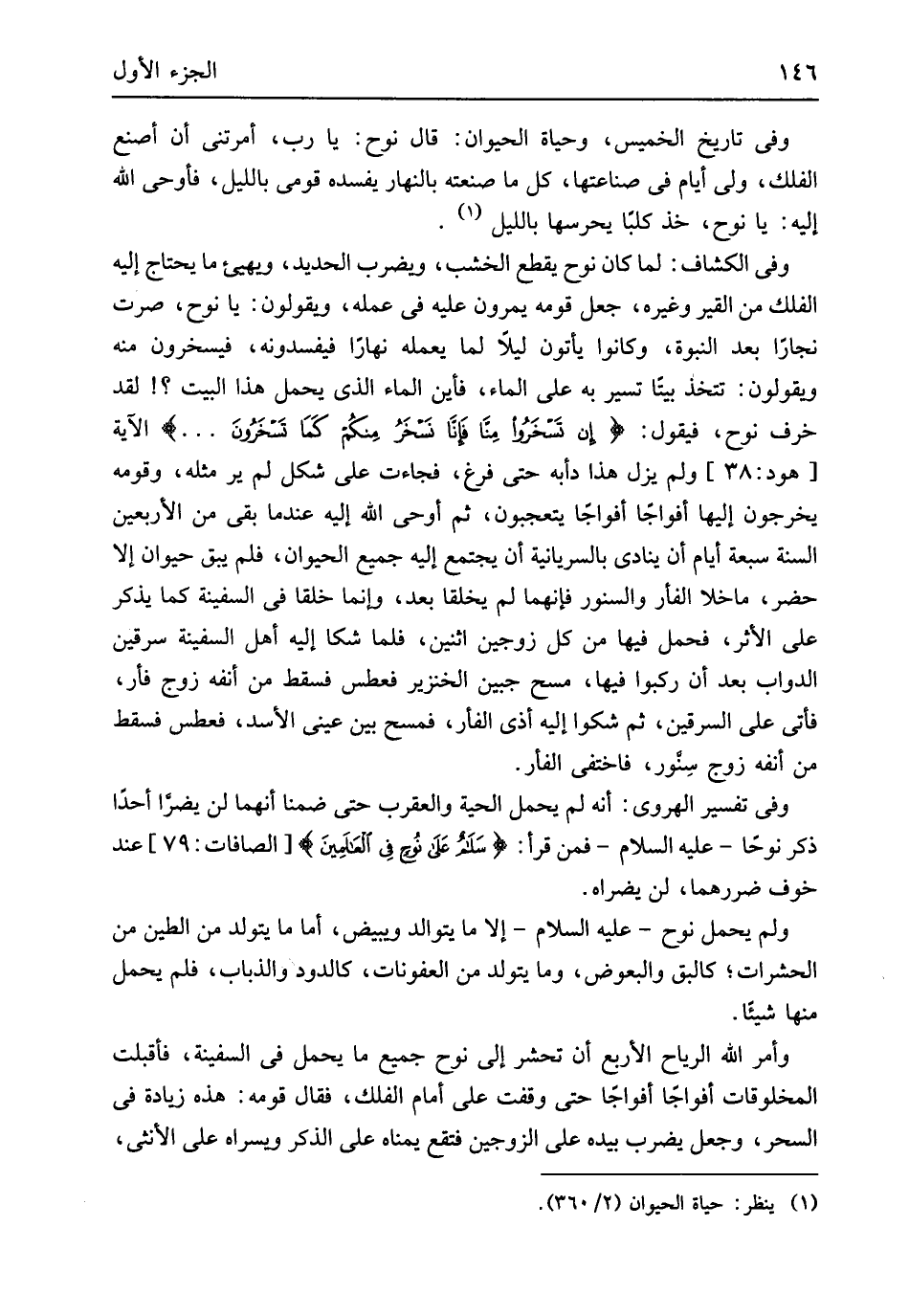 وَفِي تَارِيخ الْخَمِيس وحياة الْحَيَوَان قَالَ نوح يَا رب أَمرتنِي أَن أصنع الْفلك ولي أَيَّام فِي صناعتها كل مَا صَنعته بِالنَّهَارِ يُفْسِدهُ قومِي بِاللَّيْلِ فَأوحى الله إِلَيْهِ يَا نوح خُذ كَلْبا يحرسها بِاللَّيْلِ وَفِي الْكَشَّاف لما كَانَ نوح يقطع الْخشب وَيضْرب الْحَدِيد ويهيئ مَا يحْتَاج إِلَيْهِ الْفلك من القير وَغَيره جعل قومه يَمرونَ عَلَيْهِ فِي عمله وَيَقُولُونَ يَا نوح صرت نجاراً بعد النُّبُوَّة وَكَانُوا يأْتونَ لَيْلًا لما يعمله نَهَارا فيفسدونه فيسخرون مِنْهُ وَيَقُولُونَ تتَّخذ بَيْتا تسير بِهِ على المَاء فَأَيْنَ المَاء الَّذِي يحمل هَذَا الْبَيْت لقد خرف نوح فَيَقُول {إِن تَسْخَرُواْ مِنَّا فَإِنَّا نَسْخَرُ مِنكُمْ كَمَا تَسْخَرُونَ} الْآيَة هود 38 وَلم يزل هَذَا دأبه حَتَّى فرغ فَجَاءَت على شكل لم ير مثله وَقَومه يخرجُون إِلَيْهَا أَفْوَاجًا أَفْوَاجًا يتعجبون ثمَّ أوحى الله إِلَيْهِ عِنْدَمَا بَقِي من الْأَرْبَعين السّنة سَبْعَة أَيَّام أَن يُنَادي بالسُّرْيَانيَّة أَن يجْتَمع إِلَيْهِ جَمِيع الْحَيَوَان فَلم يبْق حَيَوَان إِلَّا حضر مَا خلا الفأر والسنور فَإِنَّهُمَا لم يخلقا بعد وَإِنَّمَا خلقا فِي السَّفِينَة كَمَا يذكر على الْأَثر فَحمل فِيهَا من كل زَوْجَيْنِ اثْنَيْنِ فَلَمَّا شكا إِلَيْهِ أهل السَّفِينَة سرقين الدَّوَابّ بعد أَن ركبُوا فِيهَا مسح جبين الْخِنْزِير فعطس فَسقط من أَنفه زوج فأر فَأتى على السرقين ثمَّ شكوا إِلَيْهِ أَذَى الفأر فَمسح بَين عَيْني الْأسد فعطس فَسقط من أَنفه زوج فأر فَأتى على السرقين ثمَّ شكوا إِلَيْهِ أَذَى الفأر فَمسح بَين عَيْني الْأسد فعطس فَسقط من أَنفه زوج سنور فاختفى الفأر وَفِي تَفْسِير الْهَرَوِيّ أَنه لم يحمل الْحَيَّة وَالْعَقْرَب حَتَّى ضمنا أَنَّهُمَا لن يضرا أحدا ذكر نوحًا عَلَيْهِ السَّلَام فَمن قَرَأَ {سَلام على نوح فِي الْعَالمين} الصافات 79 عِنْد خوف ضررهما لن يضراه وَلم يحمل نوح عَلَيْهِ السَّلَام إِلَّا مَا يتوالد ويبيض أما مَا يتَوَلَّد من الطين من الحشرات كالبق والبعوض وَمَا يتَوَلَّد من العفونات كالدود والذباب فَلم يحمل مِنْهَا شَيْئا وَأمر الله الرِّيَاح الْأَرْبَع أَن تحْشر إِلَى نوح جَمِيع مَا يحمل فِي السَّفِينَة فَأَقْبَلت الْمَخْلُوقَات أَفْوَاجًا أَفْوَاجًا حَتَّى وقفت على أَمَام الْفلك فَقَالَ قومه هَذِه زِيَادَة فِي السحر وَجعل يضْرب بِيَدِهِ على الزَّوْجَيْنِ فَتَقَع يمناه على الذّكر ويسراه على الْأُنْثَى