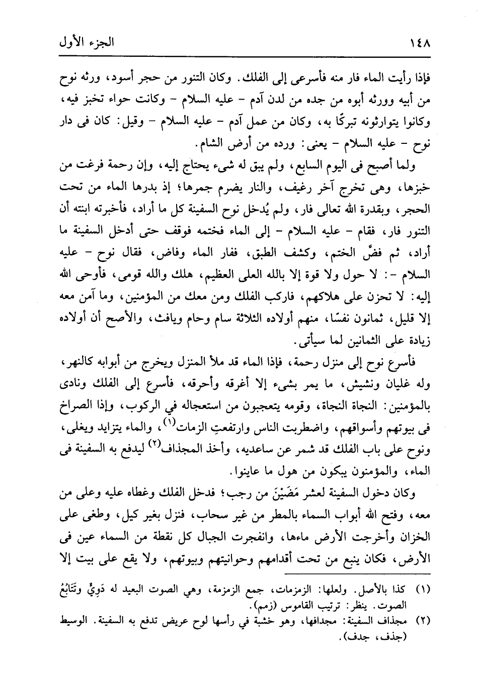 فَإِذا رَأَيْت المَاء فار مِنْهُ فأسرعي إِلَى الْفلك وَكَانَ التَّنور من حجر أسود وَرثهُ نوح من أَبِيه وَورثه أَبوهُ من جده من لدن آدم عَلَيْهِ السَّلَام وَكَانَت حَوَّاء تخبز فِيهِ وَكَانُوا يتوارثونه تبركاً بِهِ وَكَانَ من عمل آدم عَلَيْهِ السَّلَام وَقيل كَانَ فِي دَار نوح عَلَيْهِ السَّلَام يَعْنِي ورده من أَرض الشَّام وَلما أصبح فِي الْيَوْم السَّابِع وَلم يبْق لَهُ شَيْء يحْتَاج إِلَيْهِ وَإِن رَحْمَة فرغت من خبزها وَهِي تخرج آخر رغيف وَالنَّار يضرم جمرها إِذْ بدرها المَاء من تَحت الْحجر وبقدرة الله تَعَالَى فار وَلم يدْخل نوح السَّفِينَة كل مَا أَرَادَ فَأَخْبَرته ابْنَته أَن التَّنور فار فَقَامَ عَلَيْهِ السَّلَام إِلَى المَاء فختمه فَوقف حَتَّى أَدخل السَّفِينَة مَا أَرَادَ ثمَّ فض الْخَتْم وكشف الطَّبَق ففار المَاء وفاض فَقَالَ نوح عَلَيْهِ السَّلَام لَا حول وَلَا قُوَّة إِلَّا بِاللَّه الْعلي الْعَظِيم هلك وَالله قومِي فَأوحى الله إِلَيْهِ لَا تحزن على هلاكهم فاركب الْفلك وَمن مَعَك من الْمُؤمنِينَ وَمَا آمن مَعَه إِلَّا قَلِيل ثَمَانُون نفسا مِنْهُم أَوْلَاده الثَّلَاثَة سَام وَحَام وَيَافث وَالأَصَح أَن أَوْلَاده زِيَادَة على الثَّمَانِينَ لما سَيَأْتِي فأسرع نوح إِلَى منزل رَحْمَة فَإِذا المَاء قد مَلأ الْمنزل وَيخرج من أبوابه كالنهر وَله غليان ونشيش مَا يمر بِشَيْء إِلَّا أغرقه وَأحرقهُ فأسرع إِلَى الْفلك ونادى بِالْمُؤْمِنِينَ النجَاة النجَاة وَقَومه يتعجبون من استعجاله فِي الرّكُوب وَإِذا الصُّرَاخ فِي بُيُوتهم وأسواقهم واضطربت النَّاس وَارْتَفَعت الزمات وَالْمَاء يتزايد ويغلي ونوح على بَاب الْفلك قد شمر عَن ساعديه وَأخذ المجذاف ليدفع بِهِ السَّفِينَة فِي المَاء والمؤمنون يَبْكُونَ من هول مَا عاينوا وَكَانَ دُخُول السَّفِينَة لعشر مضين من رَجَب فَدخل الْفلك وغطاه عَلَيْهِ وعَلى من مَعَه وَفتح الله أَبْوَاب السَّمَاء بالمطر من غير سَحَاب فَنزل بعير كيل وطغى على الْخزَّان وأخرجت الأَرْض ماءها وانفجرت الْجبَال كل نقطة من السَّمَاء عين فِي الأَرْض فَكَانَ نبع من تَحت أَقْدَامهم وحوانيتهم وَبُيُوتهمْ وَلَا يَقع على بَيت إِلَّا