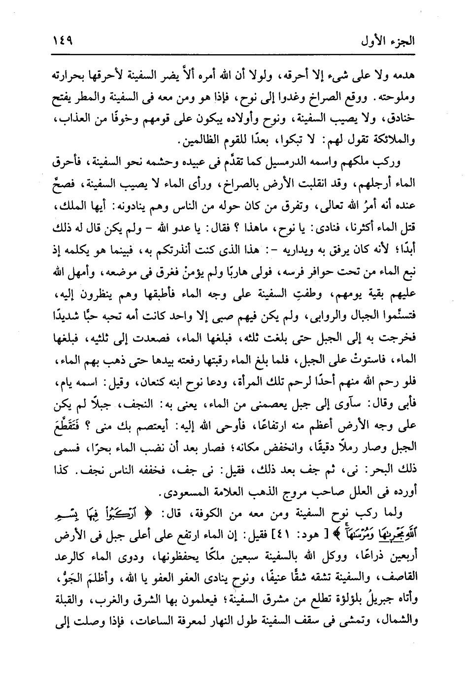 هدمة وَلَا على شَيْء إِلَّا أحرقه وَلَوْلَا أَن الله أمره أَلا يضر السَّفِينَة لأحرقها بحرارته وملوحته وَوَقع الصُّرَاخ وغدوا إِلَى نوح فَإِذا هُوَ وَمن مَعَه فِي السَّفِينَة والمطر يفتح خنادق وَلَا يُصِيب السَّفِينَة ونوح وَأَوْلَاده يَبْكُونَ على قَومهمْ وخوفاً من الْعَذَاب وَالْمَلَائِكَة تَقول لَهُم لَا تبكوا بعدا للْقَوْم الظَّالِمين وَركب ملكهم واسْمه الدرمسيل كَمَا تقدم فِي عبيده وحشمه نَحْو السَّفِينَة فَأحرق المَاء أَرجُلهم وَقد انقلبت الأَرْض بالصراخ وَرَأى المَاء لَا يُصِيب السَّفِينَة فصح عِنْده أَنه أَمر الله تَعَالَى وتفرق من كَانَ حوله من النَّاس وهم يُنَادُونَهُ أَيهَا الْملك قتل المَاء أكثرنا فَنَادَى يَا نوح مَا هَذَا فَقَالَ يَا عَدو الله وَلم يكن قَالَ لَهُ ذَلِك أبدا لِأَنَّهُ كَانَ يرفق بِهِ ويداريه هَذَا الَّذِي كنت أَنْذَرْتُكُمْ بِهِ فَبَيْنَمَا هُوَ يكلمهُ إِذْ نبع المَاء من تَحت حوافر فرسه فولى هَارِبا وَلم يُؤمن فغرق فِي مَوْضِعه وأمهل الله عَلَيْهِم بَقِيَّة يومهم وطفت السَّفِينَة على وَجه المَاء فأطبقها وهم ينظرُونَ إِلَيْهِ فتسنموا الْجبَال والروابي وَلم يكن فيهم صبي إِلَّا وَاحِد كَانَت أمه تحبه حبا شَدِيدا فَخرجت بِهِ إِلَى الْجَبَل حَتَّى بلغت ثلثه فبلغها المَاء فَصَعدت إِلَى ثُلثَيْهِ فبلغها المَاء فاستوت على الْجَبَل فَلَمَّا بلغ المَاء رقبَتهَا رفعته بِيَدِهَا حَتَّى ذهب بهم المَاء فَلَو رحم الله مِنْهُم أحدا لرحم تِلْكَ الْمَرْأَة ودعا نوح ابْنه كنعان وَقيل اسْمه يام فَأبى وَقَالَ سآوي إِلَى جبل يعصمني من المَاء يَعْنِي بِهِ النجف جبلا لم يكن على وَجه الأَرْض أعظم مِنْهُ ارتفاعاً فَأوحى الله إِلَيْهِ أيعتصم بك منى فتقطع الْجَبَل وَصَارَ رملاً دَقِيقًا وانخفض مَكَانَهُ فَصَارَ بعد أَن نضب المَاء بحراً فَسمى ذَلِك الْبَحْر نى ثمَّ جف بعد ذَلِك فَقيل ني جف فخففه النَّاس نجف كَذَا أوردهُ فِي الْعِلَل صَاحب مروج الذَّهَب الْعَلامَة المَسْعُودِيّ وَلما ركب نوح السَّفِينَة وَمن مَعَه من الْكُوفَة قَالَ {ارْكَبُواْ فِيهَا بِسم الله مجْراهَا وَمرْسَاهَا} هود 41 فَقيل إِن المَاء ارْتَفع على أَعلَى جبل فِي الأَرْض أَرْبَعِينَ ذِرَاعا ووكل الله بالسفينة سبعين ملكا يحفظونها ودوى المَاء كالرعد القاصف والسفينة تشقه شقاً عنيفاً ونوح يُنَادي الْعَفو الْعَفو يَا الله وأظلم الجو وَأَتَاهُ جِبْرِيل بلؤلؤة تطلع من مشرق السَّفِينَة فيعلمون بهَا الشرق والغرب والقبلة وَالشمَال وتمشى فِي سقف السَّفِينَة طول النَّهَار لمعْرِفَة السَّاعَات فَإِذا وصلت إِلَى