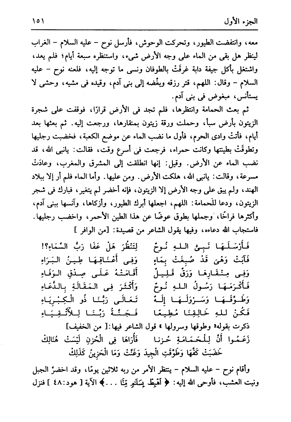 مَعَه وانفضت الطُّيُور وتحركت الوحوش فَأرْسل نوح عَلَيْهِ السَّلَام الْغُرَاب لينْظر هَل بَقِي من المَاء على وَجه الأَرْض شَيْء واستنظره سَبْعَة أَيَّام فَلم يعد واشتغل بِأَكْل جيفة دَابَّة غرقت بالطوفان وَنسي مَا توجه إِلَيْهِ فلعنه نوح عَلَيْهِ السَّلَام وَقَالَ اللَّهُمَّ قتر رزقه وبغضه إِلَى بني آدم وَقَيده فِي مَشْيه وَحشِي لَا يسْتَأْنس مبغوض فِي بني آدم ثمَّ بعث الْحَمَامَة وانتظرها فَلم تَجِد فِي الأَرْض قراراً فوقفت على شَجَرَة الزَّيْتُون بِأَرْض سبأ وحملت ورقة زيتون بمنقارها وَرجعت إِلَيْهِ ثمَّ بعثها بعد أَيَّام فَأَتَت وَادي الْحرم فَأول مَا نضب المَاء عَن مَوضِع الْكَعْبَة فخضبت رِجْلَيْهَا وتطوقت بطينتها وَكَانَت حَمْرَاء فَرَجَعت فِي أسْرع وَقت فَقَالَت يَا نَبِي الله قد نضب المَاء عَن الأَرْض وَقيل إِنَّهَا انْطَلَقت إِلَى الْمشرق وَالْمغْرب وعادت مسرعة وَقَالَت يَا نَبِي الله هَلَكت الأَرْض وَمن عَلَيْهَا وَأما المَاء فَلم أر إِلَّا بِبِلَاد الْهِنْد وَلم يبْق على وَجه الأَرْض إِلَّا الزَّيْتُون فَإِنَّهُ أَخْضَر لم يتَغَيَّر فَبَارك فِي شجر الزَّيْتُون ودعا للحمامة اللَّهُمَّ اجْعَلْهَا أبرك الطُّيُور وأزكاها وآنسها ببني آدم وأكثرها فراخا وَجَمعهَا بطوق عوضا عَن هَذَا الطين الْأَحْمَر واخضب رِجْلَيْهَا فَاسْتَجَاب الله دعاءه وفيهَا يَقُول الشَّاعِر من قصيدة // (من الوافر) //