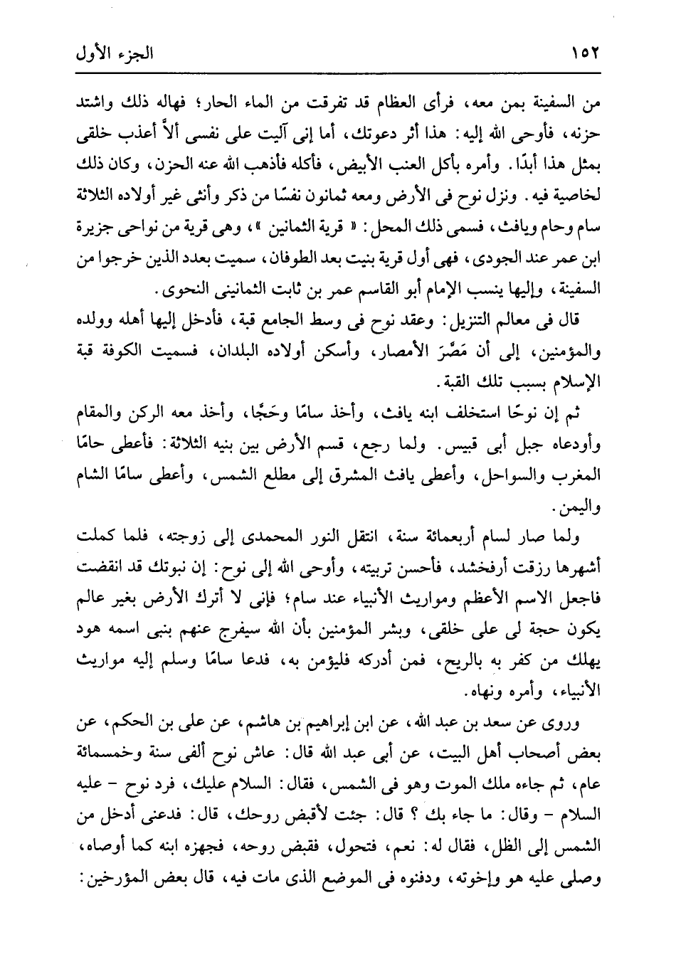 من السَّفِينَة بِمن مَعَه فَرَأى الْعِظَام قد تَفَرَّقت من المَاء الْحَار فهاله ذَلِك وَاشْتَدَّ حزنه فَأوحى الله إِلَيْهِ هَذَا أثر دعوتك أما إِنِّي آلَيْت على نَفسِي أَلا أعذب خلقي بِمثل هَذَا أبدا وَأمره بِأَكْل الْعِنَب الْأَبْيَض فَأَكله فَأذْهب الله عَنهُ الْحزن وَكَانَ ذَلِك لخاصية فِيهِ وَنزل نوح فِي الأَرْض وَمَعَهُ ثَمَانُون نفسا من ذكر وَأُنْثَى غير أَوْلَاده الثَّلَاثَة سَام وَحَام وَيَافث فَسمى ذَلِك الْمحل قَرْيَة الثَّمَانِينَ وَهِي قَرْيَة من نواحي جَزِيرَة ابْن عمر عِنْد الجودى فَهِيَ أول قَرْيَة بنيت بعد الطوفان سميت بِعَدَد الَّذين خَرجُوا من السَّفِينَة وإليها ينْسب الإِمَام أَبُو الْقَاسِم عمر بن ثَابت الثمانيني النَّحْوِيّ قَالَ فِي معالم التَّنْزِيل وَعقد نوح فِي وسط الْجَامِع قبَّة فَأدْخل إِلَيْهَا أَهله وَولده وَالْمُؤمنِينَ إِلَى أَن مصر الْأَمْصَار وأسكن أَوْلَاده الْبلدَانِ فسميت الْكُوفَة قبَّة الْإِسْلَام بِسَبَب تِلْكَ الْقبَّة ثمَّ إِن نوحًا اسْتخْلف ابْنه يافث وَأخذ ساماً وحجا وَأخذ مَعَه الرُّكْن وَالْمقَام وأودعاه جبل أبي قبيس وَلما رَجَعَ قسم الأَرْض بَين بنيه الثَّلَاثَة فَأعْطى حاماً الْمغرب والسواحل وَأعْطى يافث الْمشرق إِلَى مطلع الشَّمْس وَأعْطى ساماً الشَّام واليمن وَلما صَار لسام أَرْبَعمِائَة سنة انْتقل النُّور المحمدي إِلَى زَوجته فَلَمَّا كملت أشهرها رزقت أرفخشد فَأحْسن تَرْبِيَته وَأوحى الله إِلَى نوح إِن نبوتك قد انْقَضتْ فَاجْعَلْ الِاسْم الْأَعْظَم ومواريث الْأَنْبِيَاء عِنْد سَام فَإِنِّي لَا أترك الأَرْض بِغَيْر عَالم يكون حجَّة لي على خلقي وَبشر الْمُؤمنِينَ بِأَن الله سيفرج عَنْهُم بِنَبِي اسْمه هود يهْلك من كفر بِهِ بِالرِّيحِ فَمن أدْركهُ فليؤمن بِهِ فَدَعَا ساماً وَسلم إِلَيْهِ مَوَارِيث الْأَنْبِيَاء وَأمره وَنَهَاهُ وروى عَن سعد بن عبد الله عَن ابْن إِبْرَاهِيم بن هَاشم عَن عَليّ بن الحكم عَن بعض أَصْحَاب أهل الْبَيْت عَن أبي عبد الله قَالَ عَاشَ نوح ألفي سنة وَخَمْسمِائة عَام ثمَّ جَاءَهُ ملك الْمَوْت وَهُوَ فِي الشَّمْس فَقَالَ السَّلَام عَلَيْك فَرد نوح عَلَيْهِ السَّلَام وَقَالَ مَا جَاءَ بك قَالَ جِئْت لأقبض روحك قَالَ فَدَعْنِي أَدخل من الشَّمْس إِلَى الظل فَقَالَ لَهُ نعم فتحول فَقبض روحه فجهزه ابْنه كَمَا أوصاه وَصلى عَلَيْهِ هُوَ وَإِخْوَته ودفنوه فِي الْموضع الَّذِي مَاتَ فِيهِ قَالَ بعض المؤرخين