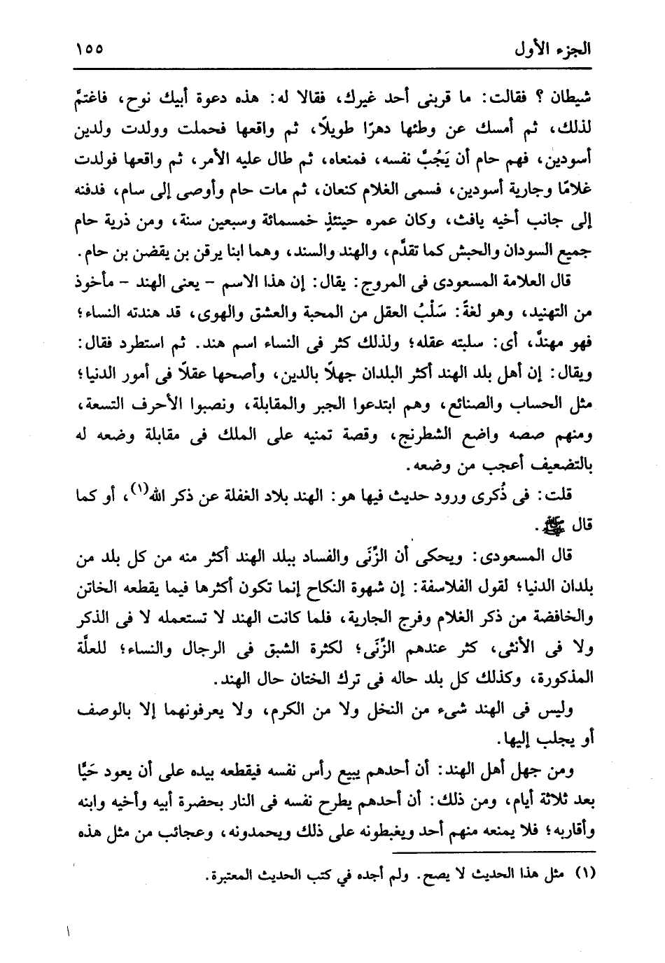 قَالَ المَسْعُودِيّ ويحكى أَن الزِّنَى وَالْفساد بِبَلَد الْهِنْد أَكثر مِنْهُ من كل بلد من بلدان الدُّنْيَا لقَوْل الفلاسفة إِن شَهْوَة النِّكَاح إِنَّمَا تكون أَكْثَرهَا فِيمَا يقطعهُ الخاتن والخافضة من ذكر الْغُلَام وَفرج الْجَارِيَة فَلَمَّا كَانَت الْهِنْد لَا تستعمله لَا فِي الذّكر وَلَا فِي الْأُنْثَى كثر عِنْدهم الزِّنَى لِكَثْرَة الشبق فِي الرِّجَال وَالنِّسَاء لِلْعِلَّةِ الْمَذْكُورَة وَكَذَلِكَ كل بلد حَاله فِي ترك الْخِتَان حَال الْهِنْد وَلَيْسَ فِي الْهِنْد شَيْء من النّخل وَلَا من الْكَرم وَلَا يعرفونهما إِلَّا بِالْوَصْفِ أَو يجلب إِلَيْهَا وَمن جهل أهل الْهِنْد أَن أحدهم يَبِيع رَأس نَفسه فيقطعه بِيَدِهِ على أَن يعود حَيا بعد ثَلَاثَة أَيَّام وَمن ذَلِك أَن أحدهم يطْرَح نَفسه فِي النَّار بِحَضْرَة أَبِيه وأخيه وَابْنه وأقاربه فَلَا يمنعهُ مِنْهُم أحد ويغبطونه على ذَلِك ويحمدونه وعجائب من مثل هَذِه