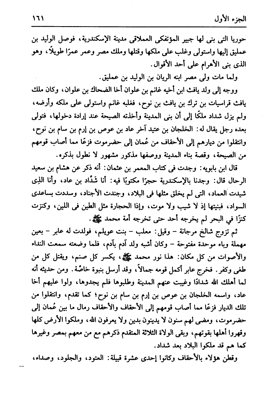 يكسر كل صنم وَيقتل كل من طَغى وَكفر فَخرج عَابِر أكمل قومه جمالاً وَقد أرسل بنبوة خَاصَّة وَمن حَدِيثه أَنه لماء أهلك الله شداداً وغيبت عَنْهُم الْمَدِينَة وطلبوها فَلم يجدوها ولوا عَلَيْهِم أَخا عَاد واسْمه الخلجان بن عوص بن إرم بن سَام بن نوح كَمَا تقدم وانتقلوا من تِلْكَ الديار فَزعًا مِمَّا أصَاب قَومهمْ إِلَى الْأَحْقَاف والأحقاف رمال مَا بَين عمان إِلَى حَضرمَوْت وَمضى لَهُم سنُون لَا يدينون بدين وَلَا يعْرفُونَ الله وملكوا الأَرْض كلهَا وقهروا أَهلهَا بقوتهم وَبَقِي الْوُلَاة الثَّلَاثَة الْمُتَقَدّم ذكرهم مَعَ من مَعَهم بِمصْر وَغَيرهَا كَمَا هم قد ملكوا الْبِلَاد بعد شَدَّاد وقطن هَؤُلَاءِ بالأحقاف وَكَانُوا إِحْدَى عشرَة قَبيلَة العتود والجلود وصداء