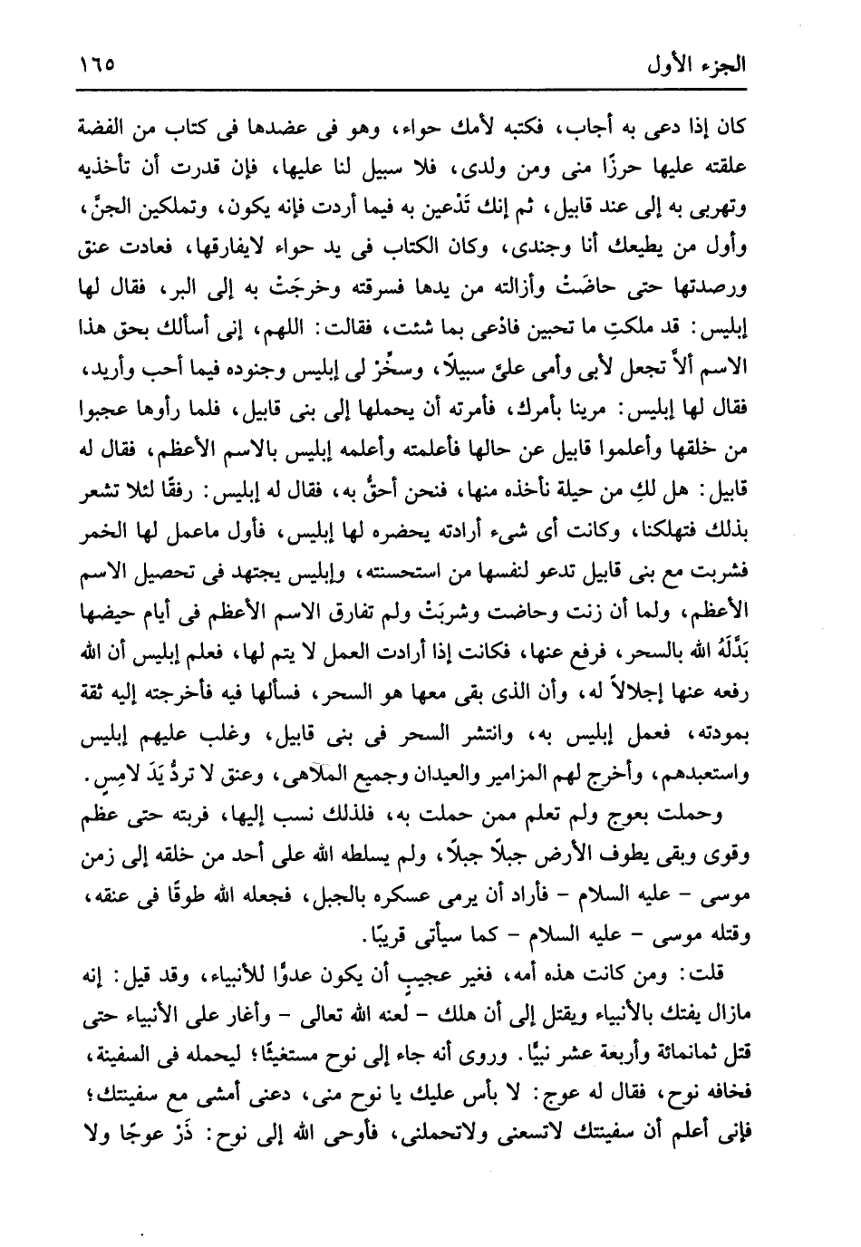 كَانَ إِذا دعِي بِهِ أجَاب فَكَتبهُ لأمك حَوَّاء وَهُوَ فِي عضدها فِي كتاب من الْفضة علقته عَلَيْهَا حرْزا مني وَمن وَلَدي فَلَا سَبِيل لنا عَلَيْهَا فَإِن قدرت أَن تأخذيه وتهربي بِهِ إِلَى عِنْد قابيل ثمَّ إِنَّك تدعين بِهِ فِيمَا أردْت فَإِنَّهُ يكون وتملكين الْجِنّ وَأول من يطيعك أَنا وجندي وَكَانَ الْكتاب فِي يَد حَوَّاء لَا يفارقها فَعَادَت عنق ورصدتها حَتَّى حَاضَت وأزالته من يَدهَا فسرقته وَخرجت بِهِ إِلَى الْبر فَقَالَ لَهَا إِبْلِيس قد ملكت مَا تحبين فادعي بِمَا شِئْت فَقَالَت اللَّهُمَّ إِنِّي أَسأَلك بِحَق هَذَا الِاسْم أَلا تجْعَل لأبي وَأمي عَليّ سَبِيلا وسخر لي إِبْلِيس وَجُنُوده فِيمَا أحب وَأُرِيد فَقَالَ لَهَا إِبْلِيس مرينا بِأَمْرك فَأَمَرته أَن يحملهَا إِلَى بني قابيل فَلَمَّا رأوها عجبوا من خلقهَا وأعلموا قابيل عَن حاليها فأعلمته وأعلمه إِبْلِيس بِالِاسْمِ الْأَعْظَم فَقَالَ لَهُ قابيل هَل لَك من حِيلَة نَأْخُذهُ مِنْهَا فَنحْن أَحَق بِهِ فَقَالَ لَهُ إِبْلِيس رفقا لِئَلَّا تشعر بذلك فتهلكنا وَكَانَت أَي شَيْء أَرَادَتْهُ يحضرهُ لَهَا إِبْلِيس فَأول مَا عمل لَهَا الْخمر فَشَرِبت مَعَ بني قابيل تَدْعُو لنَفسهَا من استحسنته وإبليس يجْتَهد فِي تَحْصِيل الِاسْم الْأَعْظَم وَلما أَن زنت وحاضت وشربت وَلم تفارق الِاسْم الْأَعْظَم فِي أَيَّام حَيْضهَا بدله الله بِالسحرِ فَرفع عَنْهَا فَكَانَت إِذا أَرَادَت الْعَمَل لَا يتم لَهَا فَعلم إِبْلِيس أَن الله رَفعه عَنْهَا إجلالاً لَهُ وَأَن الَّذِي بَقِي مَعهَا هُوَ السحر فَسَأَلَهَا فِيهِ فَأَخْرَجته إِلَيْهِ ثِقَة بمودته فَعمل إِبْلِيس بِهِ وانتشر السحر فِي بني قابيل وَغلب عَلَيْهِم إِبْلِيس واستعبدهم وَأخرج لَهُم المزامير والعيدان وَجَمِيع الملاهي وعنق لَا ترد يَد لامس وحملت بعوج وَلم تعلم مِمَّن حملت بِهِ فَلذَلِك نسب إِلَيْهَا فربته حَتَّى عظم وَقَوي وَبَقِي يطوف الأَرْض جبلا جبلا وَلم يُسَلِّطهُ الله على أحد من خلقه إِلَى زمن مُوسَى عَلَيْهِ السَّلَام فَأَرَادَ أَن يَرْمِي عسكره بِالْجَبَلِ فَجعله الله طوقاً فِي عُنُقه وَقَتله مُوسَى عَلَيْهِ السَّلَام كَمَا سَيَأْتِي قَرِيبا قلت وَمن كَانَت هَذِه أمه فَغير عَجِيب أَن يكون عدوا للأنبياء وَقد قيل إِنَّه مَا زَالَ يفتك بالأنبياء وَيقتل إِلَى أَن هلك لَعنه الله تَعَالَى وأغار على الْأَنْبِيَاء حَتَّى قتل ثَمَانمِائَة وَأَرْبَعَة ع شَرّ نَبيا وروى أَنه جَاءَ إِلَى نوح مستغيثاً ليحمله فِي السَّفِينَة فخافه نوح فَقَالَ لَهُ عوج لَا بَأْس عَلَيْك يَا نوح مني دَعْنِي أَمْشِي مَعَ سفينتك فَإِنِّي أعلم أَن سفينتك لَا تسعني وَلَا تحملنِي فَأوحى الله إِلَى نوح ذَر عوجا وَلَا