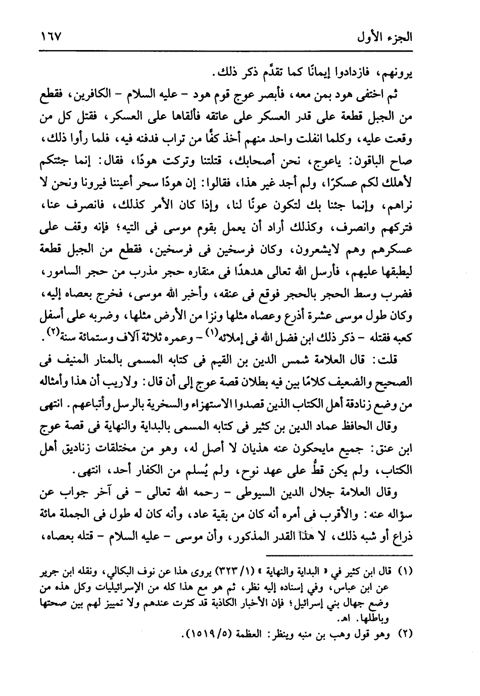 يرونهم فازدادوا إِيمَانًا كَمَا تقدم ذكر ذَلِك ثمَّ اختفى هود بِمن مَعَه فأبصر عوج قوم هود عَلَيْهِ السَّلَام الْكَافرين فَقطع من الْجَبَل قِطْعَة على قدر الْعَسْكَر على عَاتِقه فألقاها على الْعَسْكَر فَقتل كل من وَقعت عَلَيْهِ وَكلما انفلت وَاحِد مِنْهُم أَخذ كفا من تُرَاب فدفنه فِيهِ فَلَمَّا رَأَوْا ذَلِك صَاح الْبَاقُونَ يَا عوج نَحن أَصْحَابك قتلتنا وَتركت هودا فَقَالَ إِنَّمَا جِئتُكُمْ لأهْلك لكم عسكراً وَلم أجد غير هَذَا فَقَالُوا إِن هوداً سحر اعيننان فيرونا وَنحن لَا نراهم وَإِنَّمَا جِئْنَا بك لتَكون عوناً لنا وَإِذا كَانَ الْأَمر كَذَلِك فَانْصَرف عَنَّا فتركهم وَانْصَرف وَكَذَلِكَ أَرَادَ أَن يعْمل بِقوم مُوسَى فِي التيه فَإِنَّهُ وقف على عَسْكَرهمْ وهم لَا يعشرُونَ وَكَانَ فرسخين فِي فرسخين فَقطع من الْجَبَل قِطْعَة ليطقبها عَلَيْهِم فَأرْسل الله تَعَالَى هدهداً فِي منقاره حجر مذرب من ججر السامور فَضرب وسط الْحجر بِالْحجرِ فَوَقع فِي عُنُقه وَأخْبر الله مُوسَى فَخرج بعصاه إِلَيْهِ وَكَانَ طول مُوسَى عشرَة أَذْرع وَعَصَاهُ مثلهَا ونزا من الأَرْض مثلهَا وضربه على أَسْفَل كَعبه فَقتله ذكر ذَلِك ابْن فضل الله فِي إمْلَائِهِ وعمره ثَلَاثَة آلَاف وسِتمِائَة سنة قلت قَالَ الْعَلامَة شمس الدّين بن الْقيم فِي كِتَابه الْمُسَمّى بالمنار المنيف فِي الصَّحِيح والضعيف كلَاما يبين فِيهِ بطلَان قصَّة عوج إِلَى أَن قَالَ وَلَا ريب أَن هَذَا وَأَمْثَاله من وضع زنادقة أهل الْكتاب الَّذين قصدُوا الِاسْتِهْزَاء والسخرية بالرسل وأتباعهم انْتهى وَقَالَ الْحَافِظ عماد الدّين بن كثير فِي كِتَابه الْمُسَمّى بالبداية وَالنِّهَايَة فِي قصَّة عوج ابْن عنق جَمِيع مَا يحكون عَنهُ هذيان لَا أصل لَهُ وَهُوَ من مختلقات زناديق أهل الْكتاب وَلم يكن قطّ على عهد نوح وَلم يسلم من الْكفَّار أحدا انْتهى وَقَالَ الْعَلامَة جلال الدّين السُّيُوطِيّ رَحمَه الله تَعَالَى فِي آخر جَوَاب عَن سُؤَاله عَنهُ وَالْأَقْرَب فِي أمره أَنه كَانَ من بَقِيَّة عَاد وَأَنه كَانَ لَهُ طول فِي الْجُمْلَة مائَة ذِرَاع أَو اشبه ذَلِك لَا هَذَا الْقدر الْمَذْكُور وَأَن مُوسَى عَلَيْهِ السَّلَام قَتله بعصاه