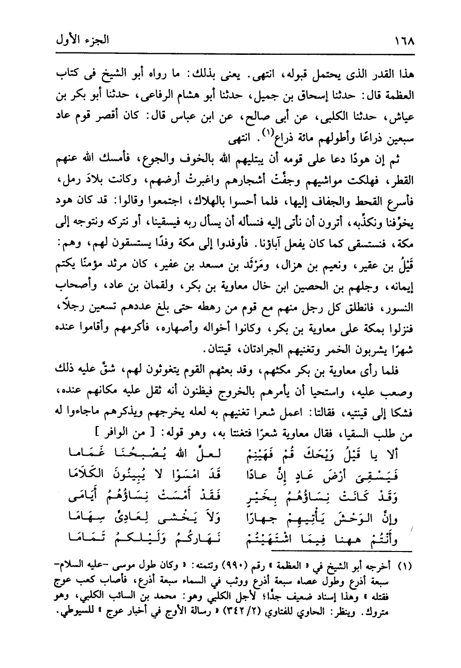 حذف هَذَا الْقدر الَّذِي يحْتَمل قبُوله انْتهى يَعْنِي بذلك مَا رَوَاهُ أَبُو الشَّيْخ فِي كتاب العظمة قَالَ حَدثنَا إِسْحَاق بن جميل حَدثنَا أَبُو هِشَام الرِّفَاعِي حَدثنَا أَبُو بكر بن عَيَّاش حَدثنَا الْكَلْبِيّ عَن أبي صَالح عَن ابْن عَبَّاس قَالَ كَانَ أقصر قوم عَاد سبعين ذراعان وأطولهم مائَة ذِرَاع انْتهى ثمَّ إِن هوداً دَعَا على قومه أَن يبتليهم الله بالخوف والجوع فَأمْسك الله عَنْهُم الْقطر فَهَلَكت مَوَاشِيهمْ وجفت أَشْجَارهم واغبرت أَرضهم وَكَانَت بِلَاد رمل فأسرع الْقَحْط والجفاف إِلَيْهَا فَلَمَّا أحسوا بِالْهَلَاكِ اجْتَمعُوا وَقَالُوا قد كَانَ هود يخوفنا ونكذبه أَتَرَوْنَ أَن نأتي إِلَيْهِ فنسأله أَن يسْأَل ربه فيسقينا أَو نتركه ونتوجه إِلَى مَكَّة فنستسقي كَمَا كَانَ يفعل آبَاؤُنَا فأوفدوا إِلَى مَكَّة وَفْدًا يستسقون لَهُم وهم قيل بن عقير ونعيم بن هزال ومرثد بن مسعد بن عفير كَانَ مرْثَد مُؤمنا يكتم إيمَانه وجلهم بن الْحصين ابْن خَال مُعَاوِيَة بن بكر ولقمان بن عَاد وَأَصْحَاب النسور فَانْطَلق كل رجل مِنْهُم مَعَ قوم من رهطه حَتَّى بلغ عَددهمْ تسعين رجلا فنزلوا بِمَكَّة على مُعَاوِيَة بن بكر وَكَانُوا أَخْوَاله وأصهاره فأكرمهم وَأَقَامُوا عِنْده شهرا يشربون الْخمر وتغنيهم الجرادتان قينتان فَلَمَّا رأى مُعَاوِيَة بن بكر مكثهم وَقد بَعثهمْ الْقَوْم يتغوثون لَهُم شقّ عَلَيْهِ ذَلِك وصعب عَلَيْهِ واستحيا أَن يَأْمُرهُم بِالْخرُوجِ فيظنون أَنه ثقل عَلَيْهِ مكانهم عِنْده فَشَكا إِلَى قينتيه فَقَالَتَا اعْمَلْ شعرًا تغنيهم بِهِ لَعَلَّه يخرجهم وَيذكرهُمْ مَا جَاءُوا لَهُ من طلب السقيا فَقَالَ مُعَاوِيَة شعرًا فتغنتا بِهِ وَهُوَ قَوْله // (من الوافر) //