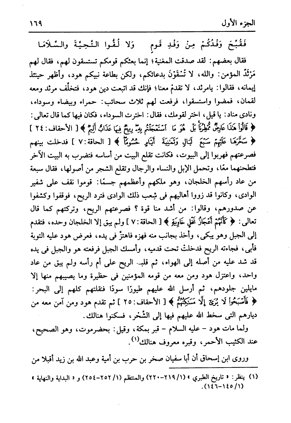 فَقَالَ بَعضهم لقد صدقت الْمُغنيَة إِنَّمَا بعثكم قومكم تستسقون لَهُم فَقَالَ لَهُم مرْثَد الْمُؤمن وَالله لَا تَقول بدعائكم وَلَكِن بِطَاعَة نَبِيكُم هود وَأظْهر حِينَئِذٍ إيمَانه فَقَالُوا يَا مرْثَد لَا تقدم مَعنا فَإنَّك قد اتبعت دين هود فَتخلف مرْثَد وَمَعَهُ لُقْمَان فَمَضَوْا واستسقوا فَرفعت لَهُم ثَلَاث سحائب حَمْرَاء وبيضاء وسوداء ونادى مُنَاد يَا قيل اختر لقَوْمك فَقَالَ اخْتَرْت السَّوْدَاء فَكَانَ فِيهَا كَمَا قَالَ تَعَالَى {قَالُواْ هَذَا عَارِضٌ مُّمْطِرُنَا بَلْ هُوَ مَا اسْتَعْجَلْتُم بِهِ رِيحٌ فِيهَا عَذَابٌ أَلِيمٌ} الْأَحْقَاف 24 {سَخَّرَهَا عَلَيْهِمْ سَبْعَ لَيَال وَثَمَانِية أَيَّامٍ حُسُوماً} الحاقة 7 فَدخلت بَينهم فصرعتهم فَهَرَبُوا إِلَى الْبيُوت فَكَانَت تلقع الْبَيْت من أساسه فَتضْرب بِهِ الْبَيْت الآخر فتطحنهما مَعًا وَتحمل الْإِبِل وَالنِّسَاء وَالرِّجَال وتقلع الشّجر من أُصُولهَا فَقَالَ سَبْعَة من عَاد رَأْسهمْ الخلجان وَهُوَ ملكهم وأعظمهم جسماً قومُوا نقف على شَفير الْوَادي وَكَانُوا قد زووا أَهَالِيهمْ فِي شعب ذَلِك الْوَادي فَترد الرّيح فوقفوا وكشفوا عَن صُدُورهمْ وَقَالُوا من أَشد منا قُوَّة فصرعتهم الرّيح وتركتهم كَمَا قَالَ تَعَالَى {كَأَنَّهُمْ أَعْجَازُ نَخْلٍ خَاوِيَةٍ} الحاقة 7 وَلم يبْق إِلَى الخلجان وَحده فَتقدم إِلَى الْجَبَل وَهُوَ يبكي وَأخذ بِجَانِب مِنْهُ فهزه فاهتز فِي يَده فَعرض هود عَلَيْهِ التَّوْبَة فَأبى فَجَاءَتْهُ الرّيح فَدخلت تَحت قَدَمَيْهِ وَأمْسك بِالْجَبَلِ فَرَفَعته هُوَ والجبل فِي يَده قد شدّ عَلَيْهِ من أَصله إِلَى الْهَوَاء ثمَّ قلبه الرّيح على أم رَأسه وَلم يبْق من عَاد وَاحِد وَاعْتَزل هود وَمن مَعَه قومه الْمُؤمنِينَ فِي حَظِيرَة وَمَا يصيبهم مِنْهَا إِلَّا مَا يلين جُلُودهمْ ثمَّ أرسل الله عَلَيْهِم طيوراً سُودًا فنقلتهم كلهم إِلَى الْبَحْر {فَأَصْبحُوا لَا يرى إِلَّا مساكنهم} الْأَحْقَاف 25 ثمَّ تقدم هود وَمن آمن مَعَه من دِيَارهمْ الَّتِي سخط الله عَلَيْهِم فِيهَا إِلَى الشحر فسكنوا هُنَالك وَلما مَاتَ هود عَلَيْهِ السَّلَام قبر بِمَكَّة وَقيل بحضرموت وَهُوَ الصَّحِيح عِنْد الْكَثِيب الْأَحْمَر وقبره مَعْرُوف هُنَالك وروى ابْن إِسْحَاق أَن أَبَا سُفْيَان صَخْر بن حَرْب بن أُميَّة وَعبد الله بن زيد أَقبلَا من