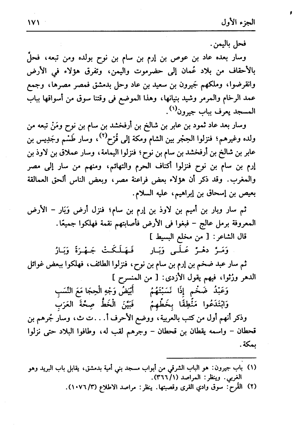 فَحل بِالْيمن وَسَار بعده عَاد بن عوص بن إرم بن سَام بن نوح بولده وَمن تبعه فَحل بالأحقاف من بِلَاد عمان إِلَى حَضرمَوْت واليمن وتفرق هَؤُلَاءِ فِي الأَرْض وانقرضوا وملكهم جيرون بن سعيد بن عَاد وَحل بِدِمَشْق فمصر مصرها وَجمع عمد الرخام والمرمر وشيد بنيانها وَهَذَا الْموضع فِي وقتنا سوق من أسواقها بِبَاب الْمَسْجِد يعرف بِبَاب جيرون وَسَار بعد عَاد ثَمُود بن عَابِر بن شالخ بن أرفخشد بن سَام بن نوح وَمن تبعه من وَلَده وَغَيرهم فنزلوا الْحجر بَين الشَّام وَمَكَّة إِلَى قرح وَسَار طسم وجديس بن عَابِر بن شالخ بن أرفخشد بن سَام بن نوح فنزلوا الْيَمَامَة وَسَار عملاق بن لاوذ بن إرم بن سَام بن نوح فنزلوا أكناف الْحرم والتهائم وَمِنْهُم من سَار إِلَى مصر وَالْمغْرب وَقد ذكر أَن هَؤُلَاءِ بعض فَرَاعِنَة مصر وَبَعض النَّاس ألحق العمالقة بعيص بن إِسْحَاق بن إِبْرَاهِيم عَلَيْهِ السَّلَام ثمَّ سَار وبار بن أميم بن لاوذ بن إرم بن سَام فَنزل أَرض وبار الأَرْض الْمَعْرُوفَة برمل عالج فبغوا فِي الأَرْض فَأَصَابَتْهُمْ نقمة فهلكوا جَمِيعًا قَالَ الشّعْر // (من مخلع الْبَسِيط) //