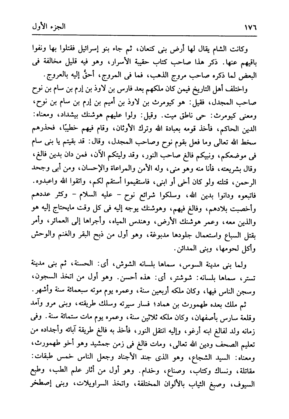 وَكَانَت الشَّام يُقَال لَهَا أَرض بني كنعان ثمَّ جَاءَ بَنو إِسْرَائِيل فَقتلُوا بهَا وَنَفَوْا باقيهم عَنْهَا ذكر هَذَا صَاحب كتاب حقيبة الْأَسْرَار وَهُوَ فِيهِ قَلِيل مُخَالفَة فِي الْبَعْض لما ذكره صَاحب مروج الذَّهَب فَمَا فِي المروج أَحَق إِلَيْهِ بالعروج وَاخْتلف أهل التَّارِيخ فِيمَن كَانَ ملكهم بعد فَارس بن لاوذ بن إرم بن سَام بن نوح صَاحب المجدل فَقيل هُوَ كيومرث بن لاوذ بن أميم بن إرم بن سَام بن نوح وَمعنى كيومرث حَيّ نَاطِق ميت وَقيل لوا عَلَيْهِم هوشنك بيشداد وَمَعْنَاهُ الدّين الْحَاكِم فَأخذ قومه بِعبَادة الله وَترك الْأَوْثَان وَقَامَ فيهم خَطِيبًا فَحَذَّرَهُمْ سخط الله تَعَالَى وَمَا فعل بِقوم نوح وَصَاحب المجدل وَقَالَ قد بَقِيتُمْ يَا بني سَام فِي موضعكم ونبيكم فالغ صَاحب النُّور وَقد وليتكُمْ الْآن فَمن دَان بدين فالغ وَقَالَ بِشَرِيعَتِهِ فَأَنا مِنْهُ وَهُوَ مني وَله الْأَمْن والمراعاة وَالْإِحْسَان وَمن أبي وَجحد الرَّحْمَن قتلته وَلَو كَانَ أخي أَو ابْني فاستقيموا أستقم لكم وَاتَّقوا الله واعبدوه فَاتَّبعُوهُ ودانوا بدين الله وسلكوا شرائع نوح عَلَيْهِ السَّلَام وَكثر عَددهمْ وأخصبت بِلَادهمْ وفالغ فيهم وهوشنك يُوَجه إِلَيْهِ فِي كل وَقت مَا يحْتَاج إِلَيْهِ هُوَ وَالَّذين مَعَه وَعمر هوشنك الأَرْض وهندس الْمِيَاه وأجراها إِلَى العمائر وَأمر بقتل السبَاع وَاسْتِعْمَال جلودها مدبوغة وَهُوَ أول من ذبح الْبَقر وَالْغنم والوحش وَأكل لحومها وَبنى الْمَدَائِن وَلما بنى مَدِينَة السوس سَمَّاهَا بِلِسَانِهِ الشوش أَي الْحَسَنَة ثمَّ بنى مَدِينَة تستر سَمَّاهَا بِلِسَانِهِ شوشتر أَي هَذِه أحسن وَهُوَ أول من اتخذ السجون وسجن النَّاس فِيهَا وَكَانَ ملكه أَرْبَعِينَ سنة وعمره يَوْم مَوته سَبْعمِائة سنة واشهر ثمَّ ملك بعد طهمورث بن هماد فَسَار سيرته وسلك طَرِيقَته وَبنى مرو وآمد وقلعة سارس بأصفهان وَكَانَ ملكه ثَلَاثِينَ سنة وعمره يَوْم مَاتَ سِتّمائَة سنة وَفِي زَمَانه ولد لفالغ ابْنه أرغو وَإِلَيْهِ انْتقل النُّور فَأخذ بِهِ فالغ طَريقَة آبَائِهِ وأجداده من تَعْلِيم الصُّحُف وَدين الله تَعَالَى وَمَات فالغ فِي زمن جمشيد وَهُوَ أَخُو طهمورث وَمَعْنَاهُ السَّيِّد الشجاع وَهُوَ الَّذِي جند الأجناد وَجعل النَّاس خمس طَبَقَات مقاتلة ونساك وَكتب وصناع وخدام وَهُوَ أول من أثار علم الطِّبّ وطبع السيوف وصبغ الثِّيَاب بالألوان الْمُخْتَلفَة وَاتخذ السراويلات وَبنى إصطخر