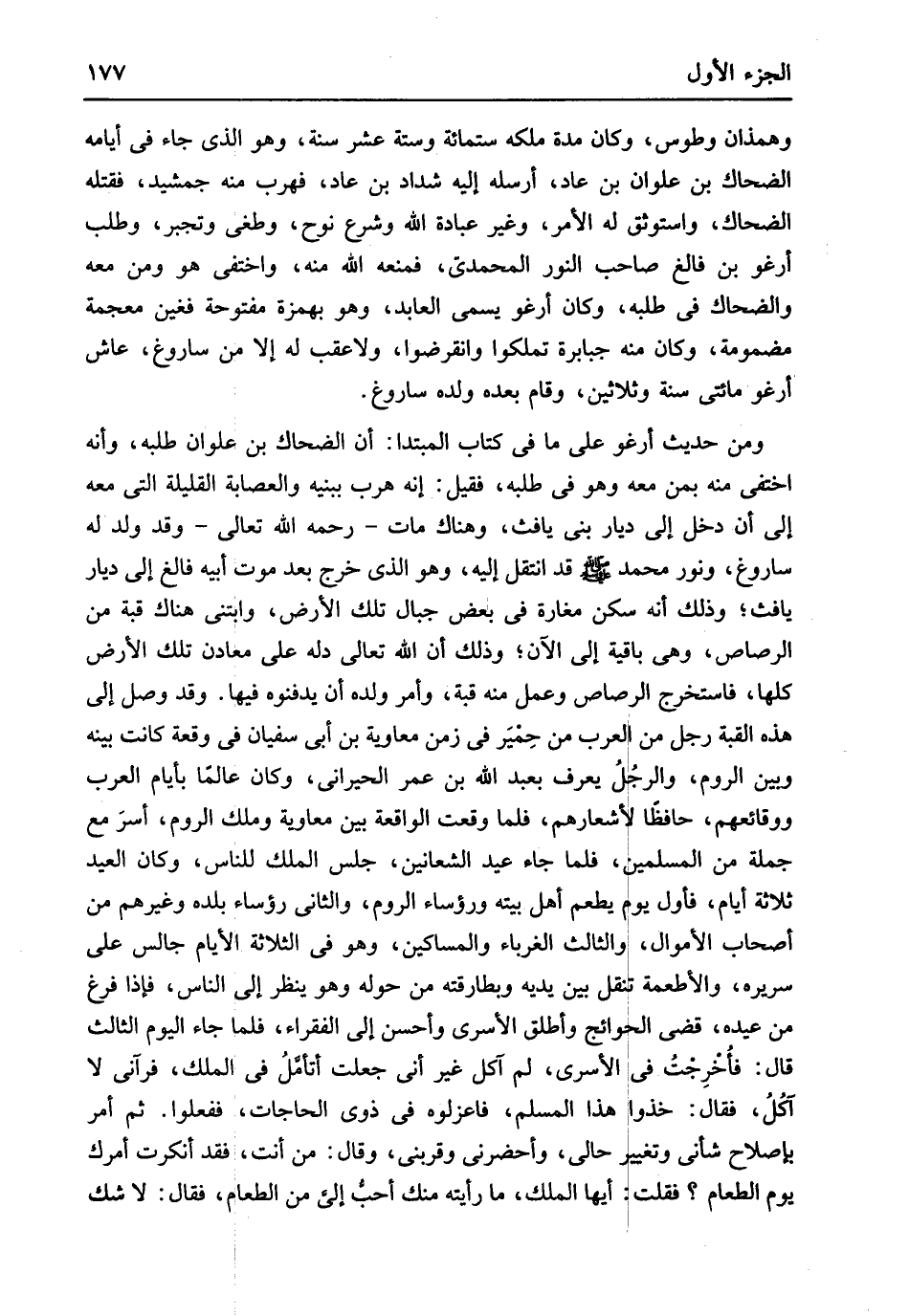 قد انْتقل إِلَيْهِ وَهُوَ الَّذِي خرج بعد موت أَبِيه فالغ إِلَى ديار يافث وَذَلِكَ أَنه سكن مغارة فِي بعض جبال تِلْكَ الأَرْض وابتنى هُنَاكَ قبَّة من الرصاص وَهِي بَاقِيَة إِلَى الْآن وَذَلِكَ أَن الله تَعَالَى دله على معادن تِلْكَ الأَرْض كلهَا فاستخرج الرصاص وَعمل مِنْهُ قبَّة وَأمر وَلَده أَن يدفنوه فِيهَا وَقد وصل إِلَى هَذِه الْقبَّة رجل من الْعَرَب من حمير فِي زمن مُعَاوِيَة بن أبي سُفْيَان فِي وقْعَة كَانَت بَينه وَبَين الرّوم وَالرجل يعرف بِعَبْد الله بن عمر الحيراني وَكَانَ عَالما بأيام الْعَرَب ووقائعهم حَافِظًا لأشعارهم فَلَمَّا وَقعت الْوَاقِعَة بَين مُعَاوِيَة وَملك الرّوم أسر مَعَ جملَة من الْمُسلمين فَلَمَّا جَاءَ عيد الشعانين جلس الْملك للنَّاس وَكَانَ اليعد ثَلَاثَة أَيَّام فَأول يَوْم يطعم أهل بَيته ورؤساء الرّوم وَالثَّانِي رُؤَسَاء بَلَده وَغَيرهم من أَصْحَاب الْأَمْوَال وَالثَّالِث الغرباء وَالْمَسَاكِين وَهُوَ فِي الثَّلَاثَة الْأَيَّام جَالس على سَرِيره والأطعمة تنقل بَين يَدَيْهِ وبطارقته من حوله وَهُوَ ينظر إِلَى النَّاس فَإِذا فرغ من عيده قضى الْحَوَائِج وَأطلق الأسرى وَأحسن إِلَى الْفُقَرَاء فَلَمَّا جَاءَ الْيَوْم الثَّالِث قَالَ فأخرجت فِي الأسرى لم آكل غير أَنِّي جعلت أتأمل فِي الْملك فرآني لَا أكل فَقَالَ خُذُوا هَذَا الْمُسلم فاعزلوه فِي ذَوي الْحَاجَات فَفَعَلُوا ثمَّ أَمر بإصلاح شأني وتغيير حَالي وأحضرني وقربني وَقَالَ من أَنْت فقد انكرك أَمرك يَوْم الطَّعَام فَقلت أَيهَا الْملك مَا رَأَيْته مِنْك أحب إِلَيّ من الطَّعَام فَقَالَ لَا شكّ