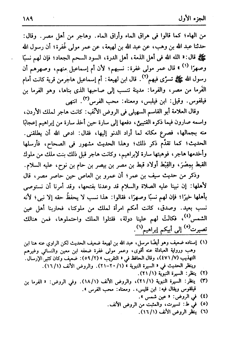 تسرى فيهم قَالَ ابْن لَهِيعَة أم إِسْمَاعِيل هَاجر من قَرْيَة كَانَت أَمَام الفرما من مصر والفرما مَدِينَة تنْسب إِلَى صَاحبهَا الَّذِي بناها وَهُوَ الفرما بن فيلفوس وَقيل ابْن فيلبس وَمَعْنَاهُ محب الْفرس انْتهى وَقَالَ الْعَلامَة أَبُو الْقَاسِم السُّهيْلي فِي الرَّوْض الْأنف كَانَت هَاجر لملك الْأُرْدُن واسْمه صارون فِيمَا ذكره القتيبي دَفعهَا إِلَى سارة حِين أَخذ سارة من إِبْرَاهِيم إعجاباً مِنْهُ بجمالها فصرع مَكَانَهُ لما أَرَادَ الدنو إِلَيْهَا فَقَالَ ادعِي الله أَن يُطلقنِي الحَدِيث كَمَا تقدم ذكر ذَلِك وَهَذَا الحَدِيث مَشْهُور فِي الصِّحَاح فأرسلها وأخدمها بهاجر فوهبتها سارة لإِبْرَاهِيم وَكَانَت هَاجر قبل ذَلِك بنت ملك من مُلُوك القبط بِمصْر والقبط أَوْلَاد قبط بن مصر بن بيصر بن حام بن نوح عَلَيْهِ السَّلَام وَذكر من حَدِيث سيف بن عمر أَن عَمْرو بن الْعَاصِ حِين حاصر مصر قَالَ لأَهْلهَا إِن نَبينَا عَلَيْهِ الصَّلَاة وَالسَّلَام قد وعدنا بِفَتْحِهَا وَقد أمرنَا أَن نستوصي بِأَهْلِهَا خيرا فَإِن لَهُم نسبا وصهرا فَقَالُوا هَذَا انسب لَا يحفظ حَقه إِلَّا نَبِي لِأَنَّهُ نسب بعيد وَصدق كَانَت أمكُم امْرَأَة لملك من مُلُوكنَا فحاربنا أهل عين الشَّمْس فَكَانَت لَهُم علينا دولة فَقتلُوا الْملك واحتملوها فَمن هُنَالك تصيرت إِلَى أبيكم إِبْرَاهِيم