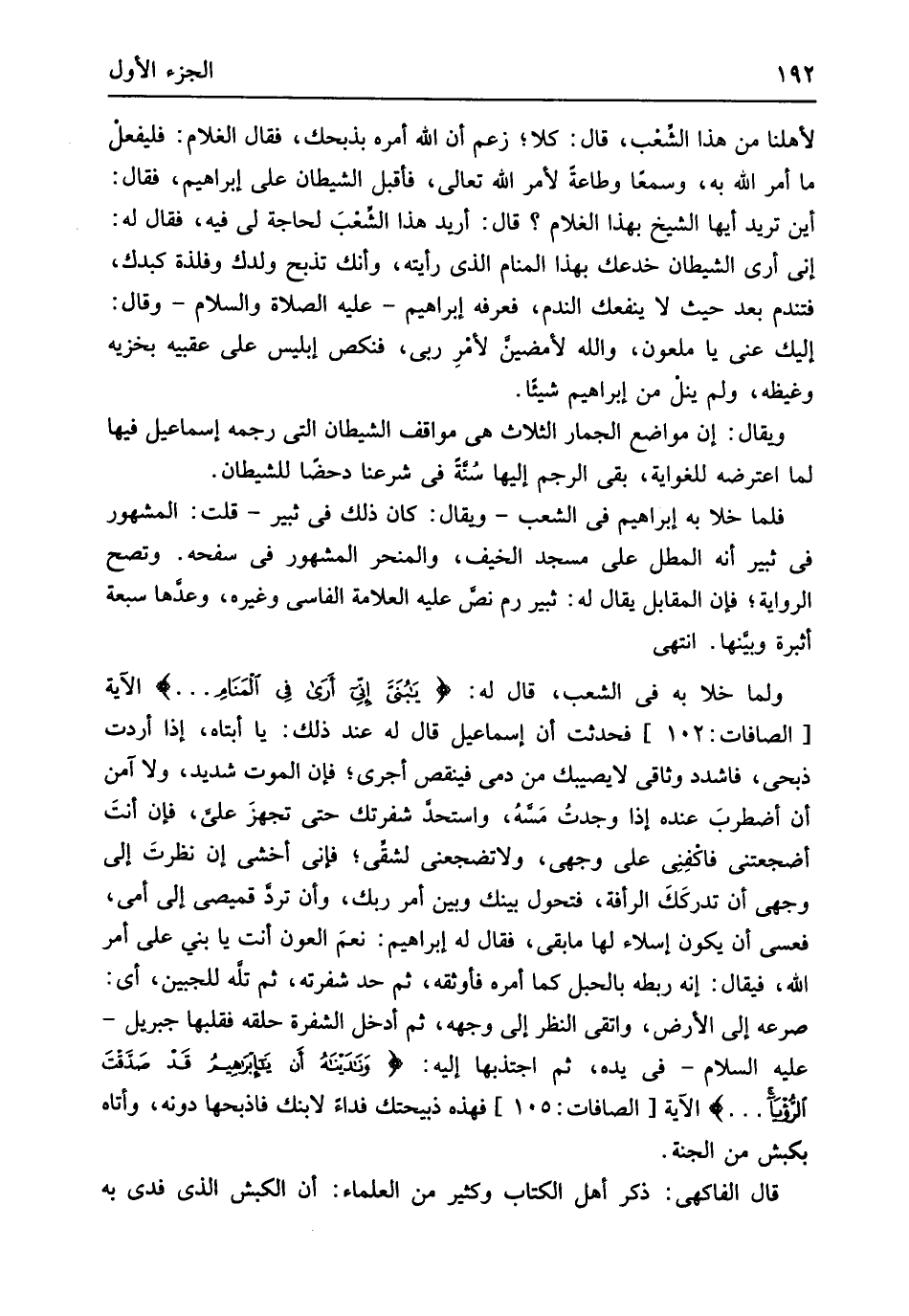 لأهلنا من هَذَا الشّعب قَالَ كلا زعم أَن الله أمره بذبحك فَقَالَ الْغُلَام فَلْيفْعَل مَا أمره الله بِهِ وسمعاً وَطَاعَة لأمر الله تَعَالَى فَأقبل الشَّيْطَان على إِبْرَاهِيم فَقَالَ أَيْن تُرِيدُ أَيهَا الشَّيْخ بِهَذَا الْغُلَام قَالَ أُرِيد هَذَا الشّعب لحَاجَة لي فِيهِ فَقَالَ لَهُ إِنِّي أرى الشَّيْطَان خدعك بِهَذَا الْمَنَام الَّذِي رَأَيْته وَأَنَّك تذبح ولدك وفلذة كبدك فتندم بعد حَيْثُ لَا ينفعك النَّدَم فَعرفهُ إِبْرَاهِيم عَلَيْهِ الصَّلَاة وَالسَّلَام وَقَالَ إِلَيْك عني يَا مَلْعُون وَالله لأمضين لأمر رَبِّي فنكص إِبْلِيس على عَقِبَيْهِ بخزيه وغيظه وَلم ينل من إِبْرَاهِيم شَيْئا وَيُقَال إِن مَوَاضِع الْجمار الثَّلَاث هِيَ مَوَاقِف الشَّيْطَان الَّتِي رجمه إِسْمَاعِيل فِيهَا لما اعْتَرَضَهُ للغواية بَقِي الرَّجْم إِلَيْهَا سنة فِي شرعنا دحضاً للشَّيْطَان فَلَمَّا خلا بِهِ إِبْرَاهِيم فِي الشّعب وَيُقَال كَانَ ذَلِك فِي ثبير قلت الْمَشْهُور فِي ثبير أَنه المطل على مَسْجِد الْخيف والمنحر الْمَشْهُور فِي سفحه وَتَصِح الرِّوَايَة فَإِن الْمُقَابل يُقَال لَهُ ثبير رم نَص عَلَيْهِ الْعَلامَة الفاسي وَغَيره وعدها سَبْعَة أثبرة وَبَينهَا انْتهى وَلما خلا بِهِ فِي الشّعب قَالَ لَهُ {يَا بني إِنّي أَرَى فِي الْمَنَامِ} الْآيَة الصافات 102 فَحدثت أَن إِسْمَاعِيل قَالَ لَهُ عِنْد ذَلِك يَا أبتاه إِذا أردْت ذبحي فاشدد وثاقي لَا يصيبك من دمي فينقص أجري فَإِن الْمَوْت شَدِيد وَلَا آمن أَن أَضْطَرِب عِنْده إِذا وجدت مَسّه واستحد شفرتك حَتَّى تجهز عَليّ فَإِن أَنْت أضجعتني فَاكْفِنِي على وَجْهي وَلَا تضجعني لشقي فَإِنِّي أخْشَى إِن نظرت إِلَى وَجْهي أَن تدركك الرأفة فتحول بَيْنك وَبَين أَمر رَبك وَأَن ترد قَمِيصِي إِلَى أُمِّي فَعَسَى أَن يكون إسلاء لَهَا مَا بَقِي فَقَالَ لَهُ إِبْرَاهِيم نعم العون أَنْت يَا بني على أَمر الله فَيُقَال إِنَّه ربطه بالحبل كَمَا أمره فأوثقه ثمَّ حد شفرته ثمَّ تله للجبين أَي صرعه إِلَى الأَرْض وَاتَّقَى النّظر إِلَى وَجهه ثمَّ أَدخل الشَّفْرَة حلقه فقبلها جِبْرِيل عَلَيْهِ السَّلَام فِي يَده ثمَّ اجتذبها إِلَيْهِ {وناديته أَن يَا إِبْرَاهِيم قَدْ صَدَّقْتَ الرُّؤْيَا} الْآيَة الصافات 105 فَهَذِهِ ذبيحتك فدَاء لابنك فاذبحها دونه وَأَتَاهُ بكبش من الْجنَّة قَالَ العاكهي ذكر أهل الْكتاب وَكثير من الْعلمَاء أَن الْكَبْش الَّذِي فدى بِهِ
