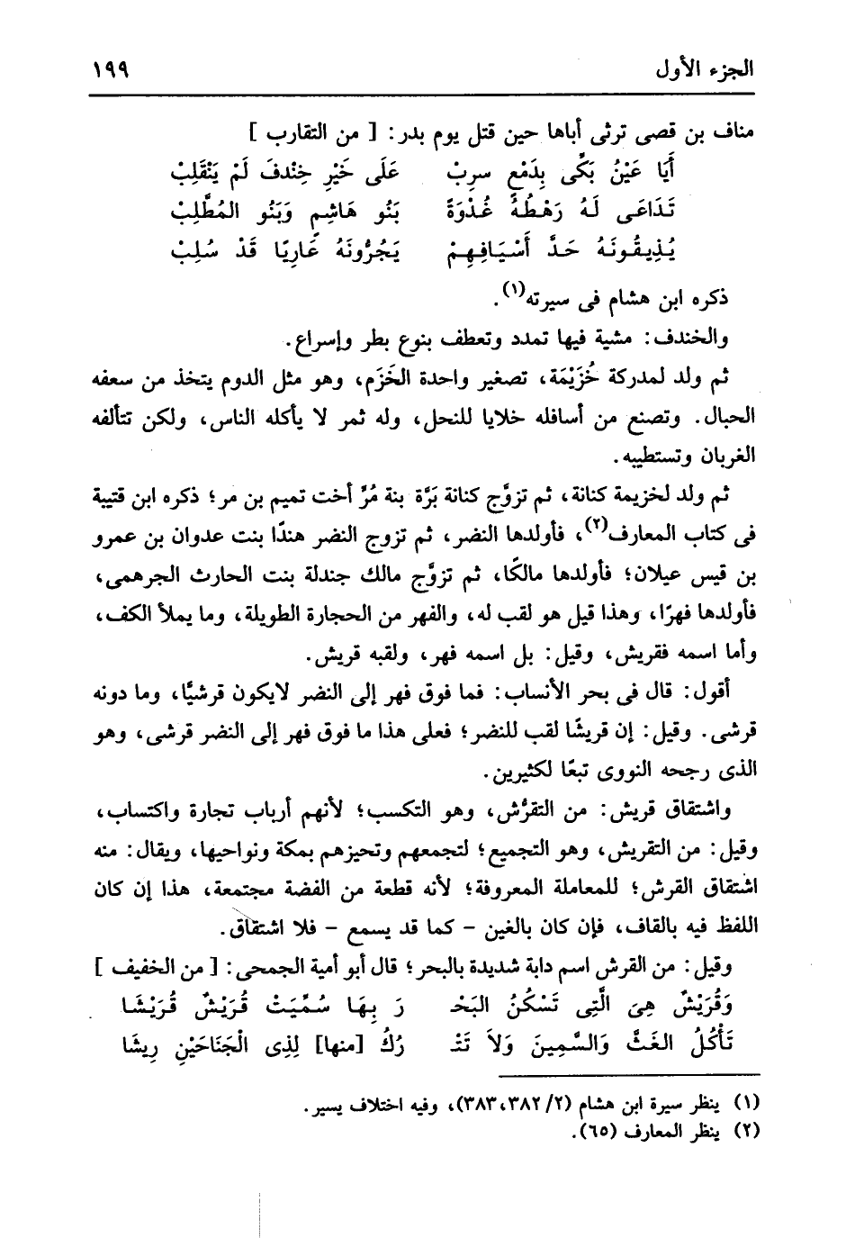 ذكره ابْن هِشَام فِي سيرته والخندف مشْيَة فِيهَا تممد وَتعطف بِنَوْع بطر وإسراع ثمَّ ولد لمدركة خُزَيْمَة تَصْغِير وَاحِدَة الخزم وَهُوَ مثل الدوم يتَّخذ من سعفه الحبال وتصنع من أسافله خلايا للنحل وَله ثَمَر لَا يَأْكُلهُ النَّاس وَلَكِن تتأنفه الْغرْبَان وتستطيبه ثمَّ ولد لخزينة كنَانَة ثمَّ تزوج كنَانَة برة بنة مر أُخْت تَمِيم بن مر ذكره ابْن قتية فِي كتاب المعارف فأولدها النَّضر ثمَّ تزوج النَّضر هنداً بنت عدوان بن عَمْرو بن قيس عيلان فأولدها مَالِكًا ثمَّ تزوج مَالك جندلة بنت الْحَارِث الجرهمي فأولدها فهرا وَهَذَا قيل هُوَ لقب لَهُ والفهر من الْحِجَارَة الطَّوِيلَة وَمَا يمْلَأ الْكَفّ وَأما اسْمه فقريش وَقيل بل اسْمه فهر ولقبه قُرَيْش أَقُول قَالَ فِي بَحر الْأَنْسَاب فَمَا فَوق فهر إِلَى النَّضر لَا يكون قرشياً وَمَا دونه قرشي وَقيل إِن قُريْشًا لقب للنضر فعلى هَذَا مَا فَوق فهر إِلَى النَّضر قرشي وَهُوَ الَّذِي رَجحه النَّوَوِيّ تبعا لكثيرين واشتقاق قُرَيْش من التقرش وَهُوَ التكسب لأَنهم أَرْبَاب تِجَارَة واكتساب وَقيل من التقريش وَهُوَ التجميع لتجمعهم وتحيزهم بِمَكَّة ونواحيها وَيُقَال مِنْهُ اشتاق القرش للمعاملة الْمَعْرُوفَة لِأَنَّهُ قِطْعَة من الْفضة مجتمعة هَذَا إِن كَانَ اللَّفْظ فِيهِ بِالْقَافِ فَإِن كَانَ بالغين كَمَا قد يسمع فَلَا اشتقاق وَقيل من القرش اسْم دَابَّة شَدِيدَة بالبحر قَالَ أَبُو أُميَّة الجُمَحِي // (من الْخَفِيف) //
