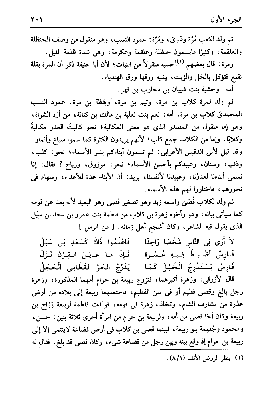 ثمَّ ولد لكعب مرّة وعدية وَمرَّة عَمُود النّسَب وَهُوَ مَنْقُول من وصف الحنظلة والعلقمة وَكَثِيرًا مَا يسمون حَنْظَلَة وعلقمة وَعِكْرِمَة وَهِي شدَّة ظلمَة اللَّيْل وَمرَّة قَالَ بَعضهم أَحْسبهُ مَنْقُولًا من النَّبَات لِأَن أَبَا حنيفَة ذكر أَن الْمرة بقلة تقلع فتؤكل بالخل وَالزَّيْت يشبه وَرقهَا ورق الهندباء أمه وحشية بنت شَيبَان بن محَارب بن فهر ثمَّ ولد لمرة كلاب بن مرّة وتيم بن مرّة ويقظة بن مرّة عَمُود النّسَب المحمدي كلاب بن مرّة أمه نعم بنت ثَعْلَبَة بن مَالك بن كنَانَة من أَزْد الشراة وَهُوَ إِمَّا مَنْقُول من الْمصدر الَّذِي هُوَ معنى المكالبة نَحْو كالبت الْعَدو مُكَالَبَة وكلاباً وَإِمَّا من الْكلاب جمع كلب لأَنهم يُرِيدُونَ الْكَثْرَة كَمَا سموا سِبَاع وأنمار وَقد قيل لأبي الدقيس الْأَعرَابِي لم تسمون أبناءكم بشر الْأَسْمَاء نَحْو كلب وذئب وَسنَان وعبيدكم بِأَحْسَن الْأَسْمَاء نَحْو مَرْزُوق ورباح فَقَالَ إِنَّا نسمي أبناءنا لعدونا وعبيدنا لأنفسنا يُرِيد أَن الْأَبْنَاء عدَّة للأعداء وسهام فِي نحورهم فَاخْتَارُوا لَهُم هَذِه الْأَسْمَاء ثمَّ ولد لكلاب قصي واسْمه زيد وَهُوَ تَصْغِير قصى وَهُوَ الْبعيد لِأَنَّهُ بعد عَن قومه كَمَا سَيَأْتِي بَيَانه وَهُوَ وَأَخُوهُ زهرَة بن كلاب من فَاطِمَة بنت عَمْرو بن سعد بن سبل الَّذِي يَقُول فِيهِ الشَّاعِر وَكَانَ أَشْجَع أهل زَمَانه // (من الرمل) //
