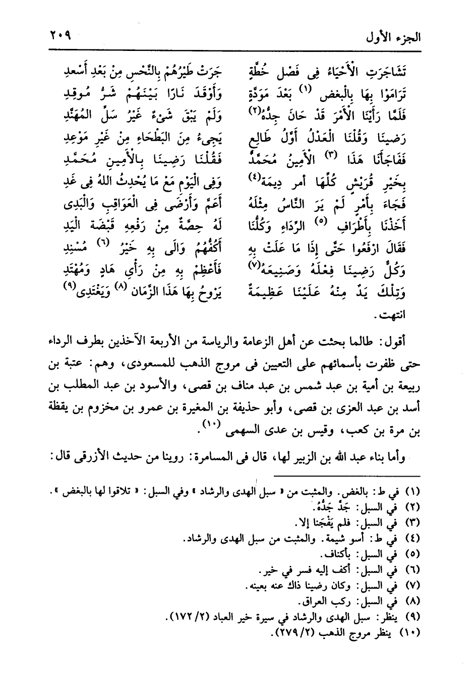 انْتَهَت أَقُول طالما بحثت عَن أهل الزعامة والرياسة من الْأَرْبَعَة الآخذين بِطرف الرِّدَاء حَتَّى ظَفرت بِأَسْمَائِهِمْ على التَّعْيِين فِي مروج الذَّهَب للمسعودي وهم عتبَة بن ربيعَة بن أُميَّة بن عبد شمس بن عبد منَاف بن قصي وَالْأسود بن عبد الْمطلب بن أَسد بن عبد الْعُزَّى بن قصي وَأَبُو حُذَيْفَة بن الْمُغيرَة بن عَمْرو بن مَخْزُوم بن يقظة بن مرّة بن كَعْب وَقيس بن عدي السَّهْمِي وَأما بِنَاء عبد الله بن الزبير لَهَا قَالَ فِي المسامرة روينَا من حَدِيث الْأَزْرَقِيّ قَالَ