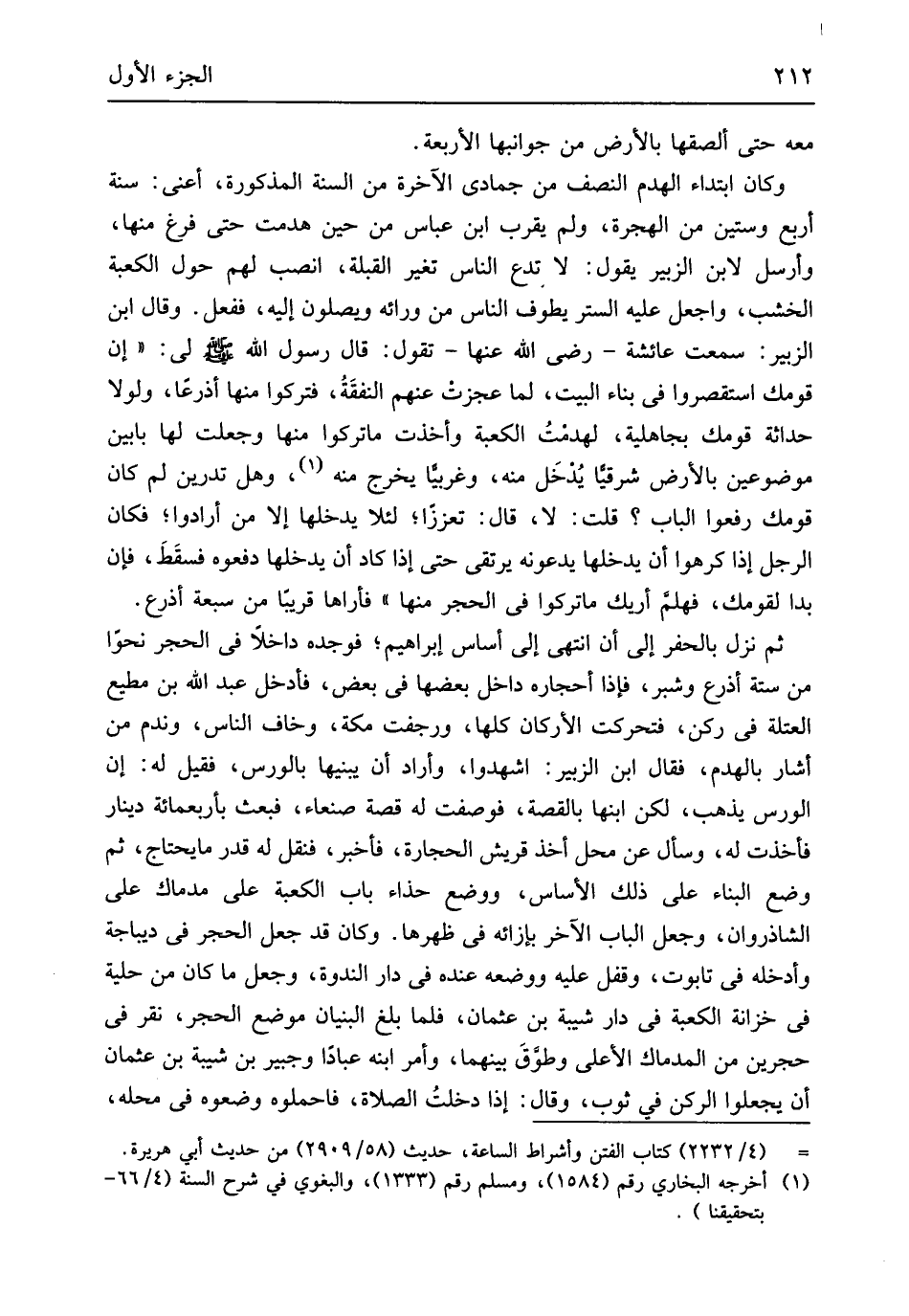 مَعَه حَتَّى ألصقها بِالْأَرْضِ من جوانبها الْأَرْبَعَة وَكَانَ ابْتِدَاء الْهدم النّصْف من جمادي الْآخِرَة من السّنة الْمَذْكُورَة أَعنِي سنة أَربع وَسِتِّينَ من الْهِجْرَة وَلم يقرب ابْن عَبَّاس من حِين هدمت حَتَّى فرغ مِنْهَا وَأرْسل لِأَبْنِ الزبير يَقُول لَا تدع النَّاس تغير الْقبْلَة انصب لَهُم حول الْكَعْبَة الْخشب وَاجعَل عَلَيْهِ السّتْر يطوف النَّاس من وَرَائه وَيصلونَ إِلَيْهِ فَفعل وَقَالَ ابْن الزبير سَمِعت عَائِشَة رَضِي الله عَنْهَا تَقول قَالَ رَسُول الله